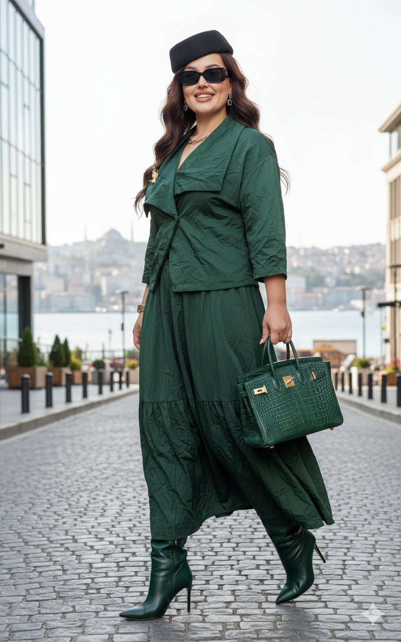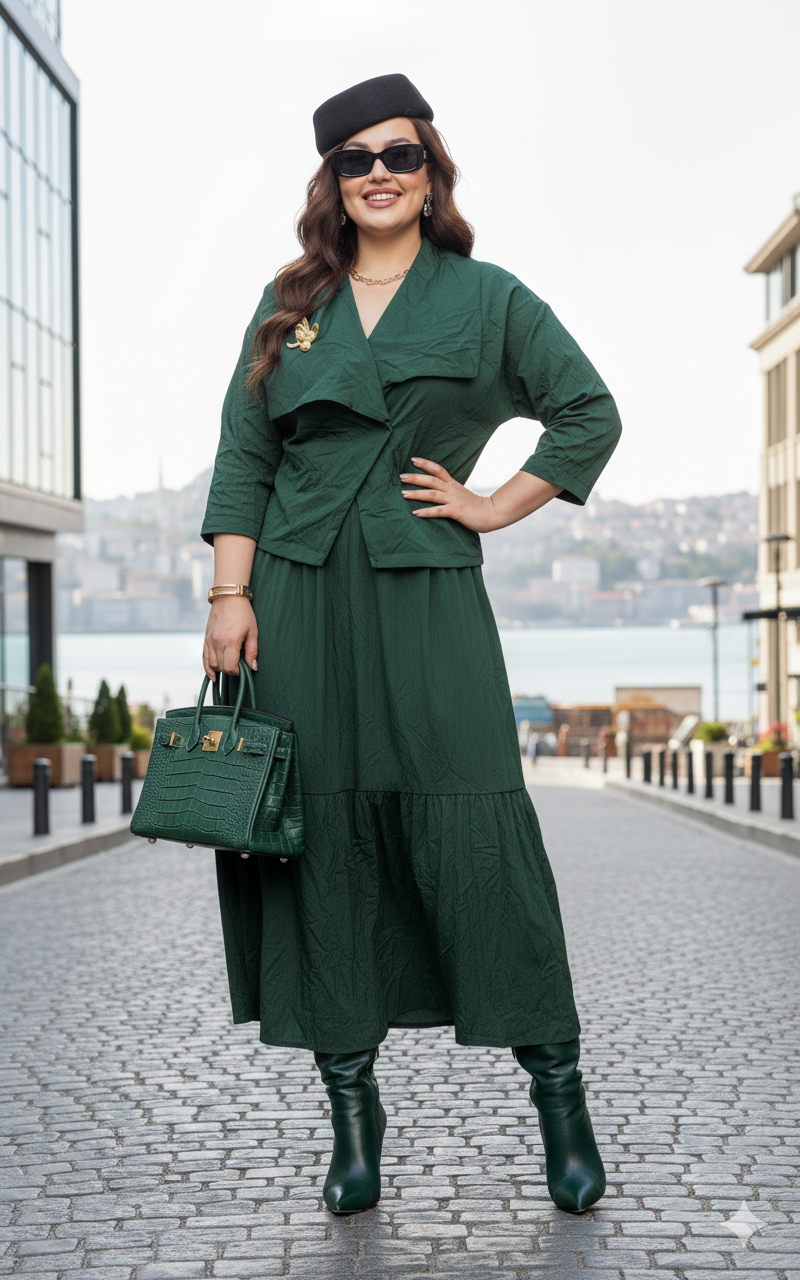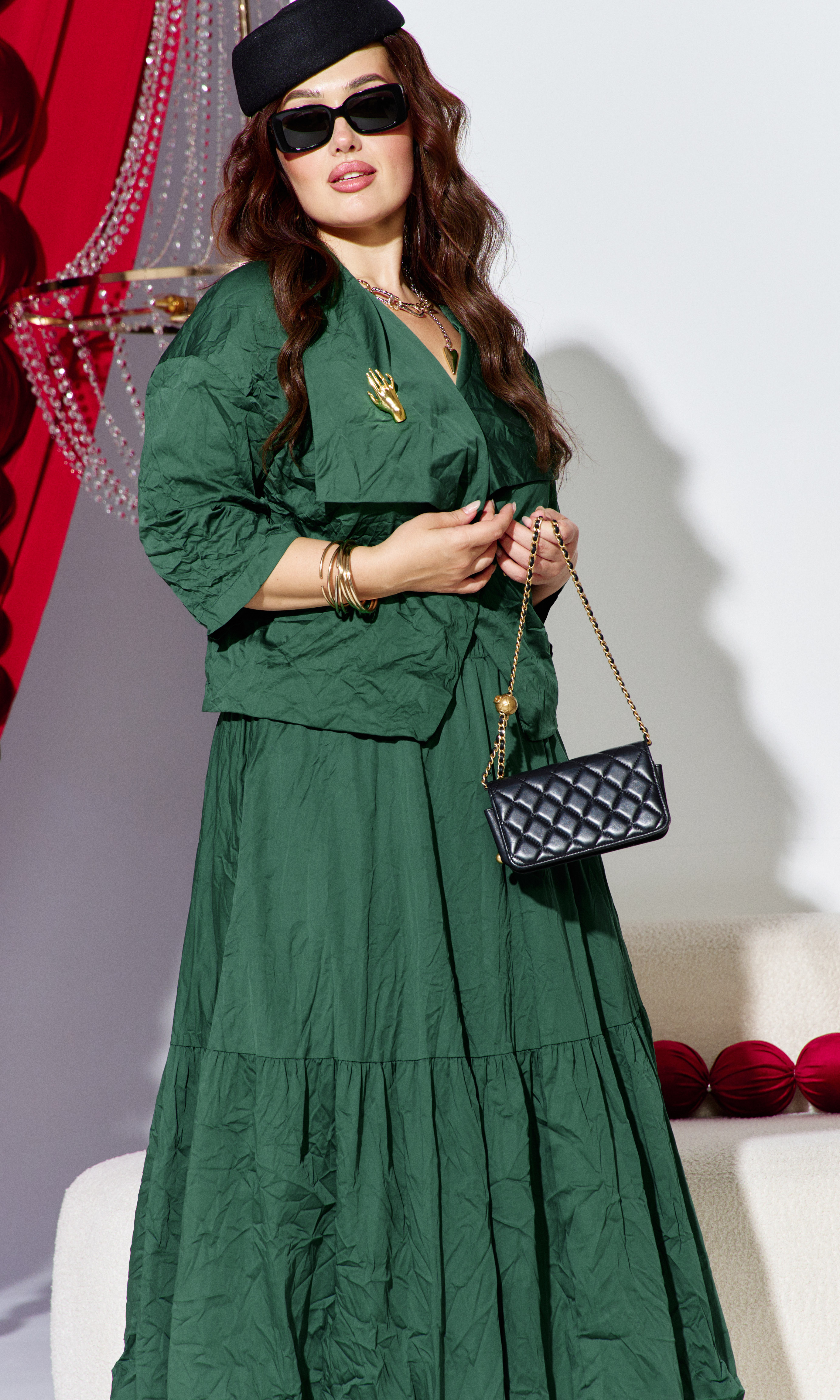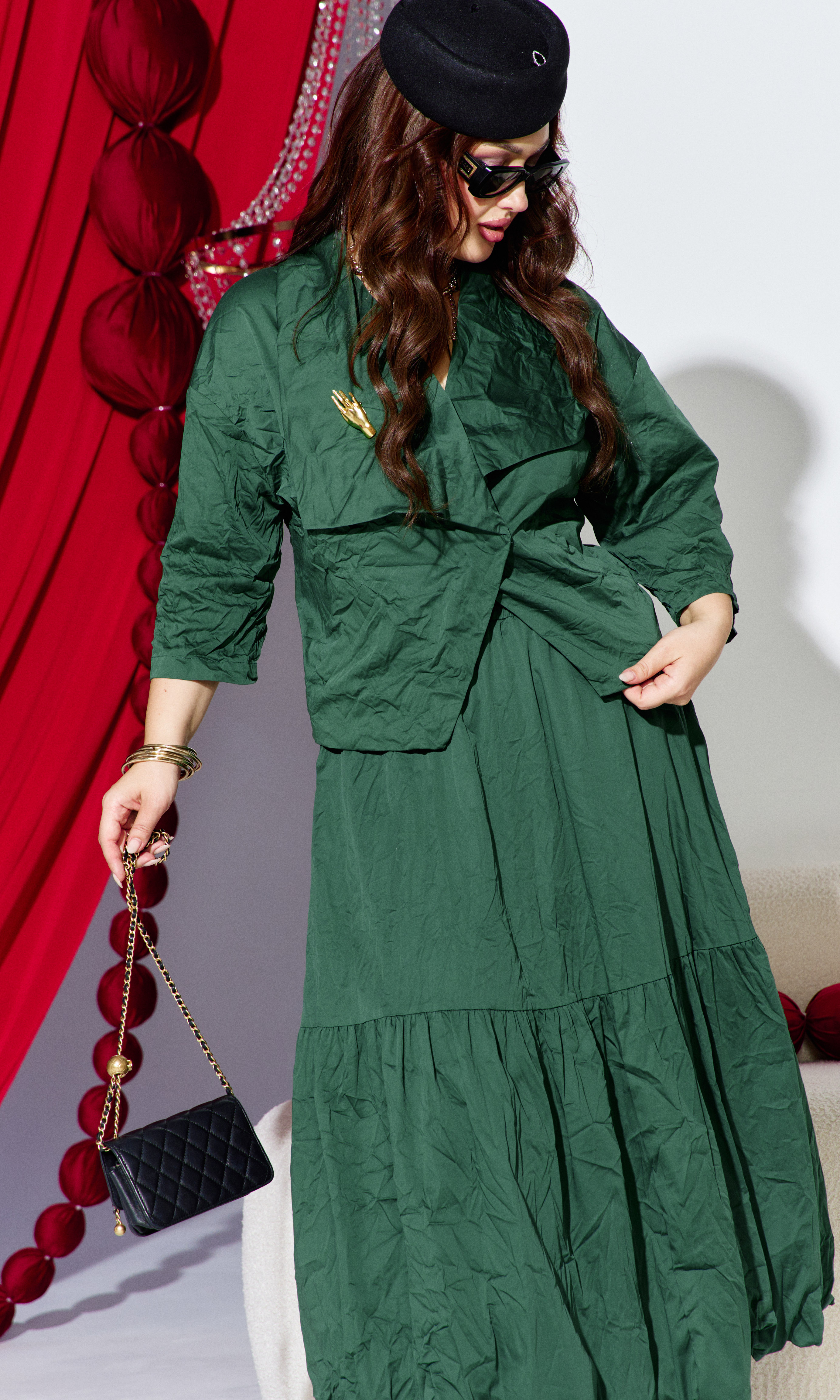 Состав: 69% хлопок, 26% нейлон, 5% спандекс, подкладка 100% полиэстер. Костюм женский, двух предметный, состоящий из жакета и юбки. Этот костюм — резкий, звонкий, запоминающийся. Он для женщины, которая не просит внимания — она его берет. Костюм яркого цвета стал настоящим воплощением отличного настроения и игривости. Ассиметричные линии костюма создают уникальный акцент, а эффект «мятости» придаёт образу нотку неожиданности и оригинальности. Это сочетание гармонии и неповторимости — идеальный выбор! Жакет свободного силуэта с ассиметричной линией борта, с двубортной застёжкой на потайные кнопки. Воротник в жакете отложной, ассиметричный, с декоративно заложенной сладкой фиксирующейся декоративной брошью. По переду жакета декоративные листочки кармана. Спинка со средним швом. Линия плеча в жакете спущенная. Рукав втачной, длиной ¾. Юбка-баллон, трапециевидного силуэта с горизонтальным подрезом и сборкой. Пояс в юбке притачной с эластичной тесьмой-резинкой, что обеспечивает максимально удобную посадку на любой тип фигуры. В боковых швах юбки карманы. Юбка на подкладке. Обращаем Ваше внимание, что фурнитура может незначительно отличаться от фото. Длина жакета по спинке 56,5 см (р 52-56), 57,5 см (58-62). Длина юбки 83 см.