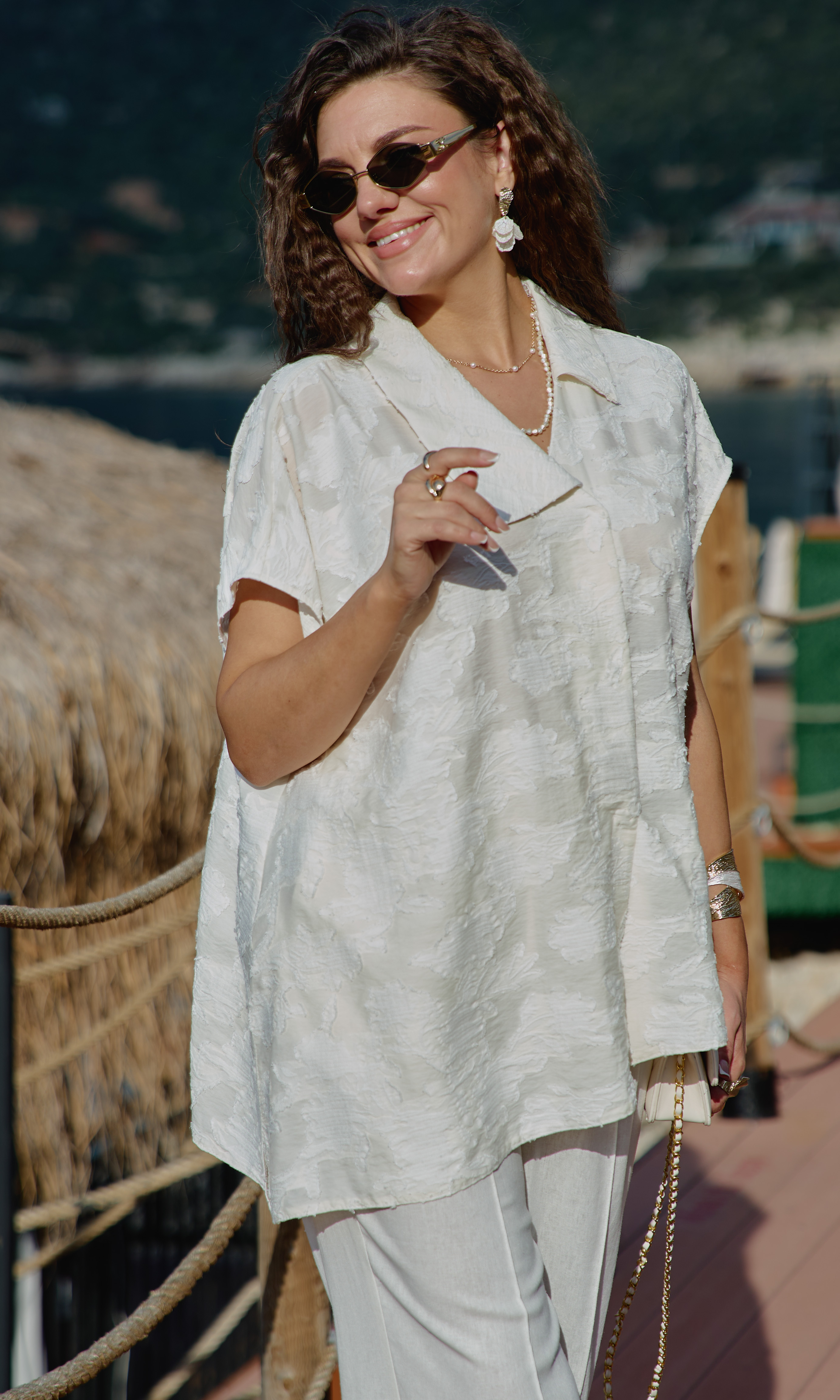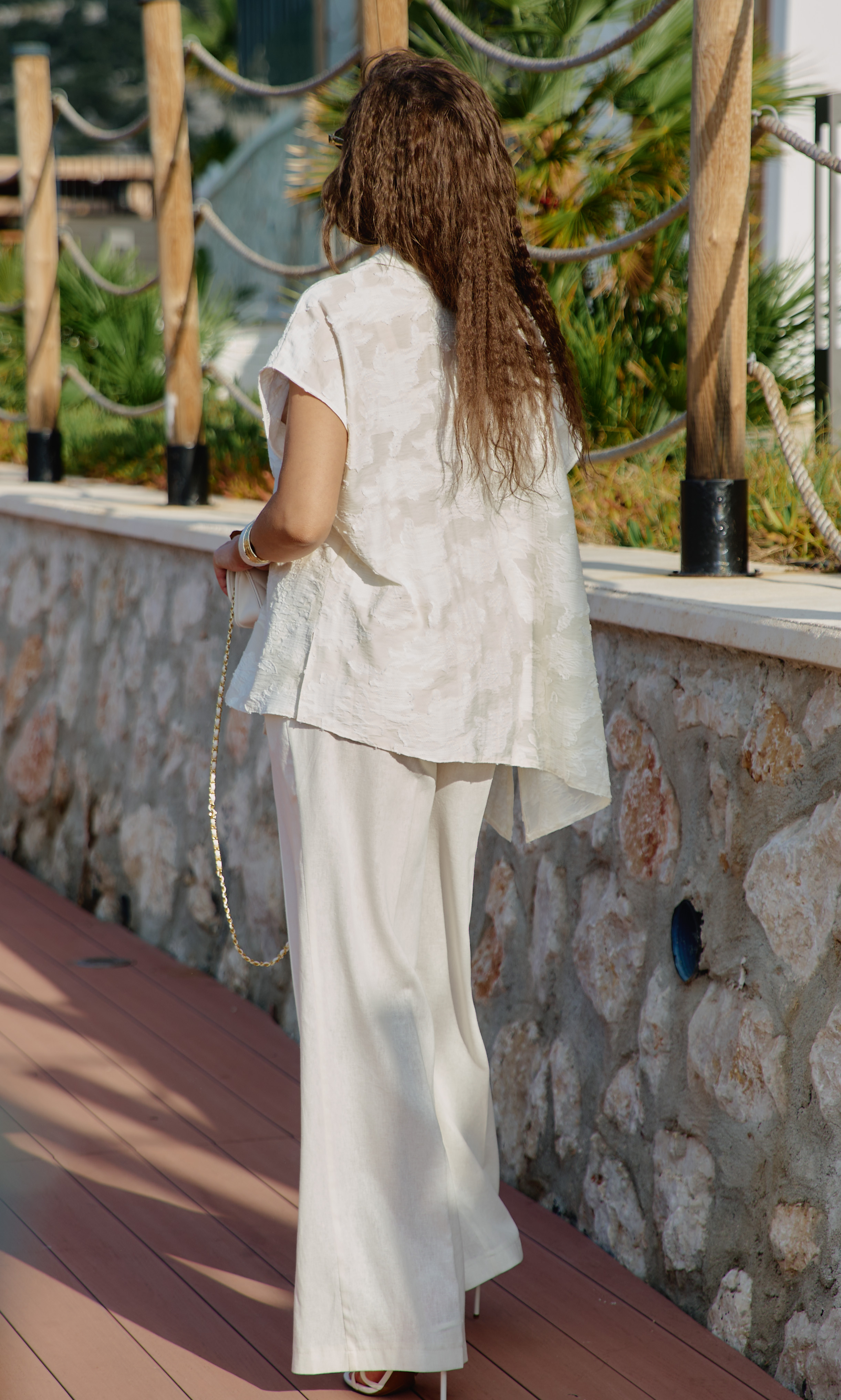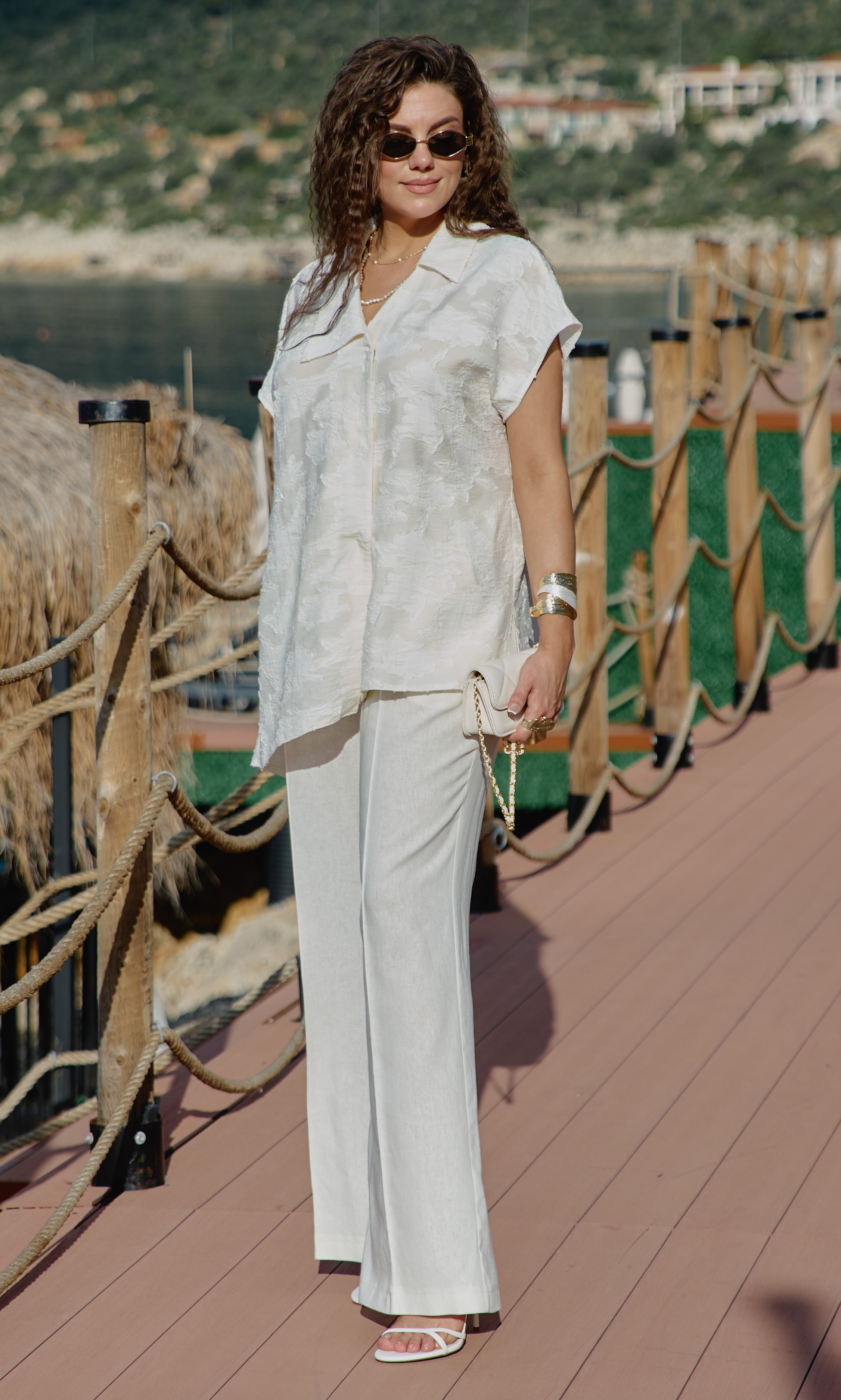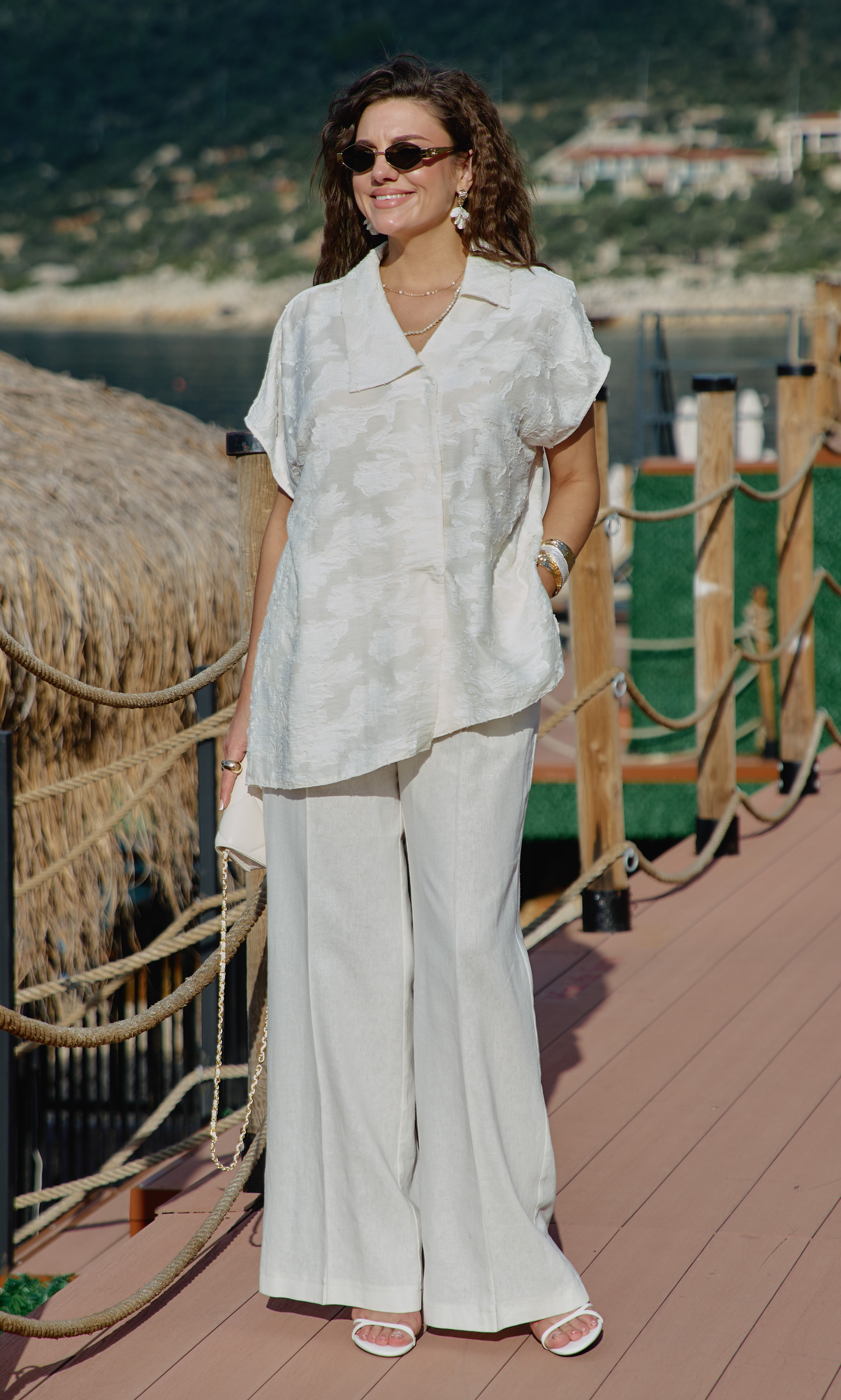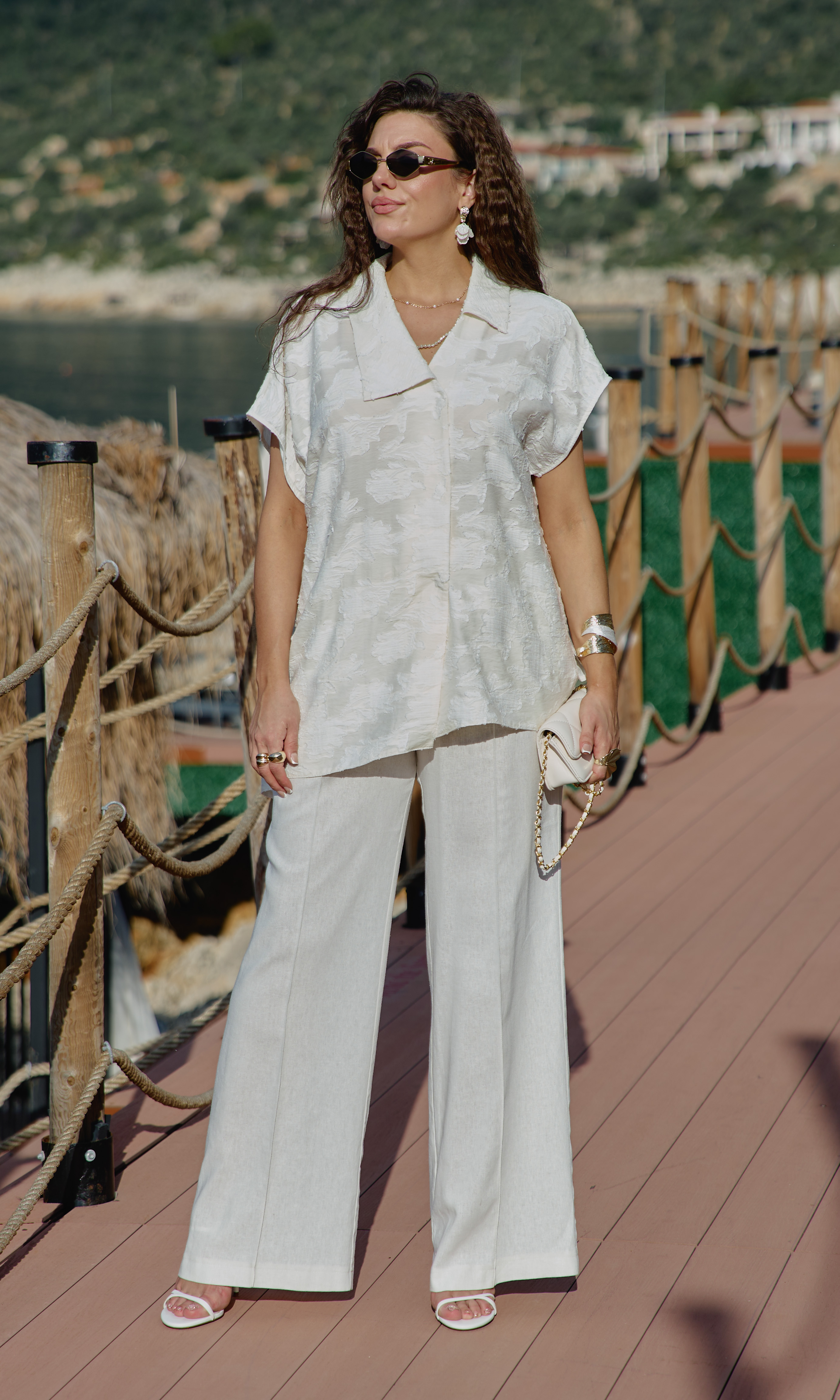 Состав: блузка 58% вискоза, 29% полиэстер, 13% полиамид, брюки 70% вискоза, 30% лен. Комплект женский, состоящий из блузки и брюк. Этот летний комплект — не просто одежда. Это настроение, состояние души, философия. Он говорит о том, что настоящая роскошь — в простоте, что красота — в деталях, что элегантность — это когда тебе комфортно в собственной коже. Он для тех, кто ценит тихий диалог между тканью и телом. Он напоминает, что лето — это не только яркие краски и кричащие принты, но и нежные полутона, тонкие текстуры, воздушные силуэты. Это гимн женственности, спокойной и уверенной. Особенностью данного комплекта является грамотное сочетание ткани с фактурным принтом и однотонных льняных брюк. Принт не бросается в глаза, а лишь намекает на свое присутствие, проявляясь при определенном освещении или движении, создавая игру света и тени. Блузка свободного силуэта с плавным V-образным вырезом горловины, отложным ассиметричным воротником. Линия борта в блузке немного смещена от центра с застёжкой на потайные кнопки. Рукав цельнокроеный, разной длины. Спинка без особенностей. Низ в блузке ассиметричный с разрезами в боковых швах. Брюки прямого силуэта с притачным поясом с эластичной тесьмой-резинкой, которая обеспечивает максимально удобную посадку на любой тип фигуры. В поясе брюк в качестве декоративного элемента шнур из основной ткани. По переду брюк прорезные карманы и застроченные канты, которые визуально вытягивают силуэт. Длина блузки 70 см, длина рукава 27/33 (р 52-56), 30/36 (р 58-62). Длина брюк 108 см.