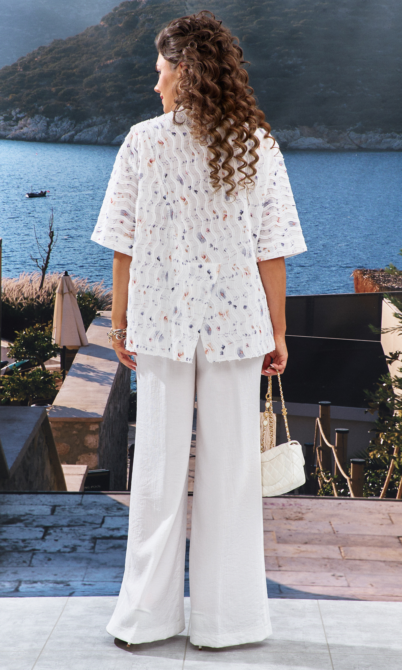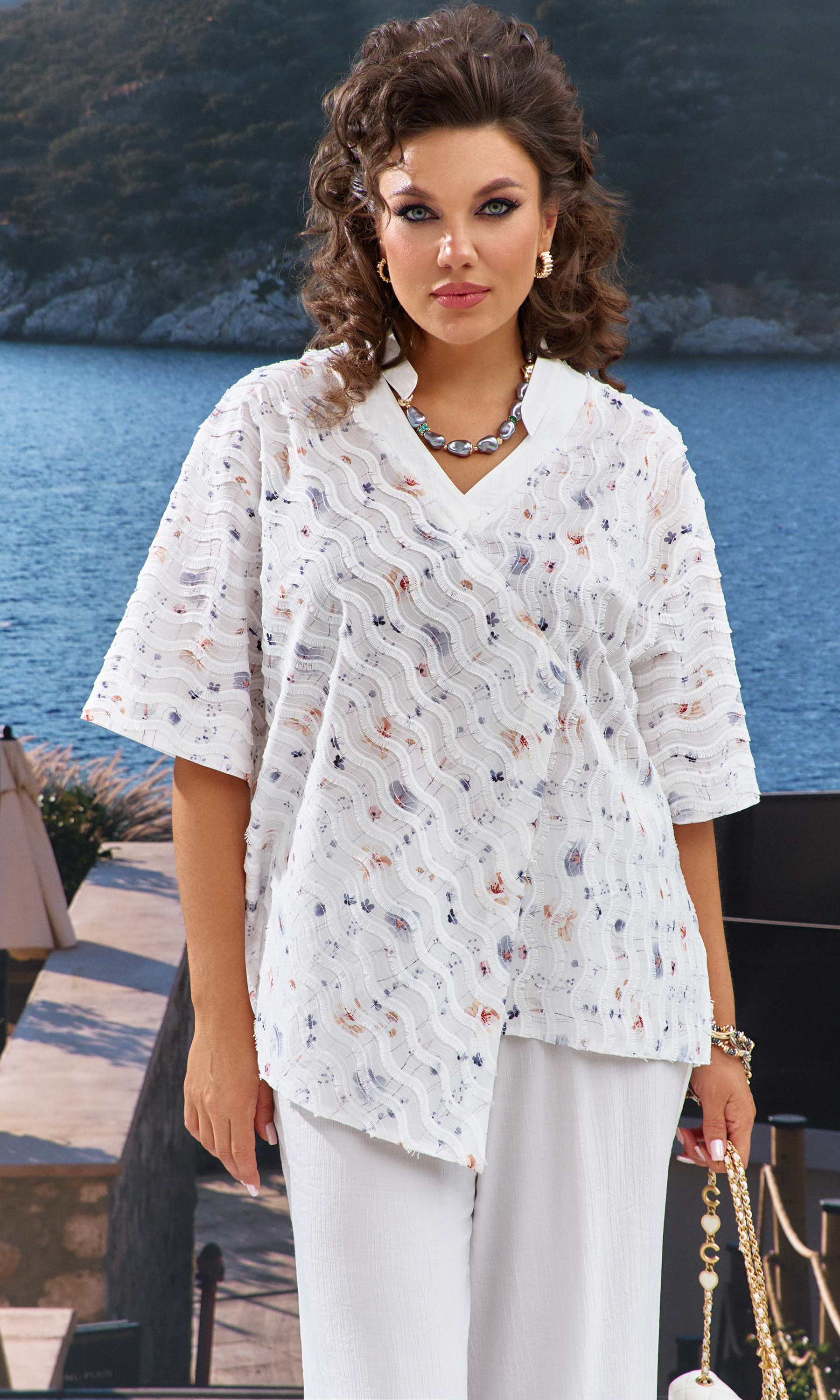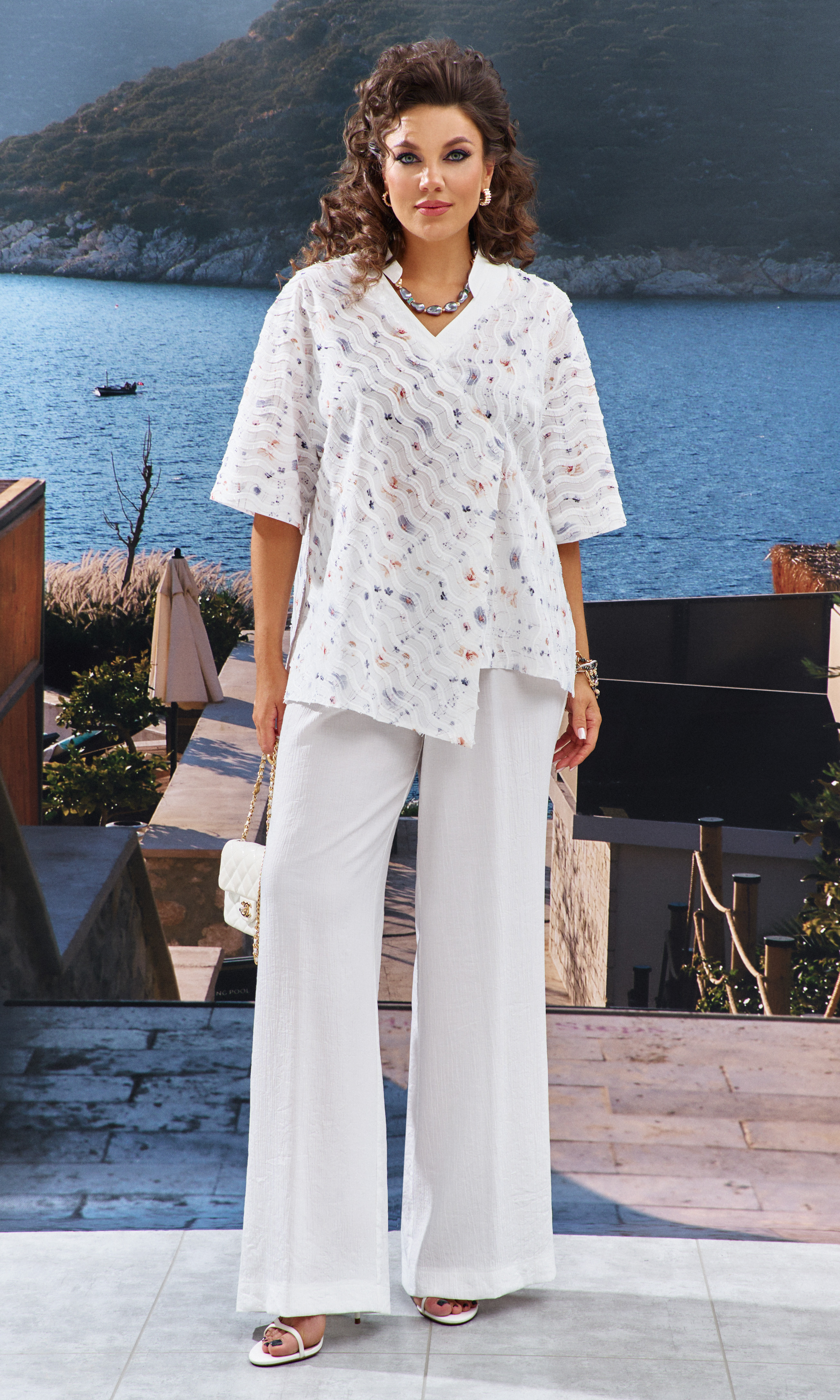 Состав: блузка 100% хлопок, брюки 85% вискоза, 15% полиамид. Этот комплект прекрасно подойдет для праздничного выхода и повседневной носки. Блузка выполнена из эффектной ткани с необычной вышивкой в виде бахромы и в романтичный цветочный принт очень актуальный в этом сезоне. Блузка прямого силуэта, свободного кроя без застежки на запах и ассиметричным низом по переду. В боковых швах разрезы. Горловина обработана изящной планкой с модельной стойкой. Рукав втачной, свободный с небольшим разрезом по низу. Спинка блузки с ассиметричным кокетливым подрезом. Разное направление бахромы в блузке подчеркивает игривость модели. Брюки прямого силуэта с притачным поясом с эластичной резинкой, которая обеспечивает удобную посадку на любой тип фигуры. Брюки выполнены из струящейся ткани с креп эффектом, что прекрасно придает образу легкость и неповторимость. Длина блузы 74 см (р.50-54), 74,5 см (р.56-60). Длина рукава 27 см. Длина брюк 108 см.
