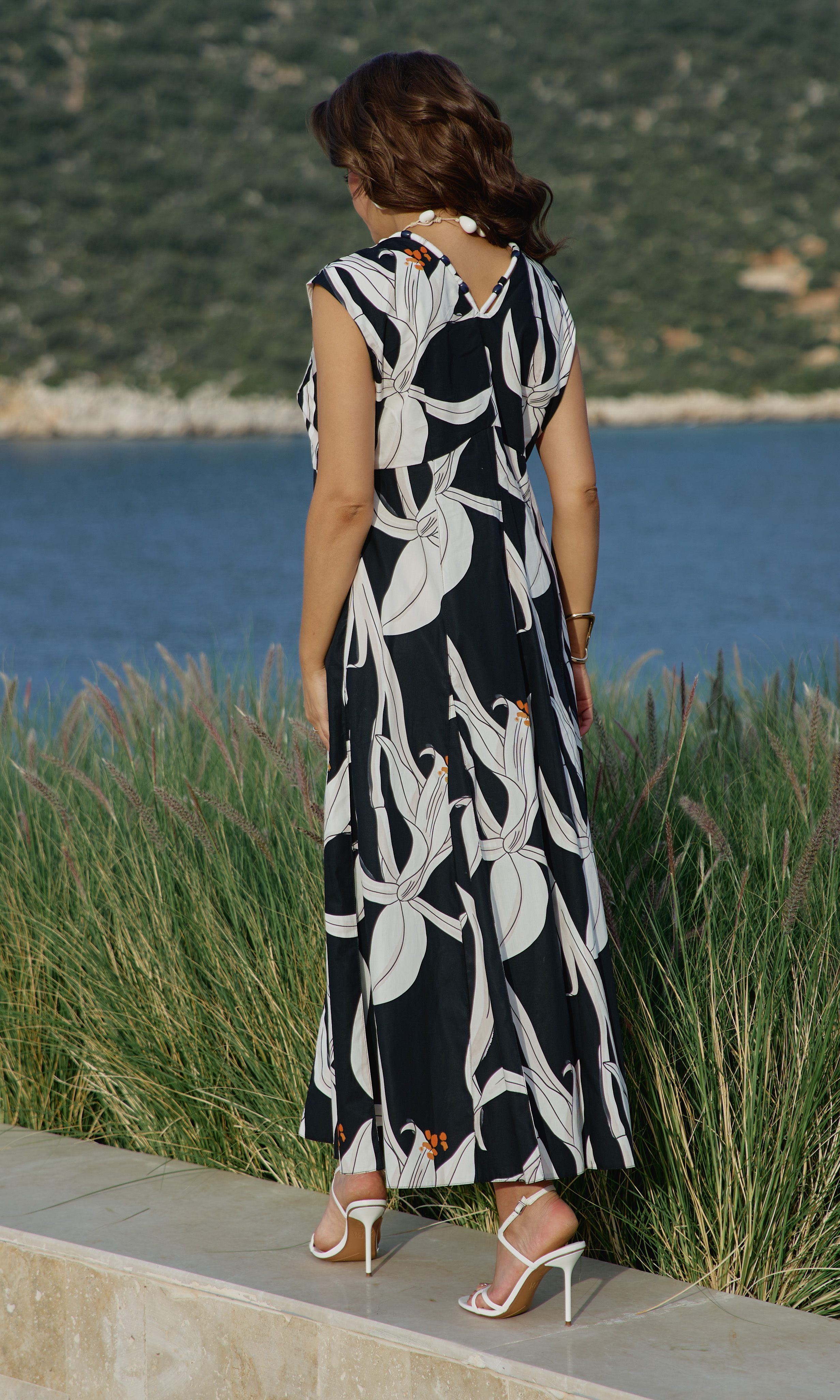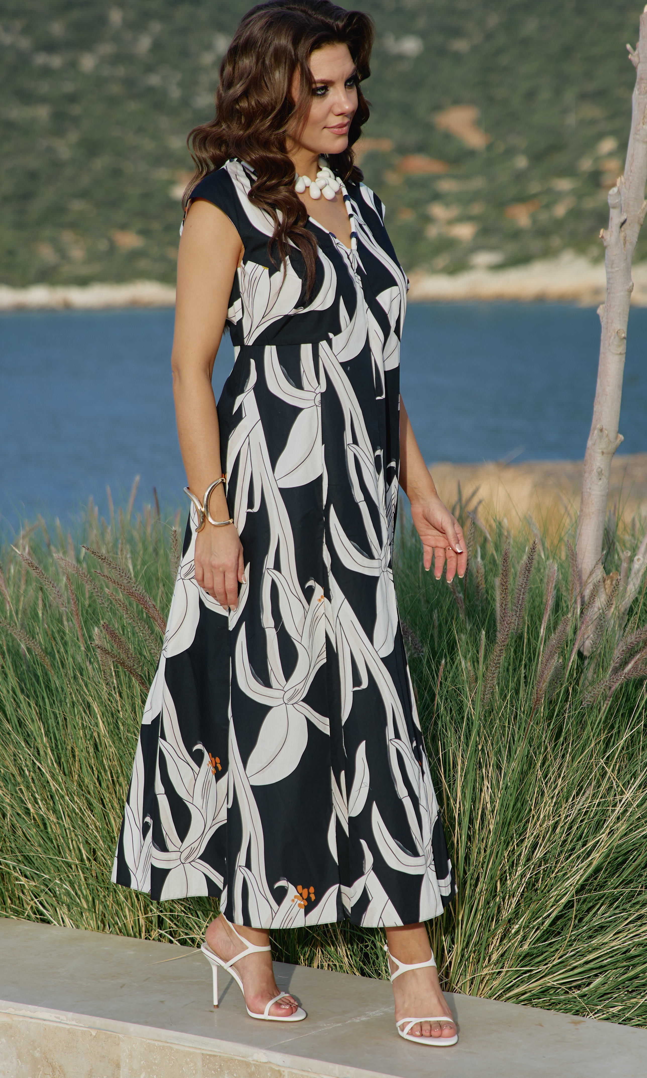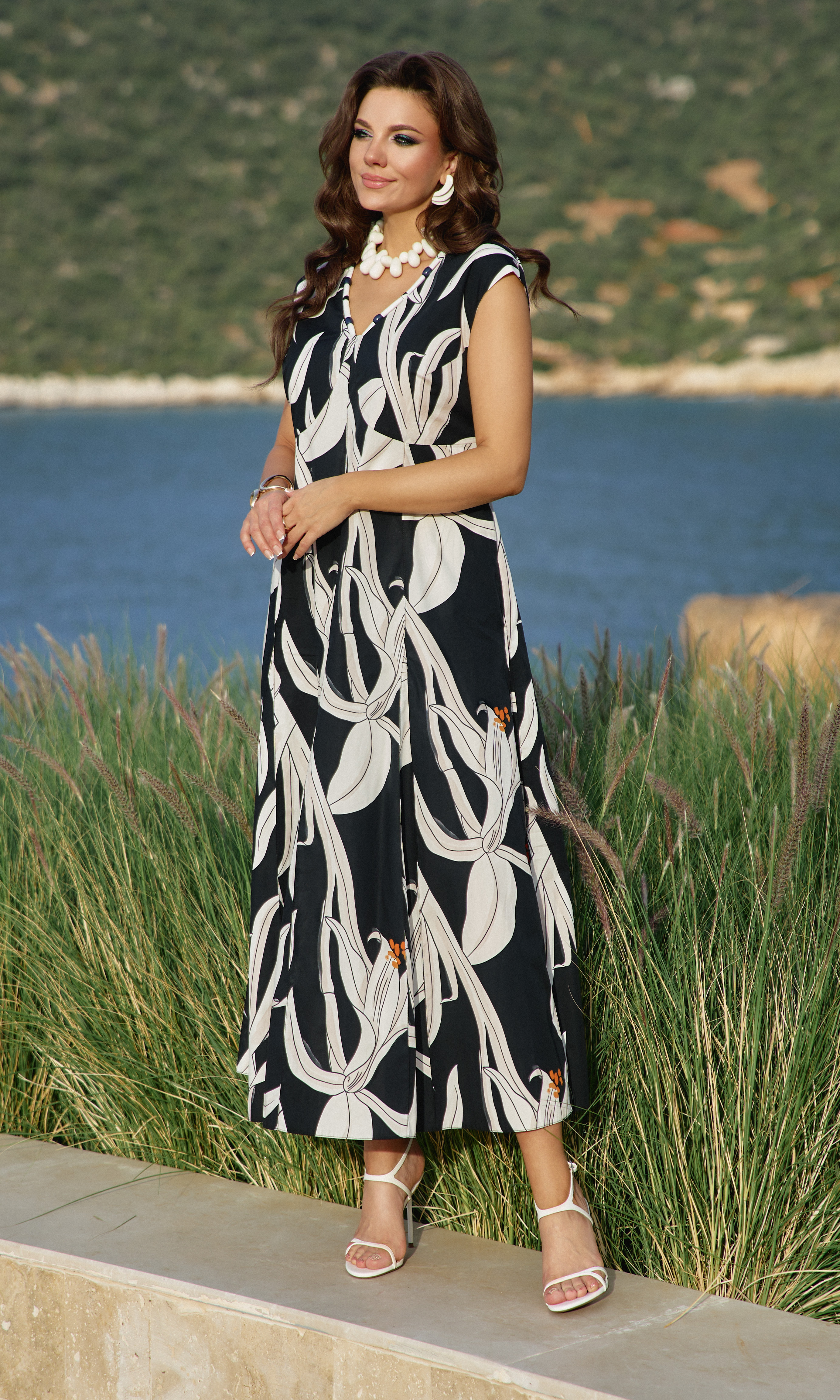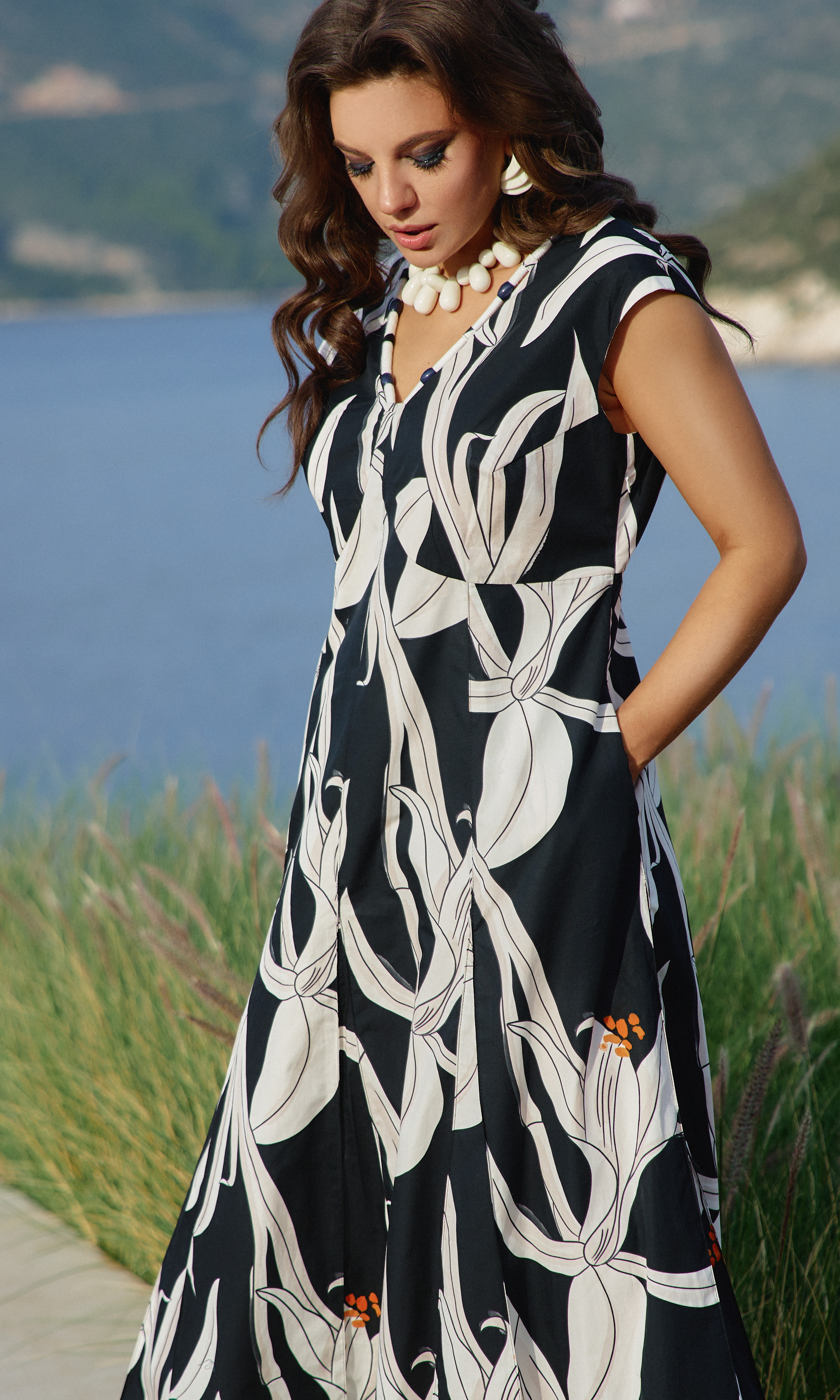 Состав: платье 100% хлопок, подкладка 100% хлопок. Платье женское с акцентом в виде яркого принта - идеальный вариант для тех, кто любит привлекать внимание. Силуэт платья подчеркнет красоту вашей фигуры и скроет недостатки, а также станет отличным дополнением в Вашем гардеробе. Платье полуприлегающего силуэта с плавным, V-образным вырезом по горловине . Лиф в платье двойной, с нагрудными вытачками, с декоративной кулисой по центру и фигурным подрезом под грудью. Спинка в платье отрезная, с фигурным подрезом. Линия плеча немного спущенная. Лиф на подкладке. Вырез горловины платья по переду и спинке оформлен декоративным шнуром с бусинами. Юбка в платье трапециевидного силуэта с застроченными кантами «на ребро», переходящими в декоративные клинья к низу платья. В боковых швах платья карманы. Длина платья 137 см, длина рукава 14,5 см (р 50-54), 15,5 см (р 56-60).