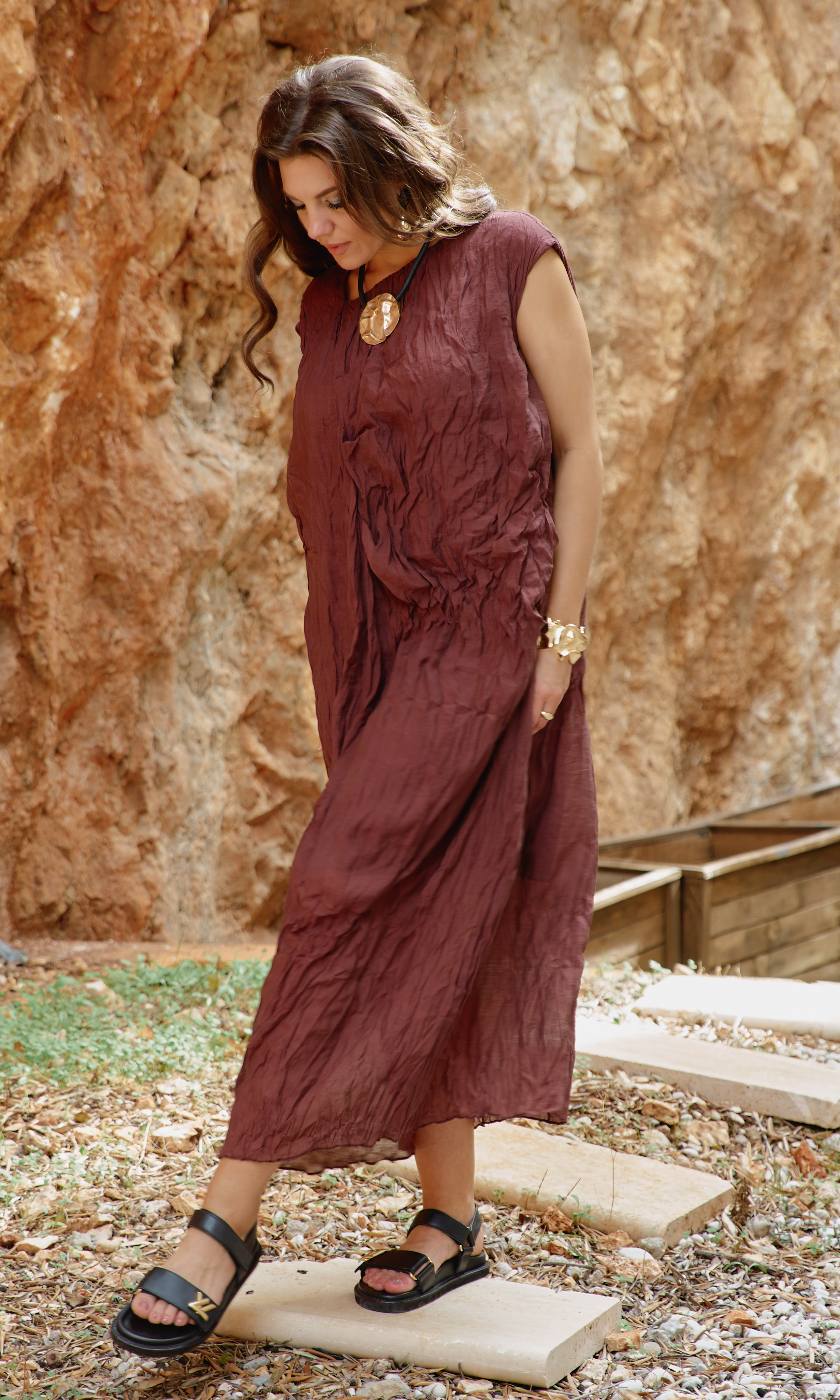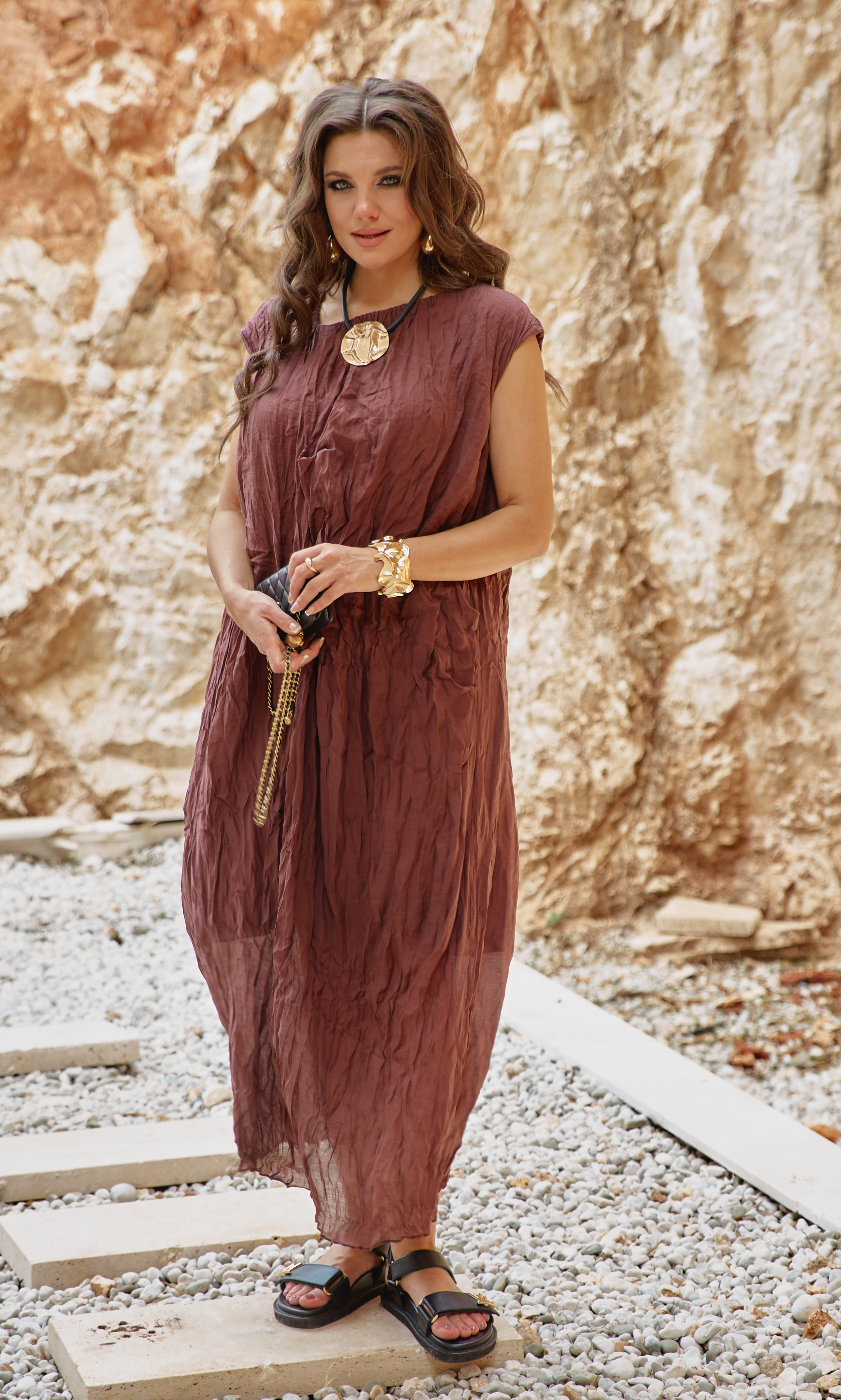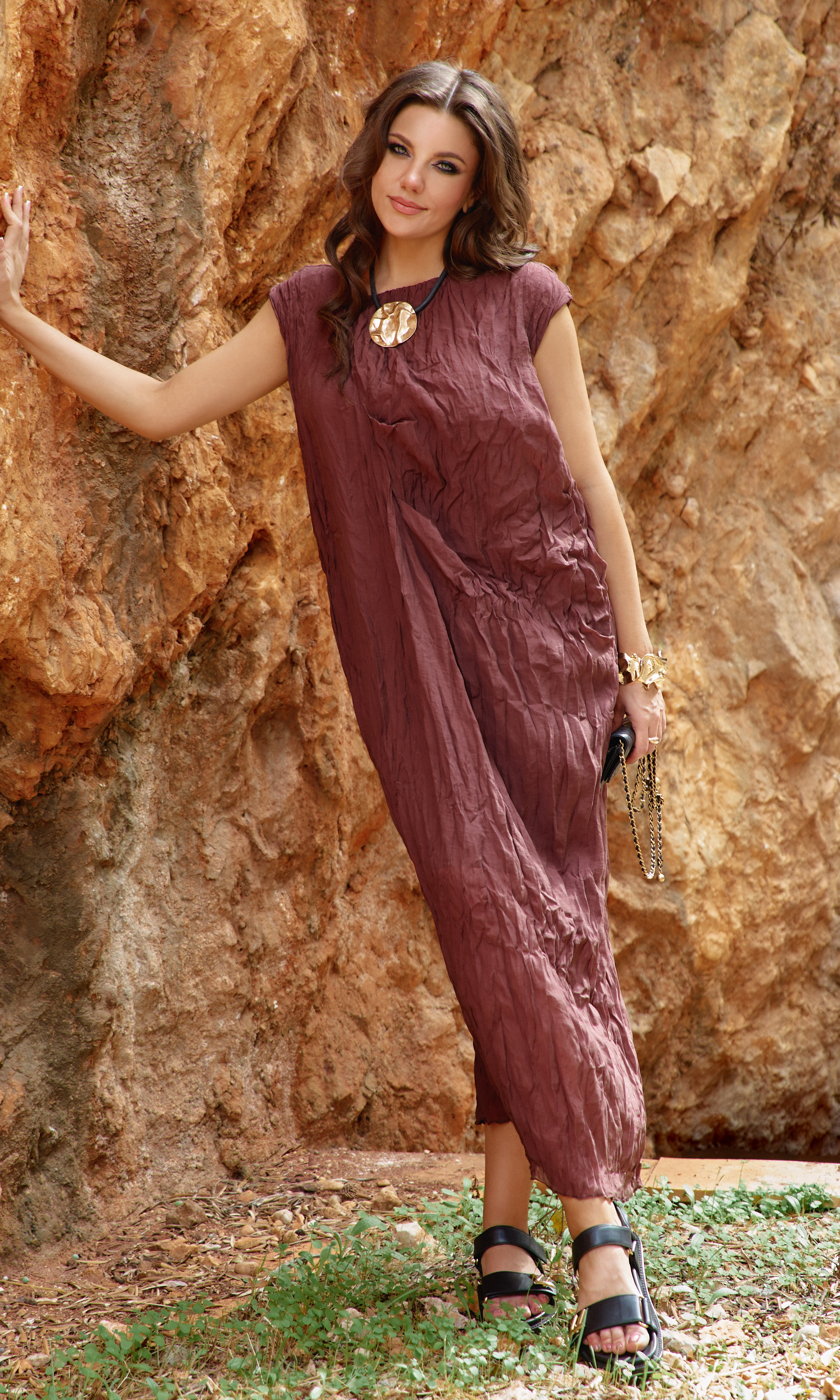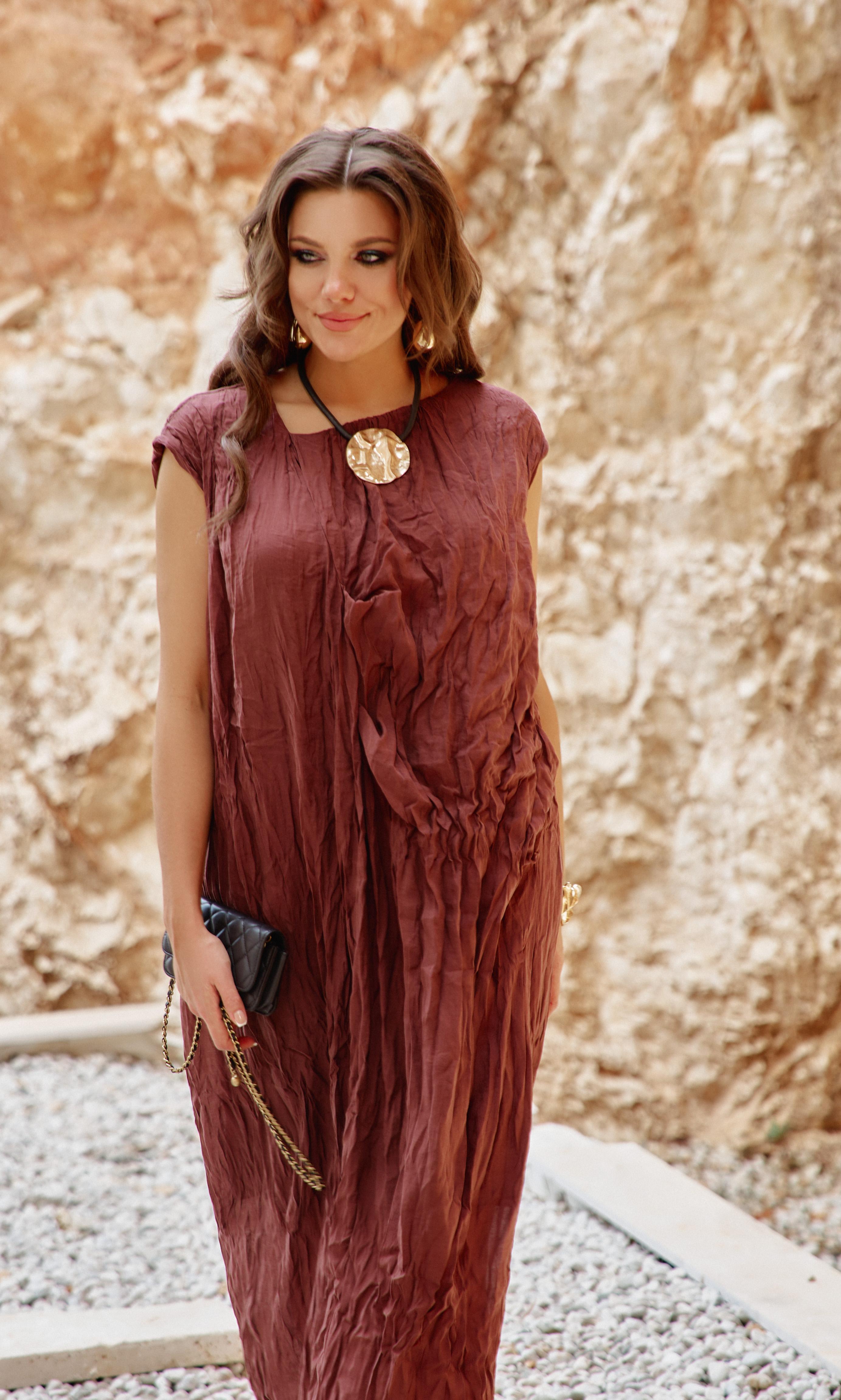 Состав: 85% тенсел, 15% полиэстер, подкладка 85% тенсел, 15% полиэстер. Женское платье в изысканном шоколадном оттенке, является настоящим произведением искусства, создавая гармоничное сочетание, которое привлекает внимание и восхищает. Дополняя это платье аксессуарами, которые подчеркнут общий образ— Вы будете выглядеть изящно, чувствовать себя увереннее и привлекательнее в любой обстановке: будь то романтический вечер, встреча с подругами или прогулка по городу. Дополнительную фактуру платью придаёт мятый эффект. Мятый эффект это не небрежность, а тщательно продуманный художественный прием. Она добавляет тактильности — хочется прикоснуться, ощутить эту "живую" текстуру, смягчает силуэт — делает образ менее формальным, более человечным. Платье свободного силуэта, с фигурным вырезом горловины. По переду платья подрез, от которого закладываются декоративные складки. Линия плеча в платье спущенная. Спинка со средним швом. Платье на подкладке. Платье не обтягивает, следует естественным линиям тела, создавая ощущение легкости и свободы. Длина платья 132 см.