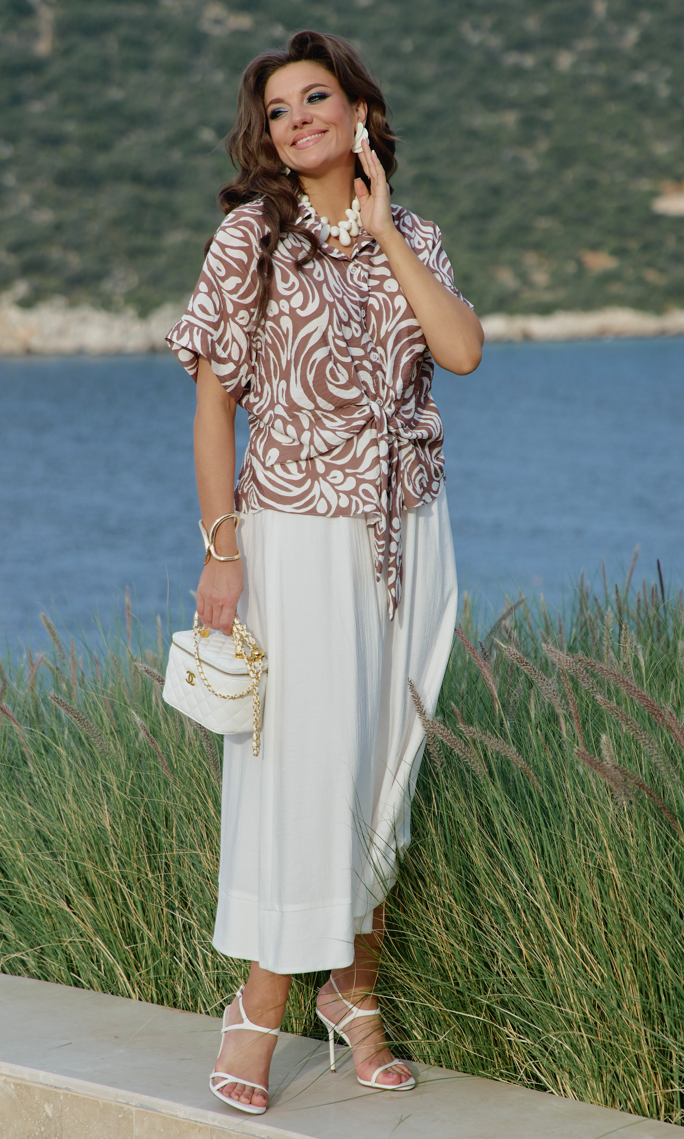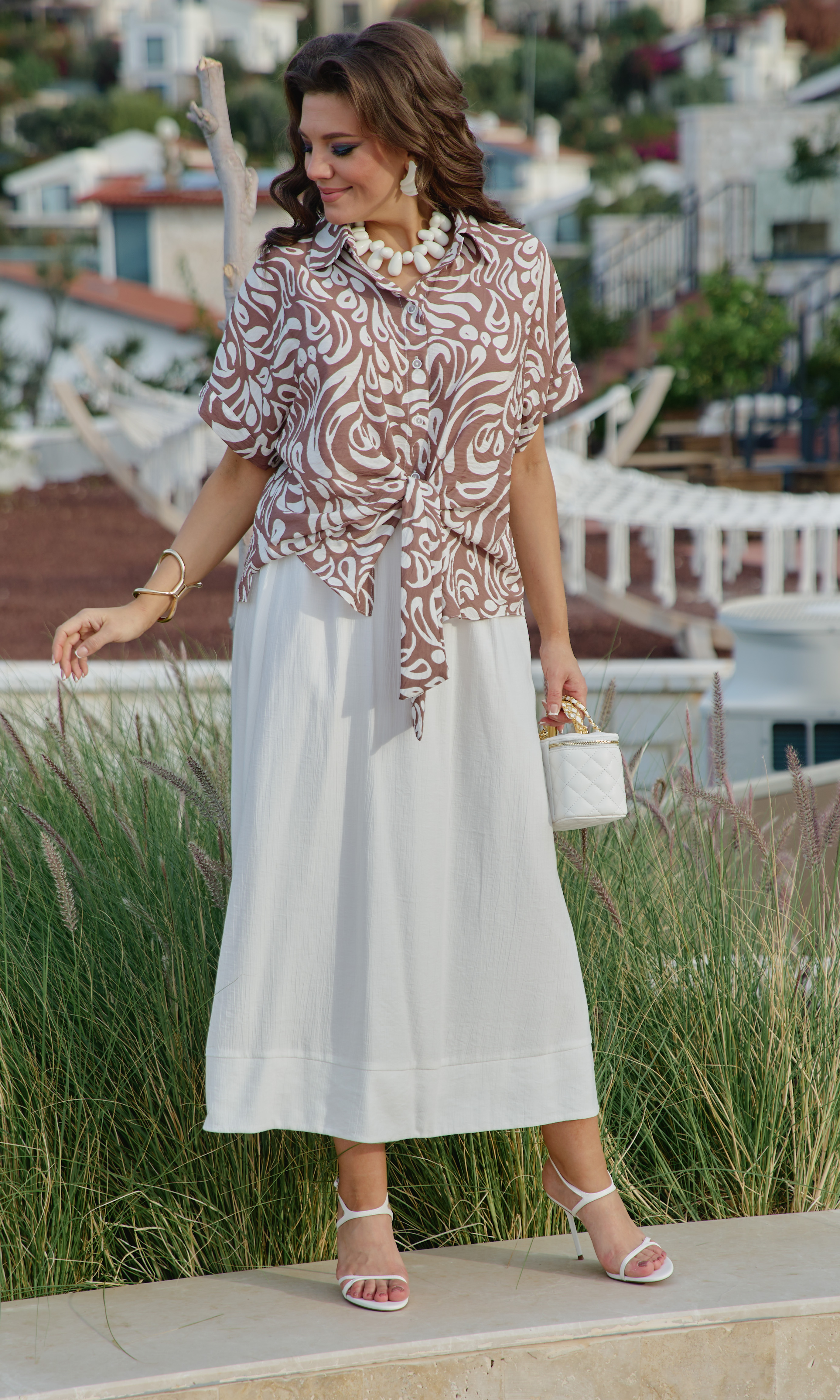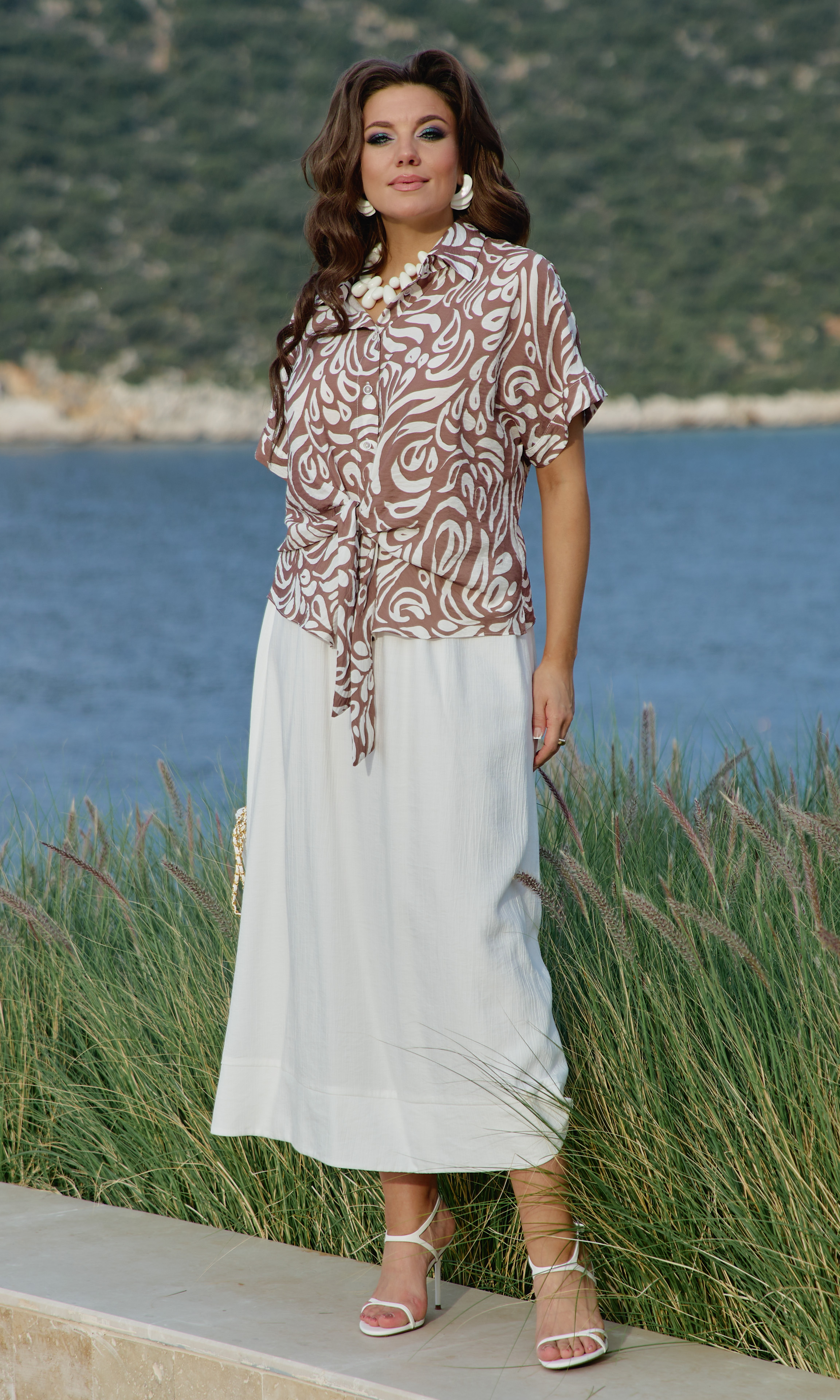 Состав: блузка 80% вискоза, 20% нейлон, юбка 85 вискоза 15нейлон, подкладка 100% хлопок. Этот комплект — не просто одежда. Это состояние души. Он для тех, кто: ценит естественную красоту без излишней демонстративности, любит чувствовать лёгкость и свободу в одежде, понимает элегантность минимализма, наслаждается тактильными ощущениями от качественных тканей. Он одинаково уместен на летней веранде кафе, на прогулке по набережной, на творческой встрече или романтическом свидании. Это одежда, которая не кричит о себе, но притягивает взгляды своей гармонией и безупречным вкусом. Грамотное сочетание верха из принтованной ткани и однотонного светлого низа. Блузка с центральной застёжкой на декоративные петли-пуговицы по планке, с воротником рубашечного типа. Её свободный крой обволакивает фигуру, не стесняя, а подчёркивая её естественные линии. Рукав в блузке цельнокроеный с притачной манжетой по низу. По переду блузки цельнокроеные отрезные детали завязывающиеся на бант. Спинка с отрезной кокеткой. В боковых швах блузки разрезы. Юбка трапеция начинается от естественной линии талии и мягко расширяется к подолу, создавая идеальный силуэт для летнего дня. Её форма одновременно структурирована и свободна: чёткие линии кроя сочетаются с текучестью материала. Длина юбки — до середины икры или чуть ниже, позволяя демонстрировать изящные лодыжки и удобную летнюю обувь. При ходьбе юбка образует красивые волны, её полы расходятся, обнажая мгновениями ногу, чтобы тут же снова сомкнуться в элегантном движении. Пояс в юбке притачной, на эластичной тесьме-резинке, что обеспечивает максимально удобную посадку на любой тип фигуры, по низу притачная деталь в сгиб в виде планки. Юбка на подкладке. Длина блузки 56 см (р 50-54), 57,5 см (р 56-60). Длина рукава 33 см (р 50-54), 34 см (р 56-60). Длин юбки 87 см.