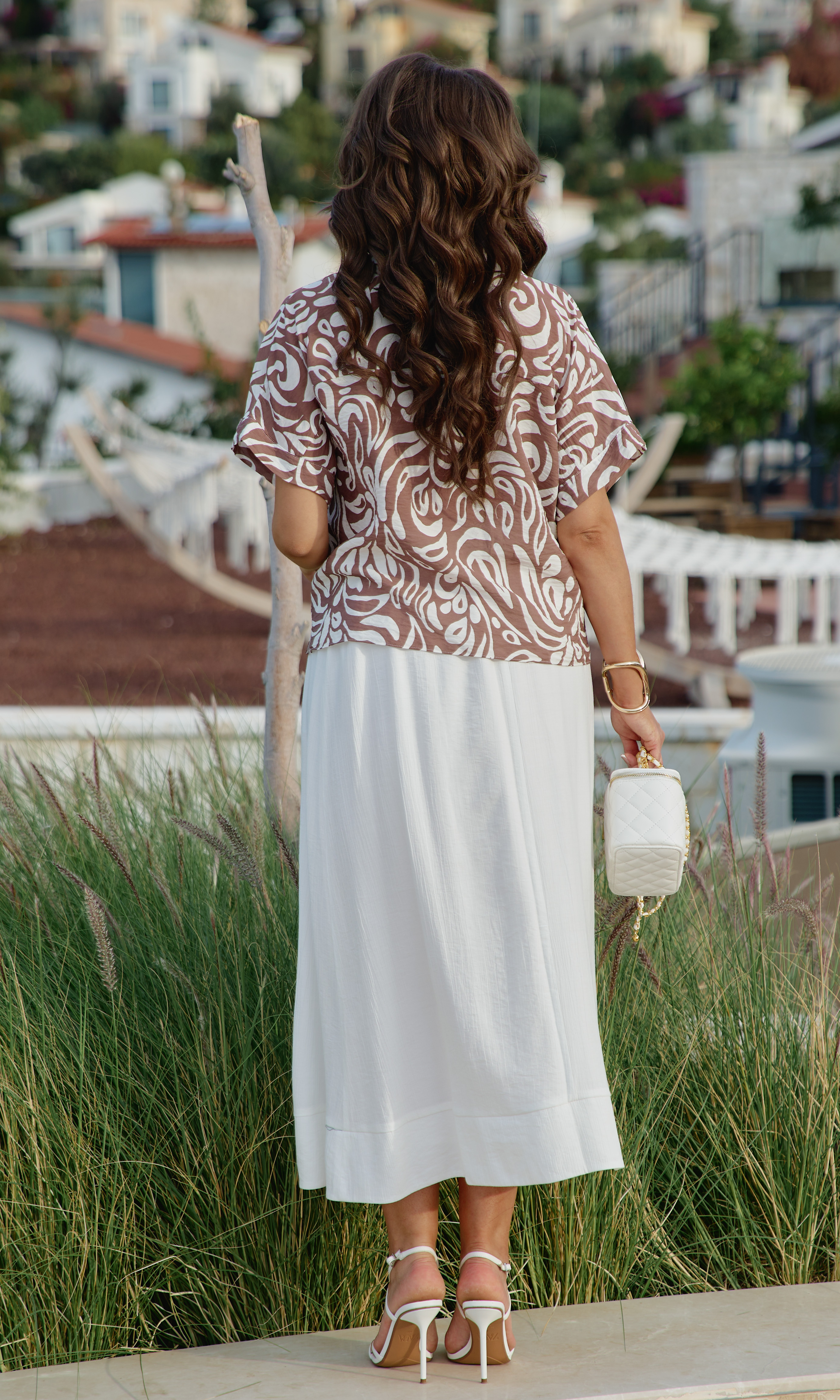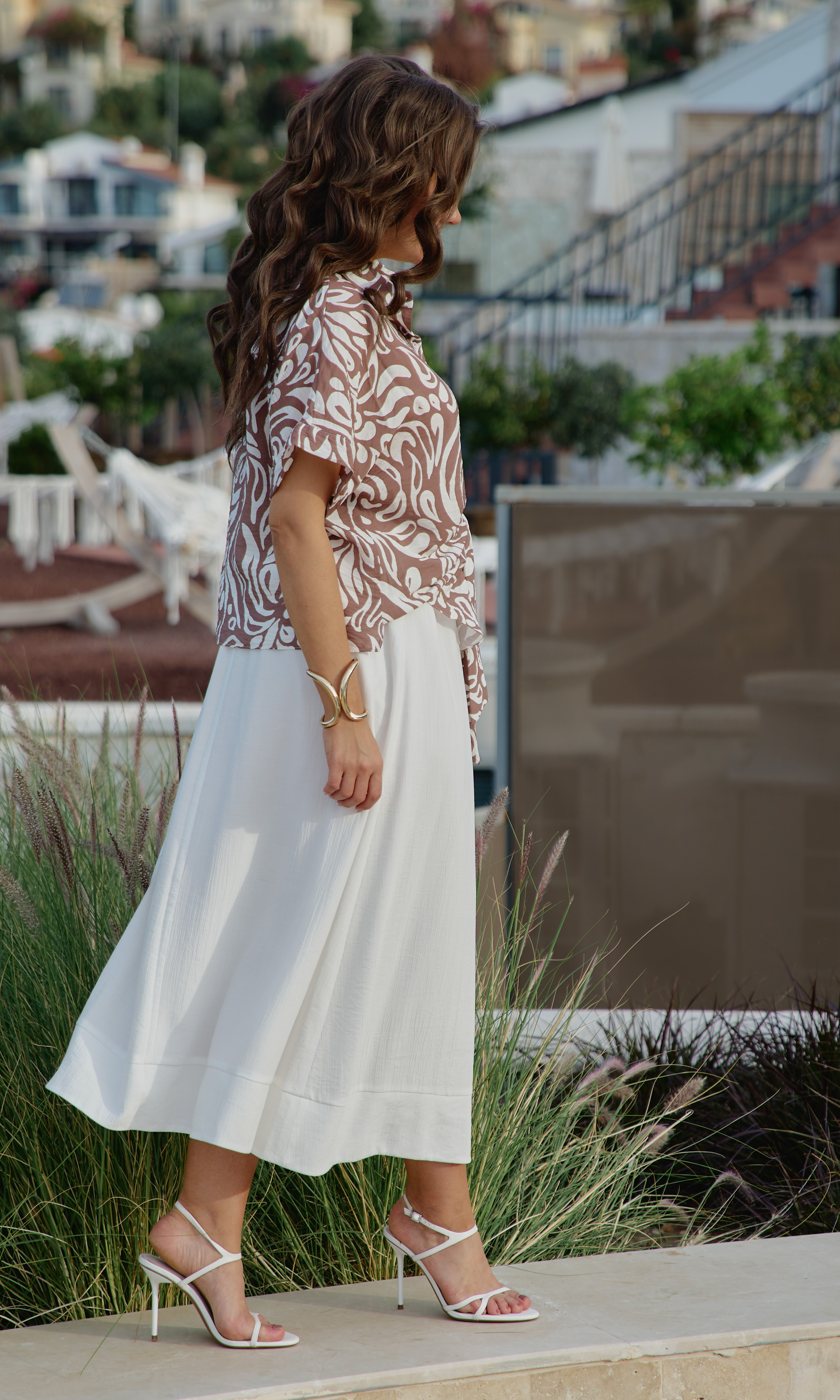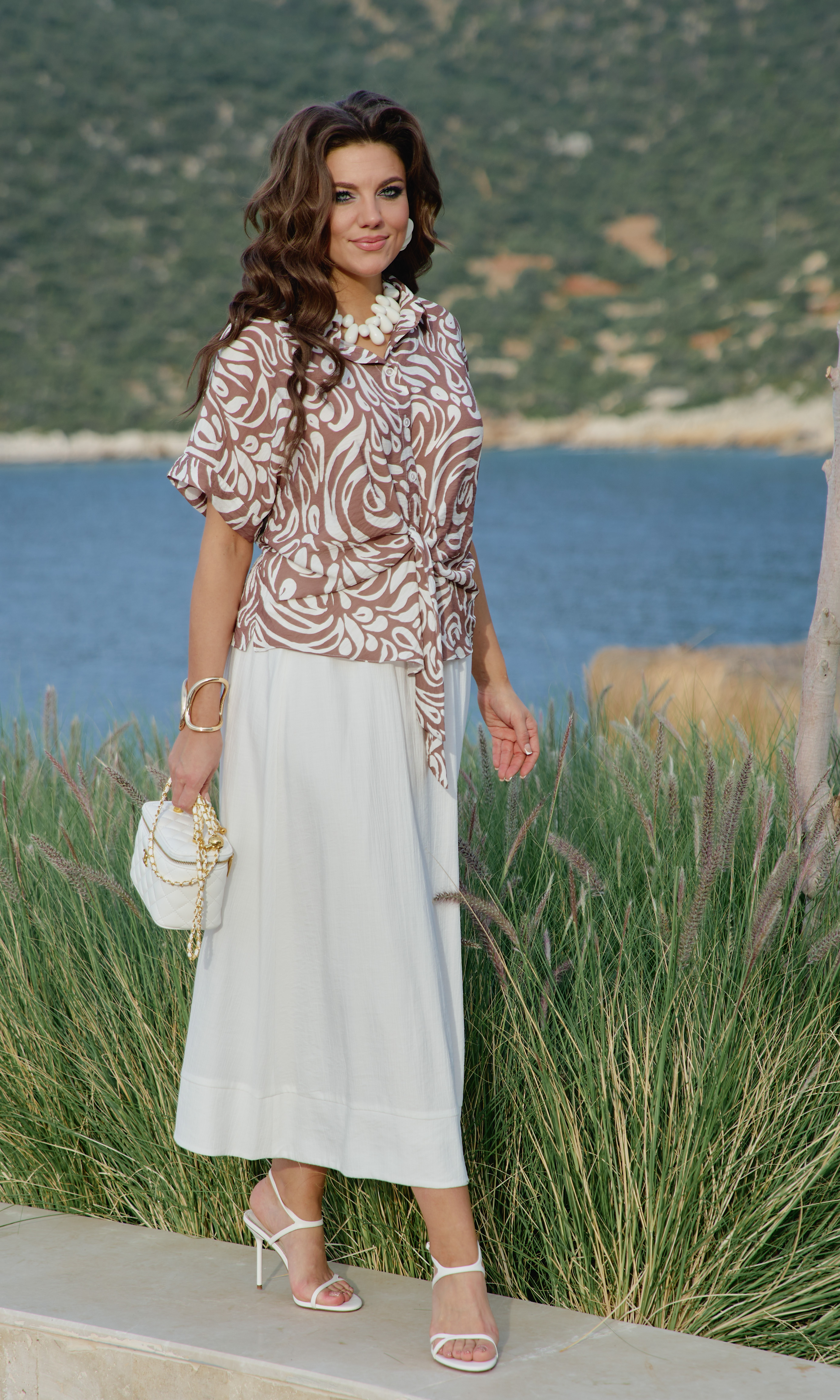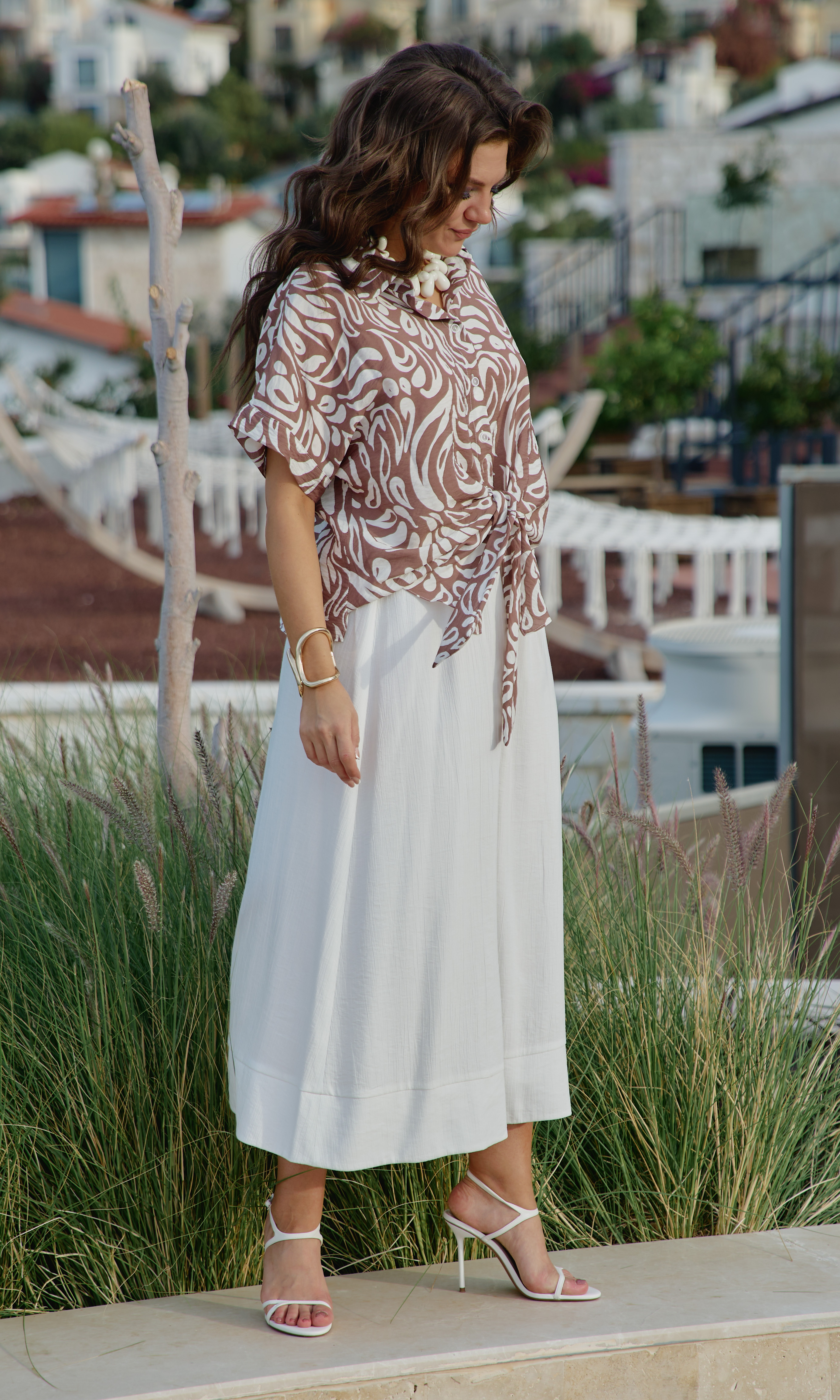 Состав: блузка 80% вискоза, 20% нейлон, юбка 85 вискоза 15нейлон, подкладка 100% хлопок. Этот комплект — не просто одежда. Это состояние души. Он для тех, кто: ценит естественную красоту без излишней демонстративности, любит чувствовать лёгкость и свободу в одежде, понимает элегантность минимализма, наслаждается тактильными ощущениями от качественных тканей. Он одинаково уместен на летней веранде кафе, на прогулке по набережной, на творческой встрече или романтическом свидании. Это одежда, которая не кричит о себе, но притягивает взгляды своей гармонией и безупречным вкусом. Грамотное сочетание верха из принтованной ткани и однотонного светлого низа. Блузка с центральной застёжкой на декоративные петли-пуговицы по планке, с воротником рубашечного типа. Её свободный крой обволакивает фигуру, не стесняя, а подчёркивая её естественные линии. Рукав в блузке цельнокроеный с притачной манжетой по низу. По переду блузки цельнокроеные отрезные детали завязывающиеся на бант. Спинка с отрезной кокеткой. В боковых швах блузки разрезы. Юбка трапеция начинается от естественной линии талии и мягко расширяется к подолу, создавая идеальный силуэт для летнего дня. Её форма одновременно структурирована и свободна: чёткие линии кроя сочетаются с текучестью материала. Длина юбки — до середины икры или чуть ниже, позволяя демонстрировать изящные лодыжки и удобную летнюю обувь. При ходьбе юбка образует красивые волны, её полы расходятся, обнажая мгновениями ногу, чтобы тут же снова сомкнуться в элегантном движении. Пояс в юбке притачной, на эластичной тесьме-резинке, что обеспечивает максимально удобную посадку на любой тип фигуры, по низу притачная деталь в сгиб в виде планки. Юбка на подкладке. Длина блузки 56 см (р 50-54), 57,5 см (р 56-60). Длина рукава 33 см (р 50-54), 34 см (р 56-60). Длин юбки 87 см.