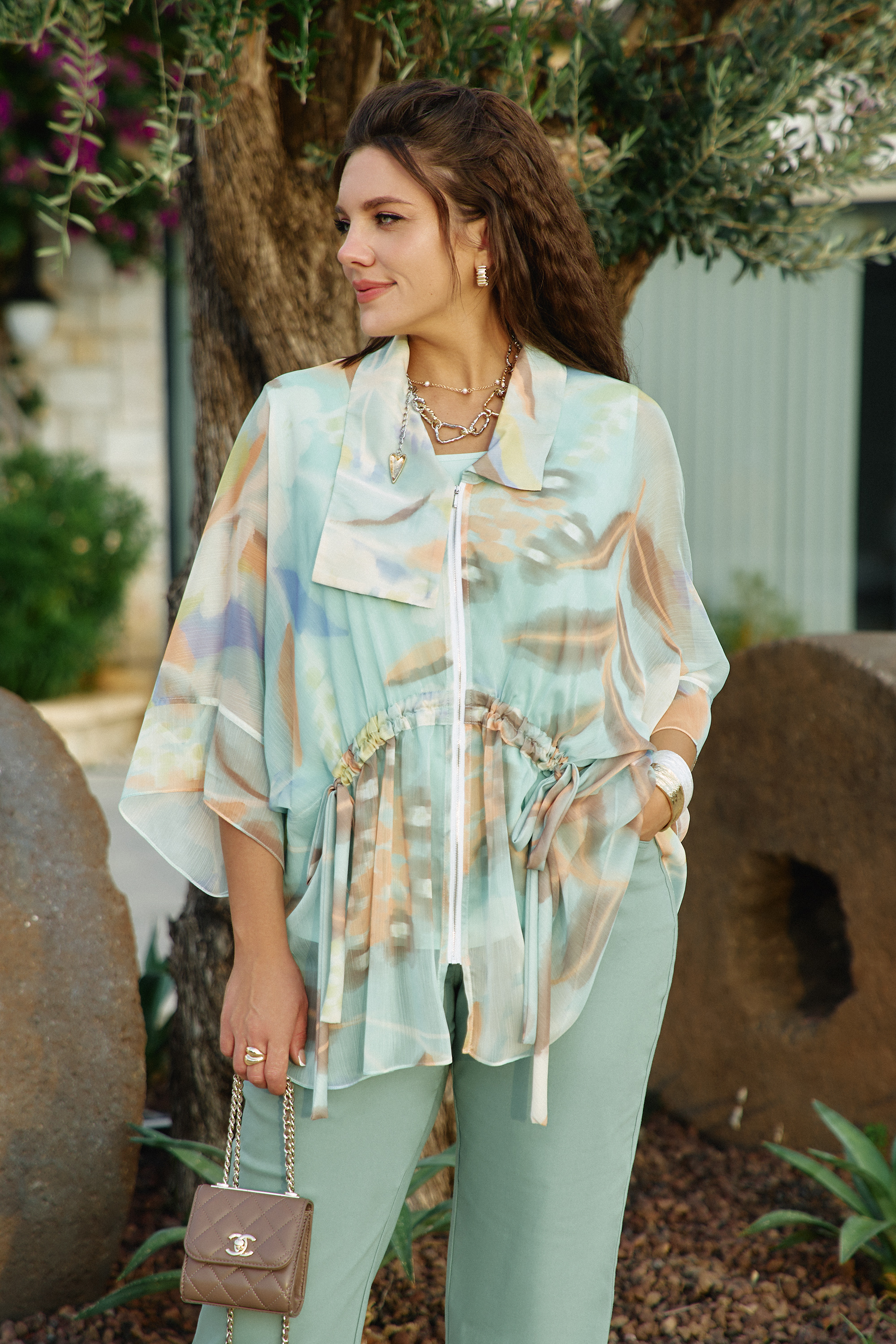 Состав: блузка 100% полиэстер, блуза 100% полиэстер, брюки 72% хлопок, 26% полиэстер, 2% эластан. Комплект женский, трёх предметный, состоящий из блузки, блузы и брюк. Блузка свободного силуэта, с центральной застёжкой на тесьму молнию по переду; воротник в блузке отложной, ассиметричный. В качестве отделочного элемента по переду блузки- кулиса со шнуром из основной ткани. Рукав цельнокроеный, длиной 7/8, с притачной манжетой. По спинке отрезная кокетка. Низ в блузке ассиметричный. Блуза прямого силуэта с округлой формой горловины и нагрудными вытачками по полочке. Спинка без особенностей. Брюки прямого силуэта, по переду застежка на тесьму молнию в гульфике и пуговицу в поясе. По переду брюк наклонные карманы. Пояс притачной со шлёвками, вставкой эластичной тесьмы резинки в «бочках» пояса и вставкой фигурной кокетки по задним деталям брюк. По задним половинкам брюк накладные карманы. Обращаем ваше внимание, что фурнитура может незначительно отличаться от фото. Длина верхней блузы по центру спинки 75,5 см (р 52-56), 76 см (р 58-62). Длина рукава верхней блузы 56 см (р 52-56), 57 см (р 58-62). Длина брюк по боковому шву от шва притачивания пояса 98 см.