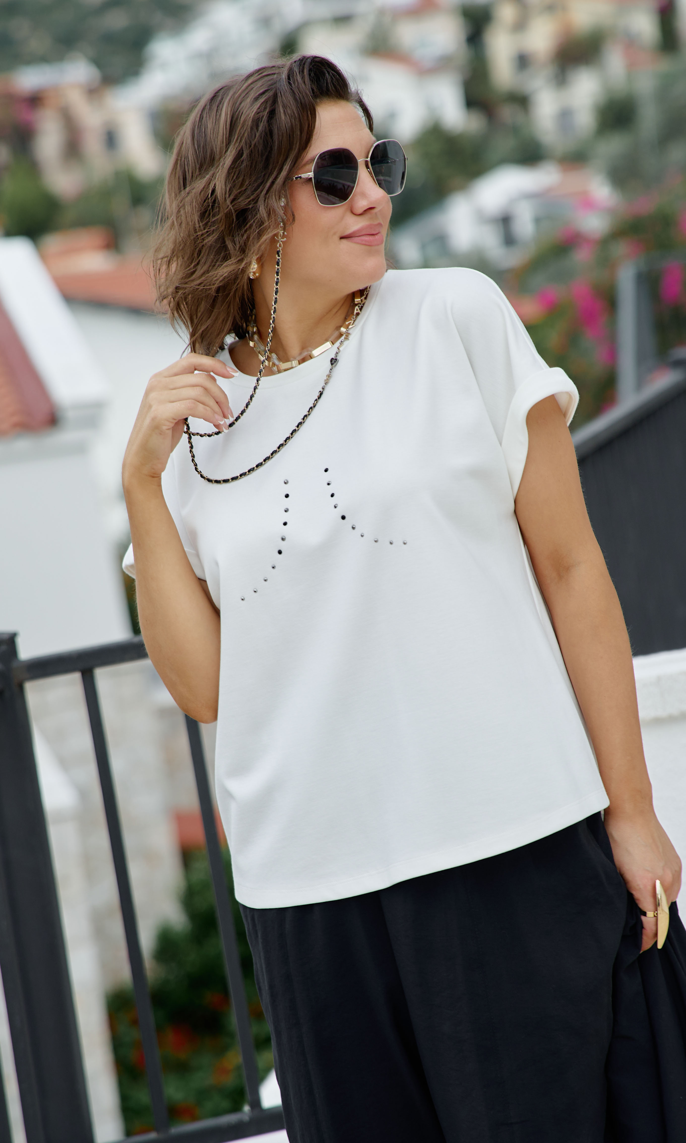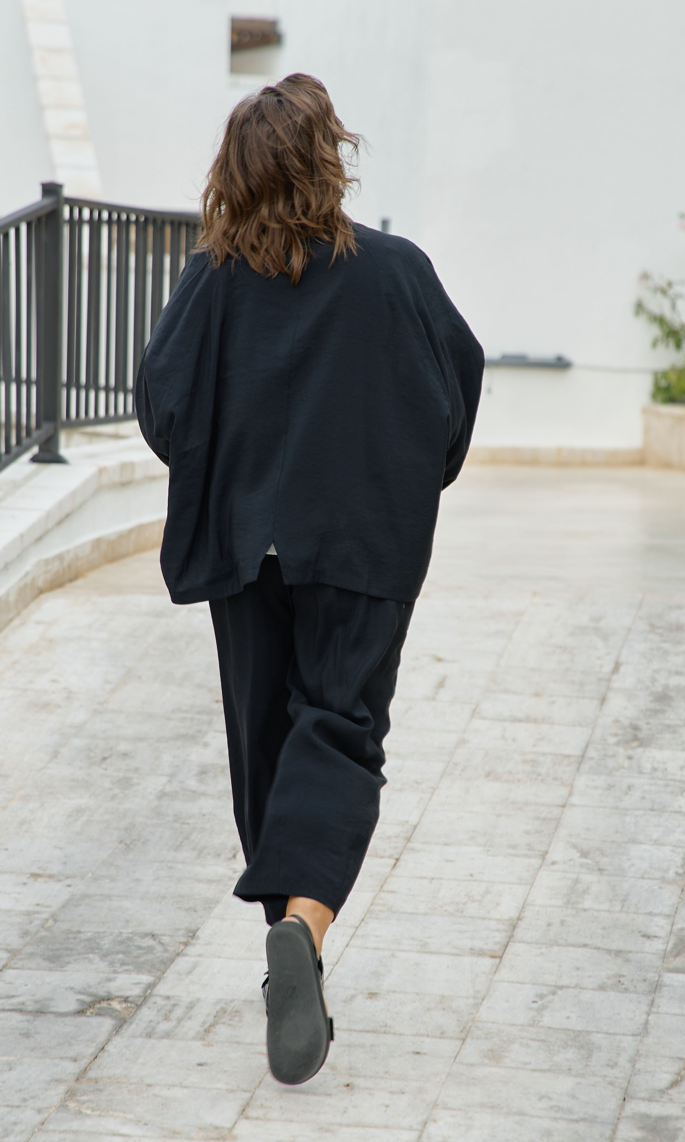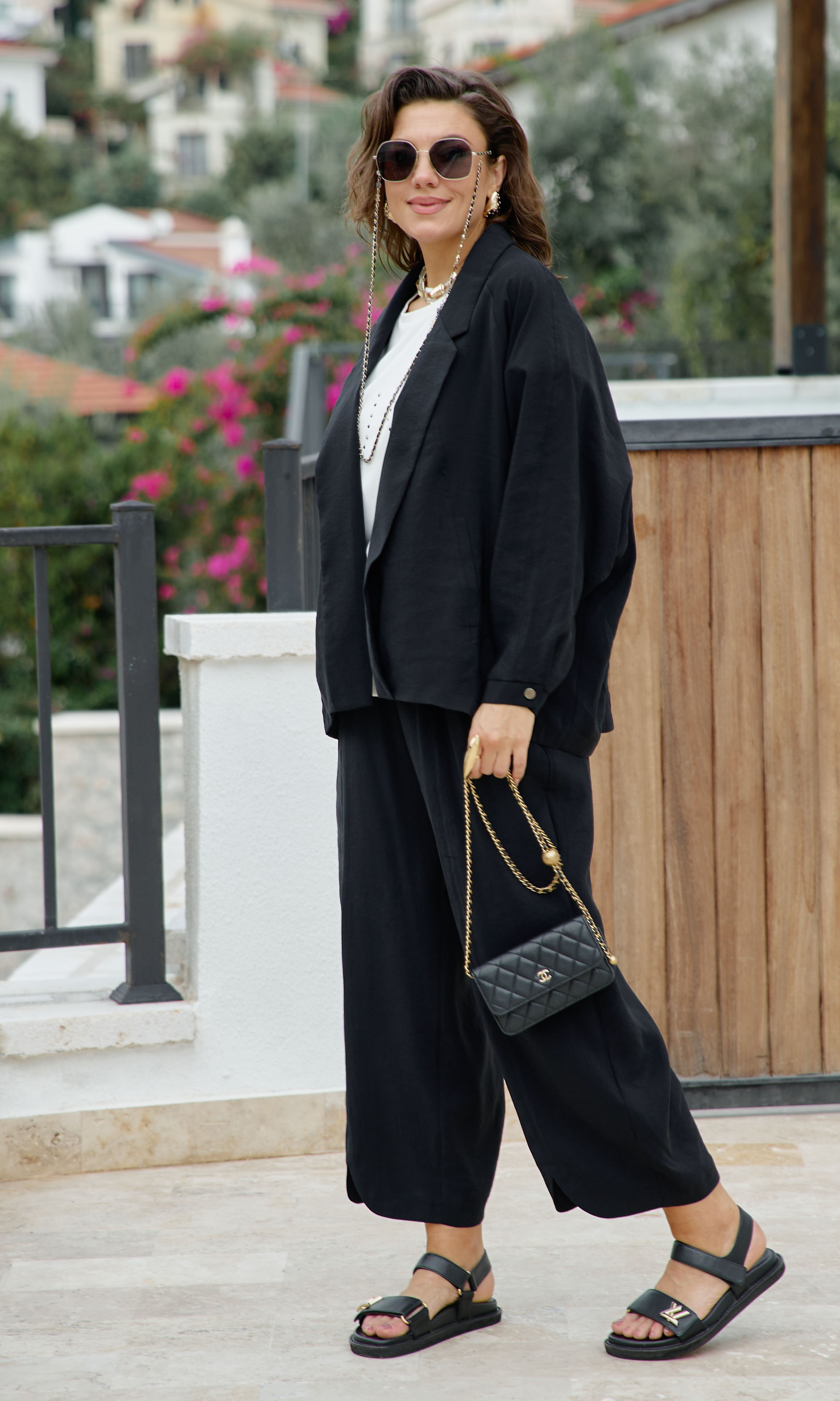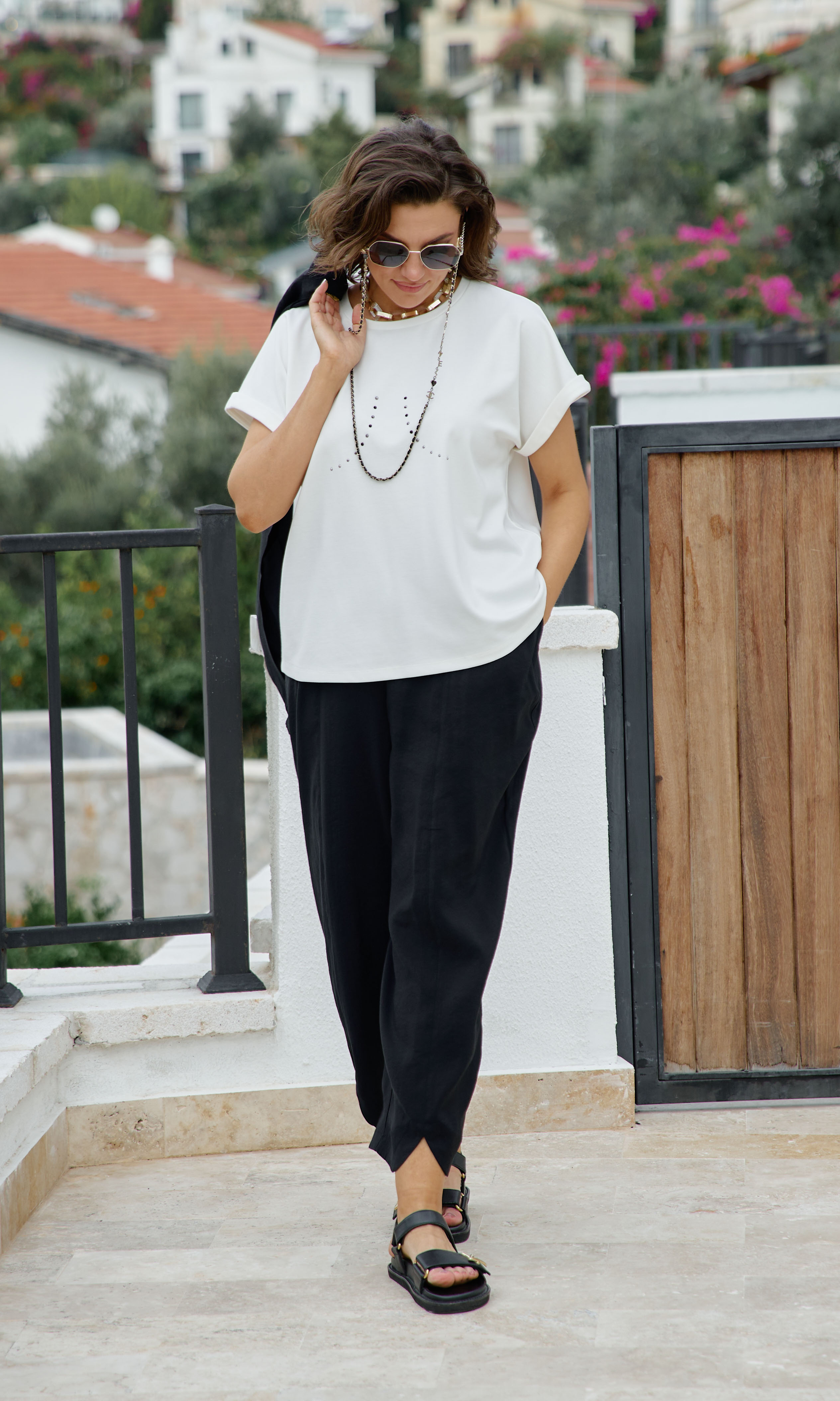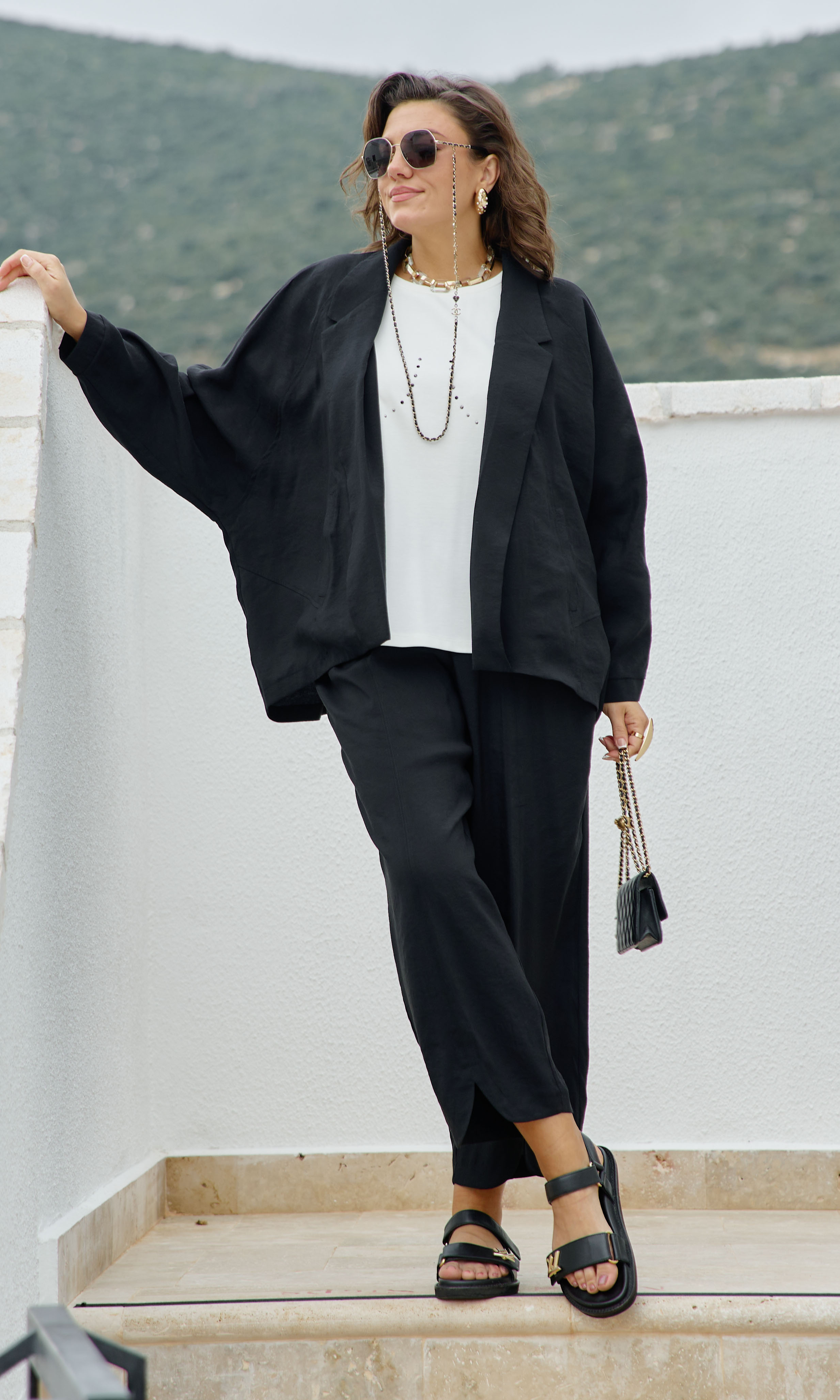 Состав: жакет и брюки 85% модал, 15% полиэстер, блуза 60% вискоза, 35% полиамид, 5% спандекс. Легкий женский комплект, состоящий из блузы, брюк и жакета, выполнен в спортивном стиле из ткани купра и трикотажа. Костюм прямого силуэта заужен к низу. Пластичная форма мягкая, плавная. Линия плеч с естественным наклоном и плавным переходом в линию рукава. Блуза из трикотажа, расширенная к низу, с цельнокроенными рукавами и отворотами. Спереди выполнена аппликация из страз разного размера. Жакет свободного силуэта, без подкладки и застежки. Крой легкий, сохраняющий объем изделия. По переду в рельефах выполнены удобные карманы с листочками. Крой рукава – реглан с манжетой по низу и застежкой на кнопку. Спинка разрезная с декоративным маленьким разрезом внизу. Воротник отложной с лацканами. Брюки на резинке по всему поясу, что придает комфорт в носке и не стесняет движения. В боковых швах уютные карманы. К низу брюки заужены. По переду выполнены вертикальные рельефы с декоративным фигурным окончанием у линии низа, что придает модели кокетство и задерживает внимание на деталях. Этот элемент выгодно подчеркивает вашу обувь. Этот комплект подойдет для прогулок, поездок, посиделок с друзьями, похода в кафе. Модель свободного кроя органично впишется в гардероб, будет элегантной и уместной. Этот комплект «вне времени», пластика брючного комплекта продумана для идеальной посадки на любой фигуре. Комплект подойдет для повседневных образов и подойдет к любому стилю. Он отлично стройнит и молодит современным кроем и дерзким декором. Это комфортная модель на каждый день, она создает женственный и элегантный образ. Мы используем только высококачественные материалы и фурнитуру, делаем акцент на фигуру, что позволяет комплекту быть идеальным на каждый день. Длина жакета 71 см (р 52-56), 72 см (р 58-62), длина рукава 72 см (р 52-56), 73 см (р 58-62). Длина блузы 62 см, длина рукава 26,5 см (р 52-56), 29,5 см (р 58-62). Длина брюк 99 см.
