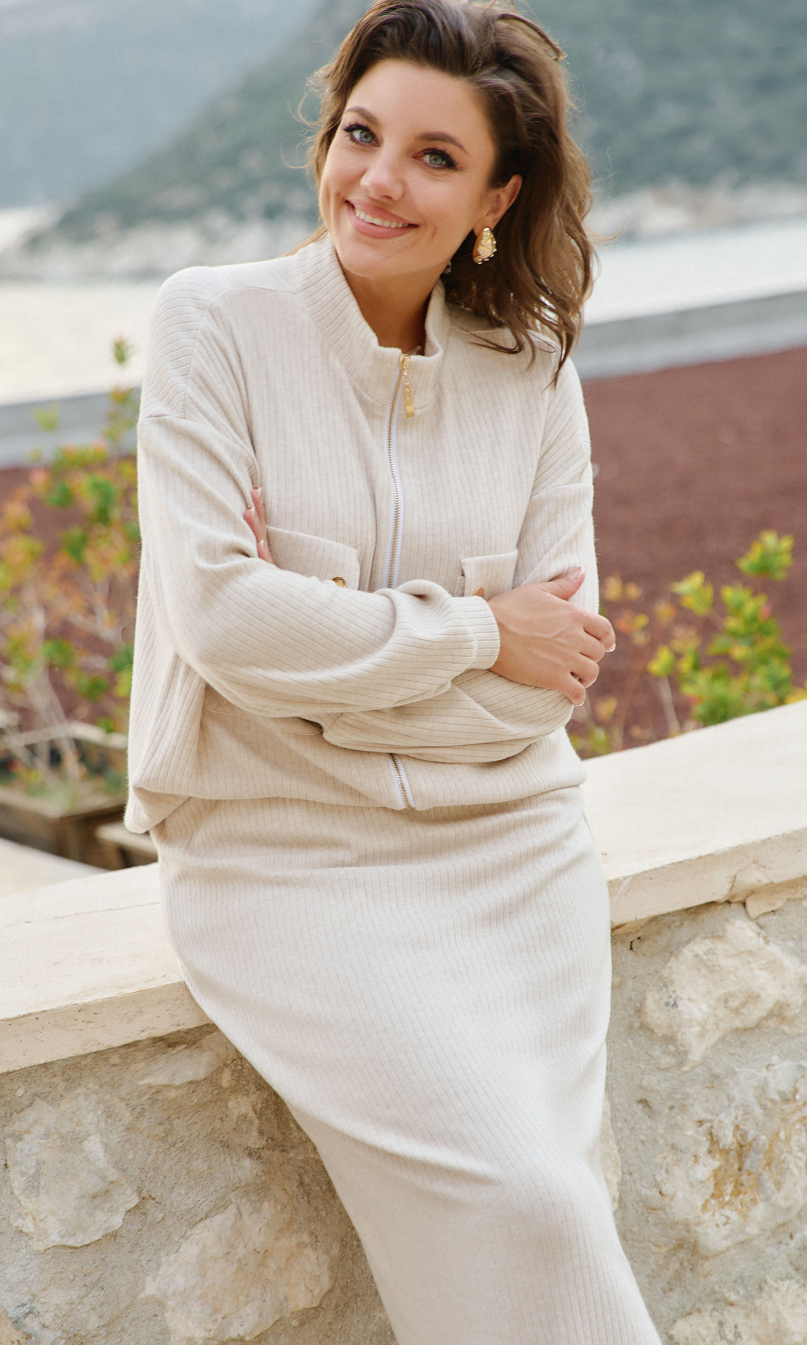 Состав: 96% полиэстер, 4% спандекс. Костюм женский, двух предметный, состоящий из блузона и юбки. Такой костюм становится легким и универсальным решением для любого гардероба, позволяя чувствовать себя стильно и непринужденно вне зависимости от ситуации, оставаясь непрерывно в модном контексте. Данная модель — это сочетание гармонии и утончённой элегантности, заключённая в простоте линий и играх текстур. Блузон «оверсайз» силуэта с застёжкой на тесьму-молнию по центру переда, вортником стойкой, линия плеча спущенная. По переду накладные карманы с клапаном. Рукав в блузоне втачной, длинный с притачной манжетой по низу. Спинка без особенностей. По низу блузона притачной пояс. Юбка прямого силуэта длины «миди», с цельнокроеным поясом на резинке, что обеспечивает максимально удобную посадку на фигуру. В среднем шве заднего полотнища юбки разрез. Юбка на подкладке. Декоративная отделка в виде золотой фурнитуры в костюме придают ему завершенность. Длина блузона по спинке 57 см, длина рукава 75 см (р 50-54), 76 см (р 56-60). Длина юбки 85 см.