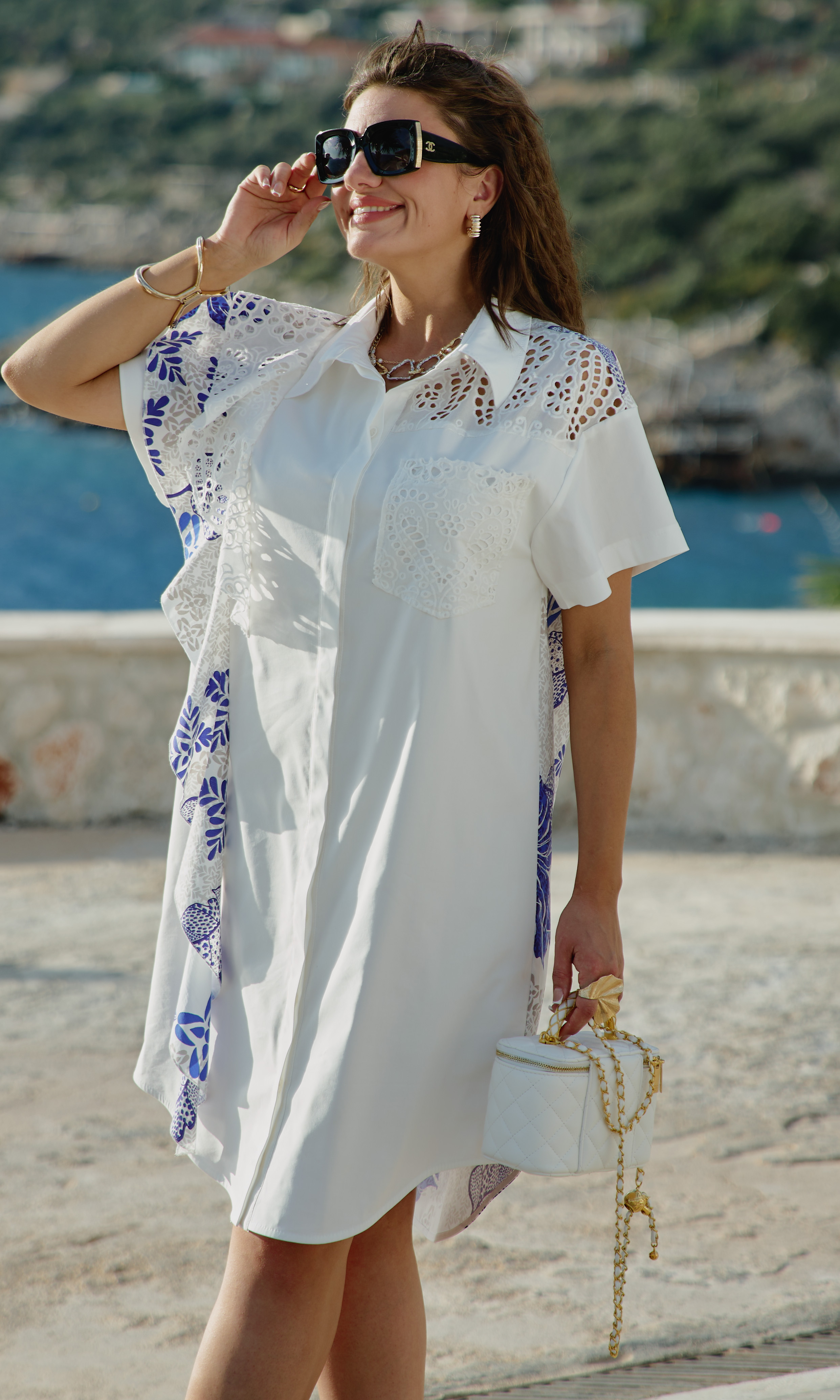 Состав: 71% хлопок, 27% полиэстер, 2% эластан, подкладка 100% хлопок. Платье - рубашка станет отличным дополнением в вашем гардеробе. Невероятно стильный комплект подчеркнет красоту вашей фигуры и скроет недостатки. Отличный вариант на лето, который также можно стилизовать делая образ ещё более ярким. Невероятно красивый яркий принт в гармоничном сочетании с белым оттенком в данной модели перенесёт Вас на юг Италии и создаст образ, который будет приковывать внимание. Платье-рубашка прямого силуэта, с центральной потайной застёжкой на петли-пуговицы по планке, отложным воротником рубашечного типа. По левой части полочки отрезная кокетка «на просвет», а также накладной карман из отделочной ткани — вышивки ришелье. По правой детали полочки платья декоративная двойная рюша переходящая на спинку платья из отделочных тканей— вышивки ришелье а так же ткани с акцентным принтом. Перёд платья на подкладке. Линия плеча в платье спущенная. Рукав втачной, короткий. Спинка в платье без особенностей, из отделочной ткани с акцентным принтом. Низ в платье фигурный, ассиметричный. Длина платья 110 см (р 50-54), 112,5 см (р 56-60).