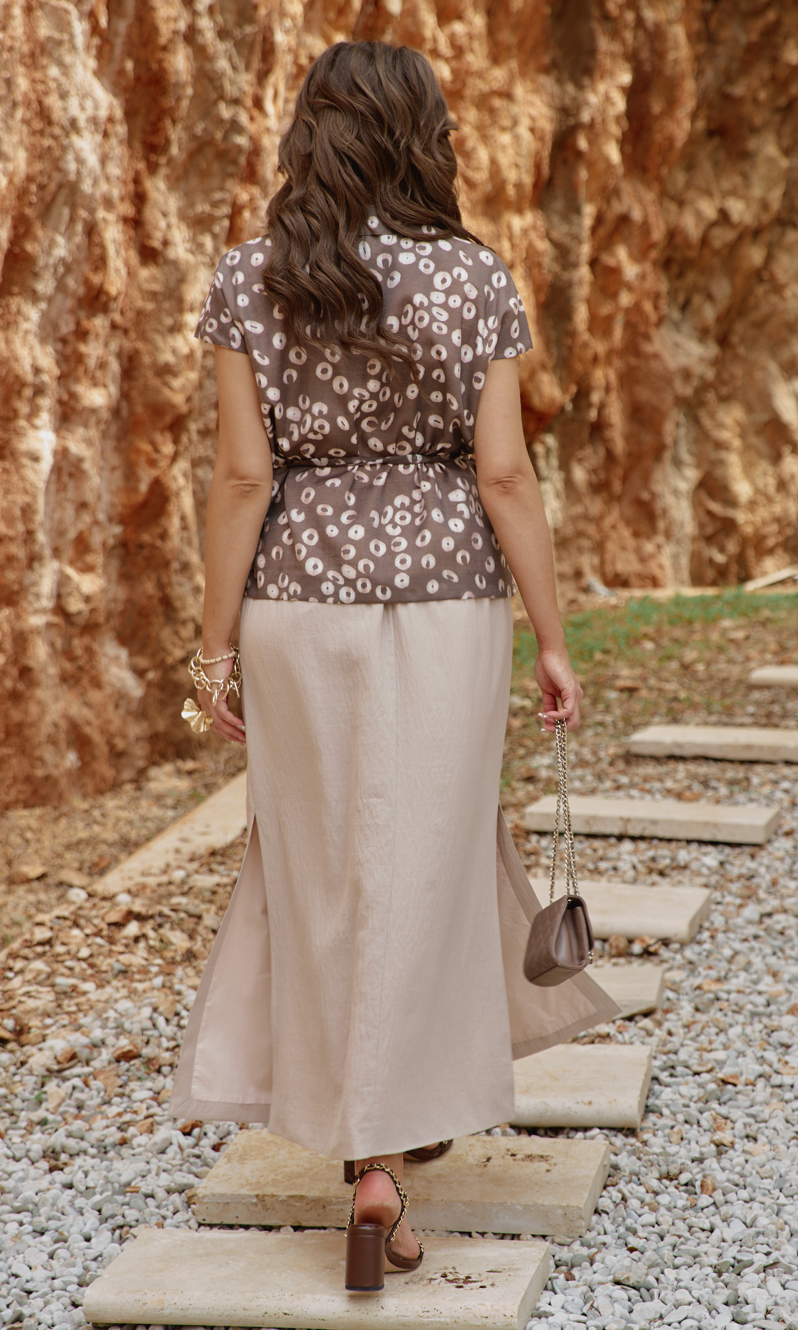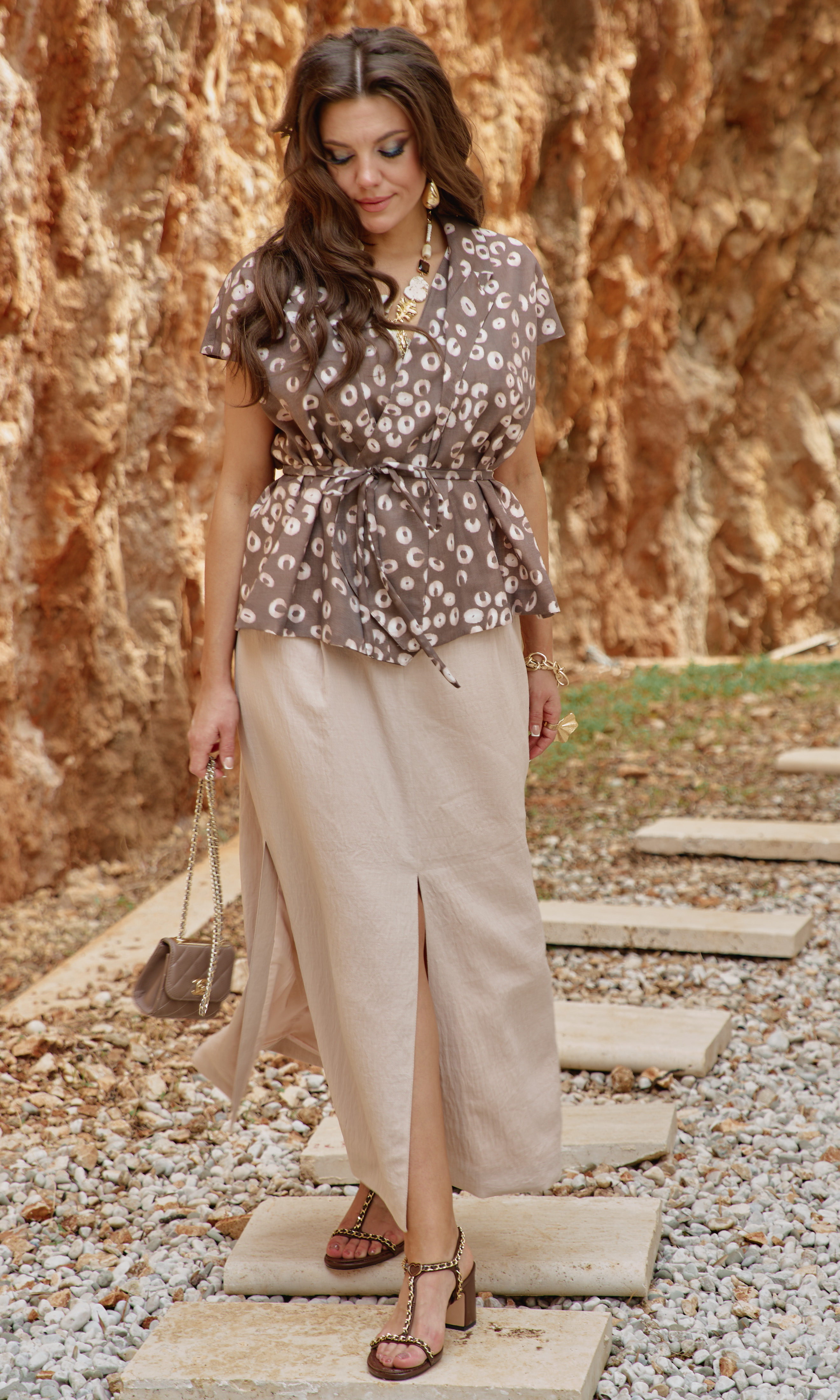 Состав: жакет 76% тенсел 24% полиэстер, подкладка 100% вискоза; юбка 100% полиэстер, подкладка 100% вискоза. Летний комплект из жакета в ткани вуаль с принтом горохом и юбки ""в пол"" с разрезами — это больше, чем просто одежда. Он подходит для женщины, которая не боится быть замеченной, но делает это с изяществом. Для той, кто понимает, что настоящая смелость — не в кричащих деталях, а в гармонии противоположностей. Жакет свободного силуэта, на «запах» с фигурной линией борта, и акцентным элементом в виде декоративных лацканов переходящих в воротник. Запах — это не просто застежка, он создает динамичную асимметрию — одна сторона накладывается на другую, создавая живую, нестатичную форму. А также игру объемов — в зависимости от того, как завязан жакет, меняется его силуэт. Линия плеча в жакете спущенная, плечи плавно ниспадают, создавая расслабленный силуэт. Спинка без особенностей. В комплекте идёт декоративный пояс из основной ткани. Жакет на подкладке. Юбка длины «миди» А-силуэта служит фоном для акцентов — не перетягивает внимание на себя. По переднему полотнищу юбки имитация гульфика, застроченные складки и декоративные шлёвки. Пояс в юбке на обтачке. В боковом шве юбки застёжка на тесьму-молнию. По спинке вставка эластичной тесьмы-резинки для максимально удобной посадки на фигуру. В среднем шве переда юбки и боковых швах высокие разрезы от низа. Юбка на подкладке. Длина жакета 64 см. Длина юбки 94 см.