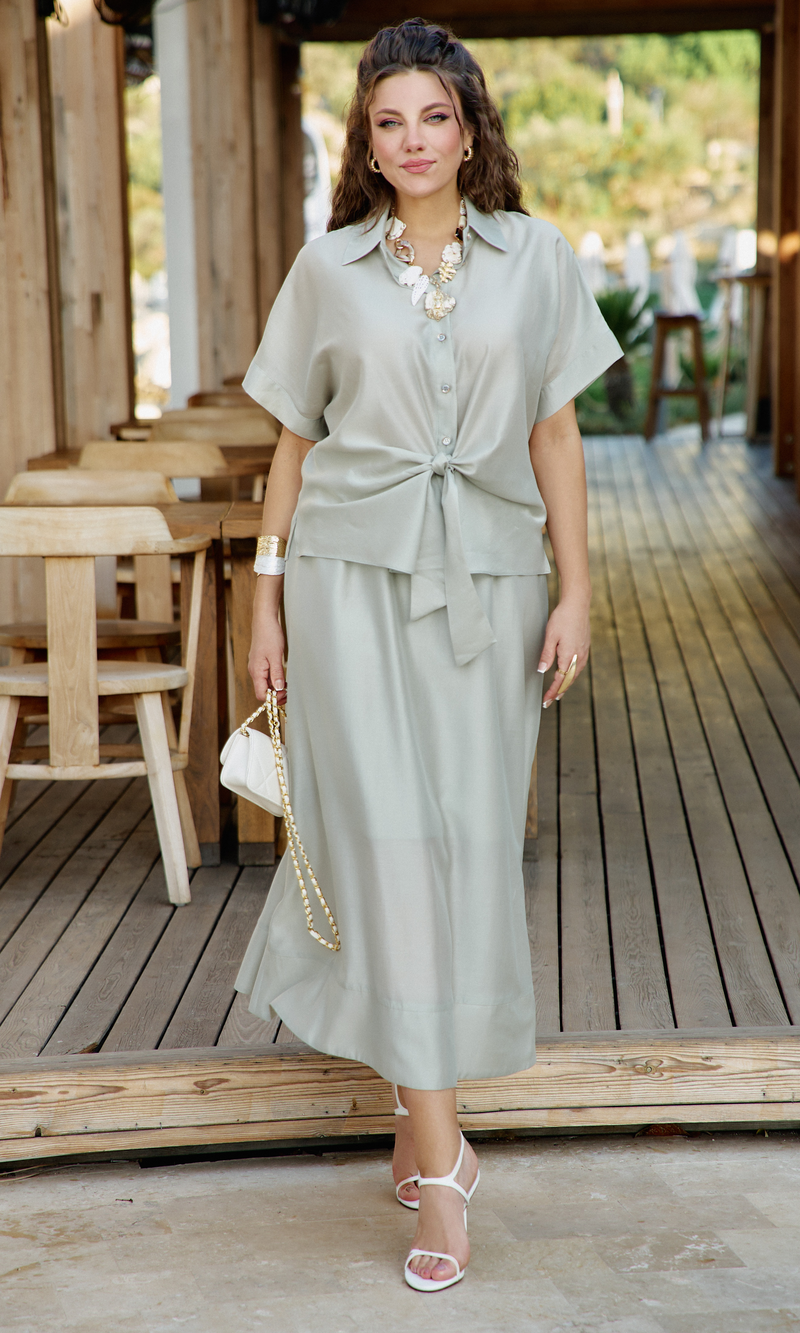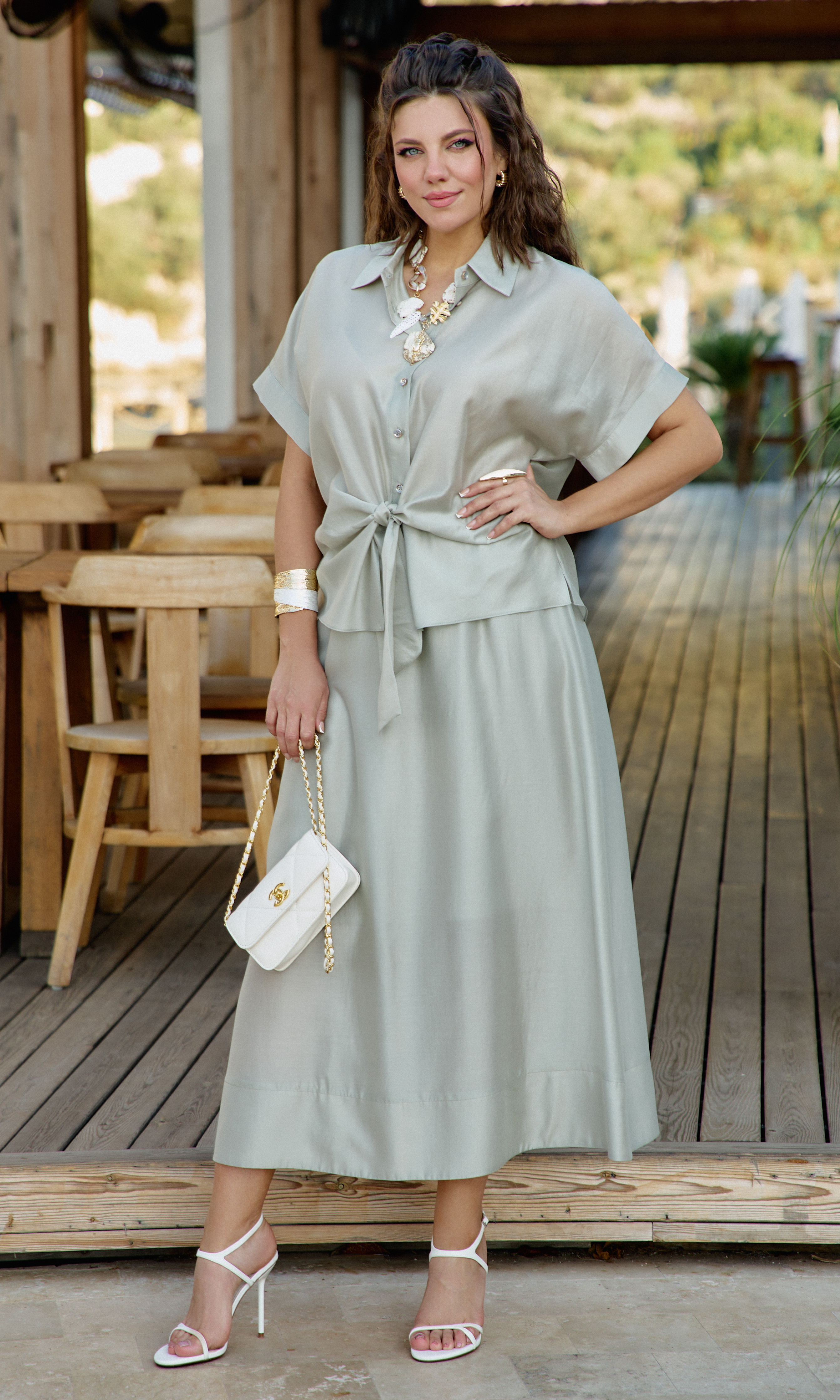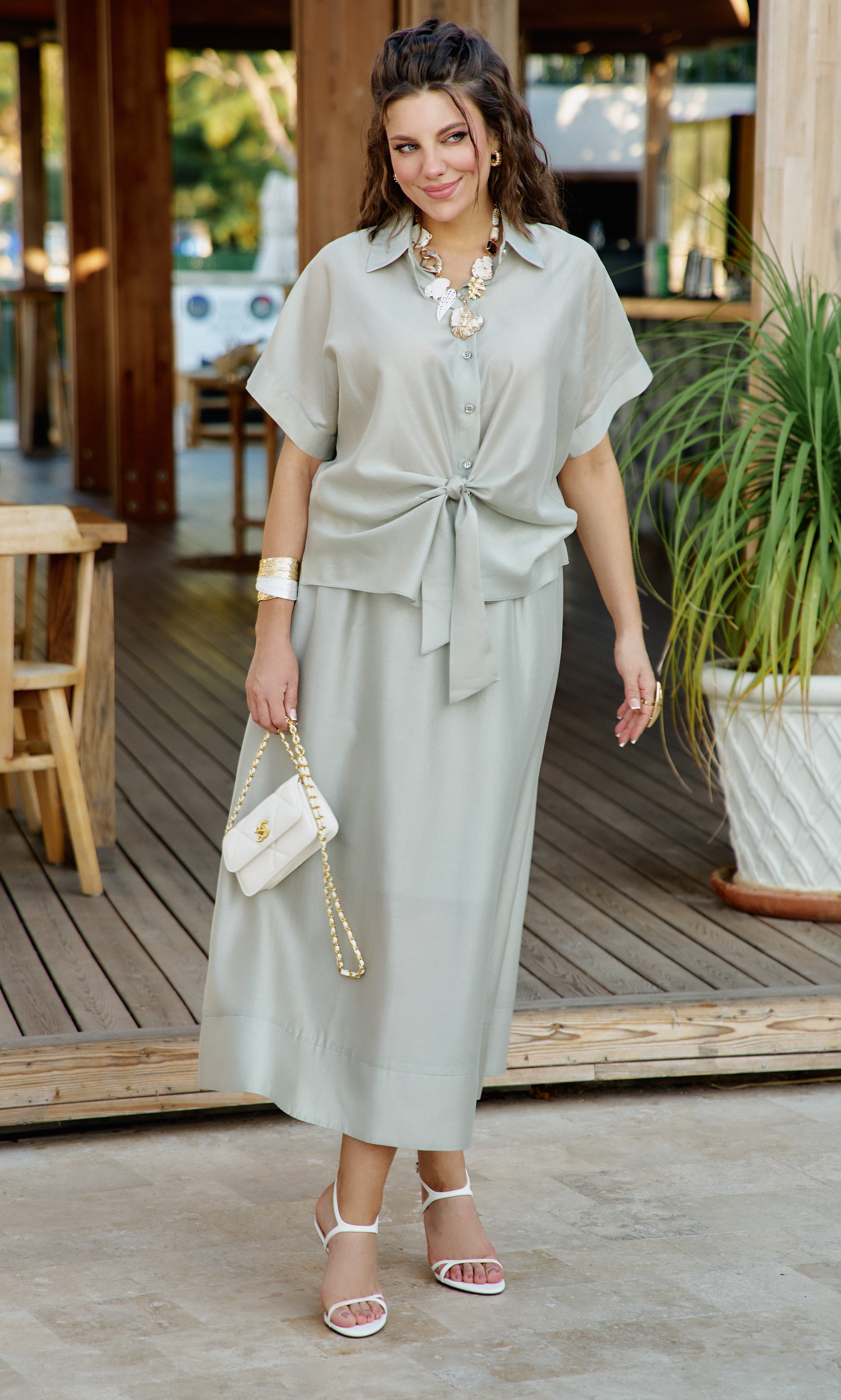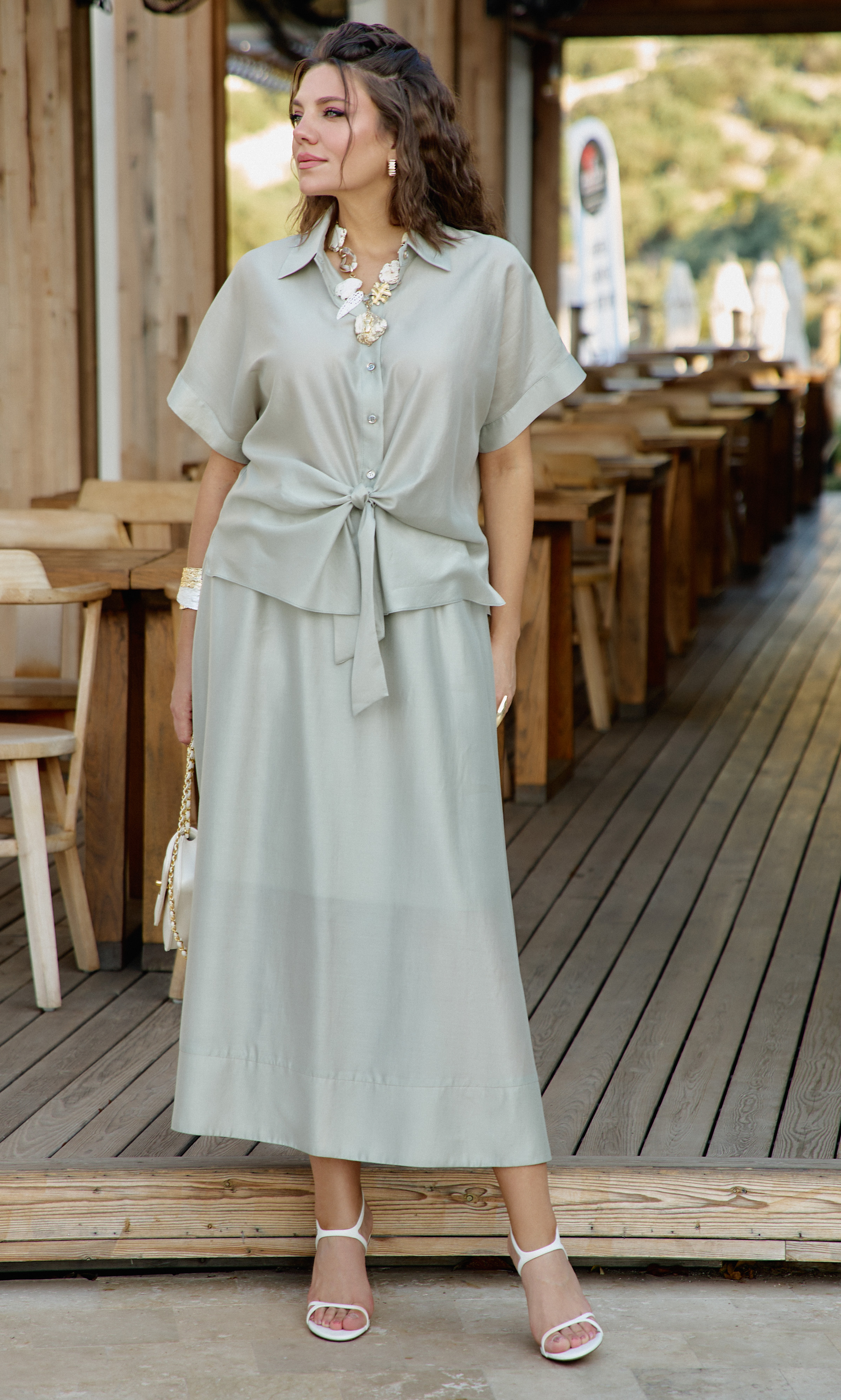 Состав: 85% тенсел, 15% полиэстер. Этот костюм — не просто одежда. Это состояние души. Он для тех, кто: ценит естественную красоту без излишней демонстративности, любит чувствовать лёгкость и свободу в одежде, понимает элегантность минимализма, наслаждается тактильными ощущениями от качественных тканей. Он одинаково уместен на летней веранде кафе, на прогулке по набережной, на творческой встрече или романтическом свидании. Это одежда, которая не кричит о себе, но притягивает взгляды своей гармонией и безупречным вкусом. Полупрозрачная, летящая ткань создаёт иллюзию невесомости и лёгкой таинственности. Блузка с центральной застёжкой на декоративные петли-пуговицы по планке, с воротником рубашечного типа. Её свободный крой обволакивает фигуру, не стесняя, а подчёркивая её естественные линии. Рукав в блузке цельнокроеный с притачной манжетой по низу. По переду блузки цельнокроеные отрезные детали завязывающиеся на бант. Спинка с отрезной кокеткой. В боковых швах блузки разрезы. Юбка трапеция начинается от естественной линии талии и мягко расширяется к подолу, создавая идеальный силуэт для летнего дня. Её форма одновременно структурирована и свободна: чёткие линии кроя сочетаются с текучестью материала. Длина юбки — до середины икры или чуть ниже, позволяя демонстрировать изящные лодыжки и удобную летнюю обувь. При ходьбе юбка образует красивые волны, её полы расходятся, обнажая мгновениями ногу, чтобы тут же снова сомкнуться в элегантном движении. Пояс в юбке притачной, на эластичной тесьме-резинке, что обеспечивает максимально удобную посадку на любой тип фигуры, по низу притачная деталь в сгиб в виде планки. Юбка на подкладке. Длина блузы 56 см (р 50-54), 57,5 см (р 56-60), длина рукава 32 см (р 50-54), 33 см (р 56-60). Длина юбки 87 см.