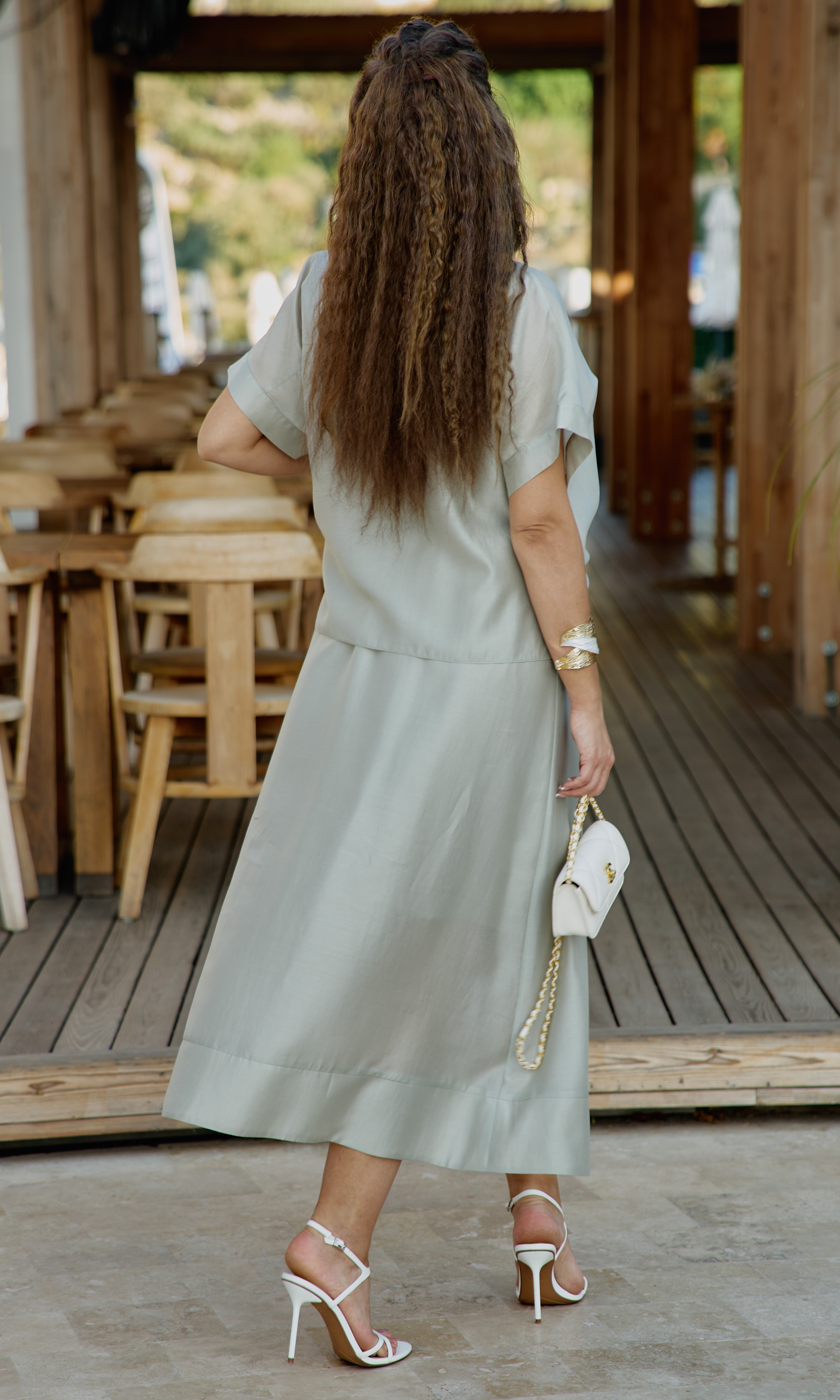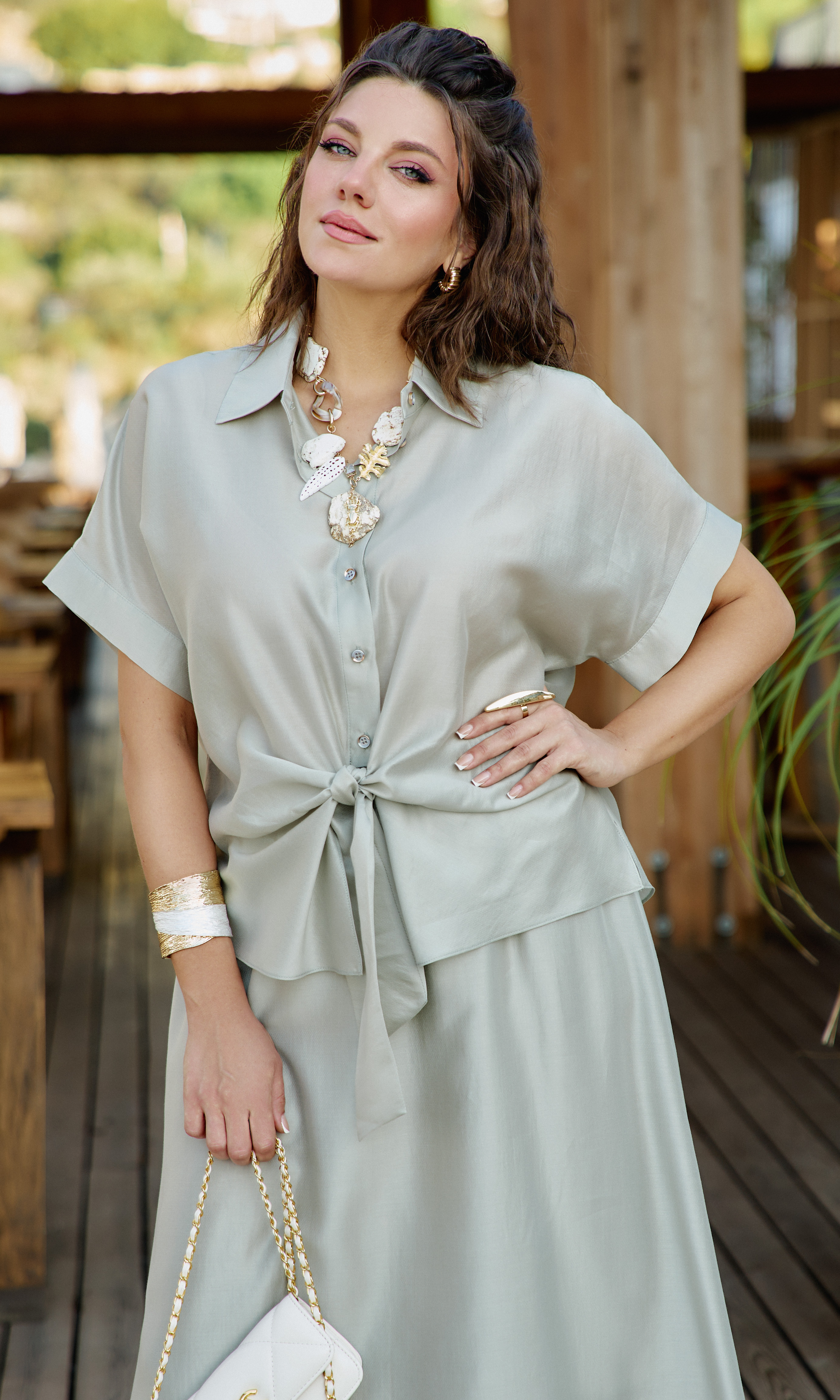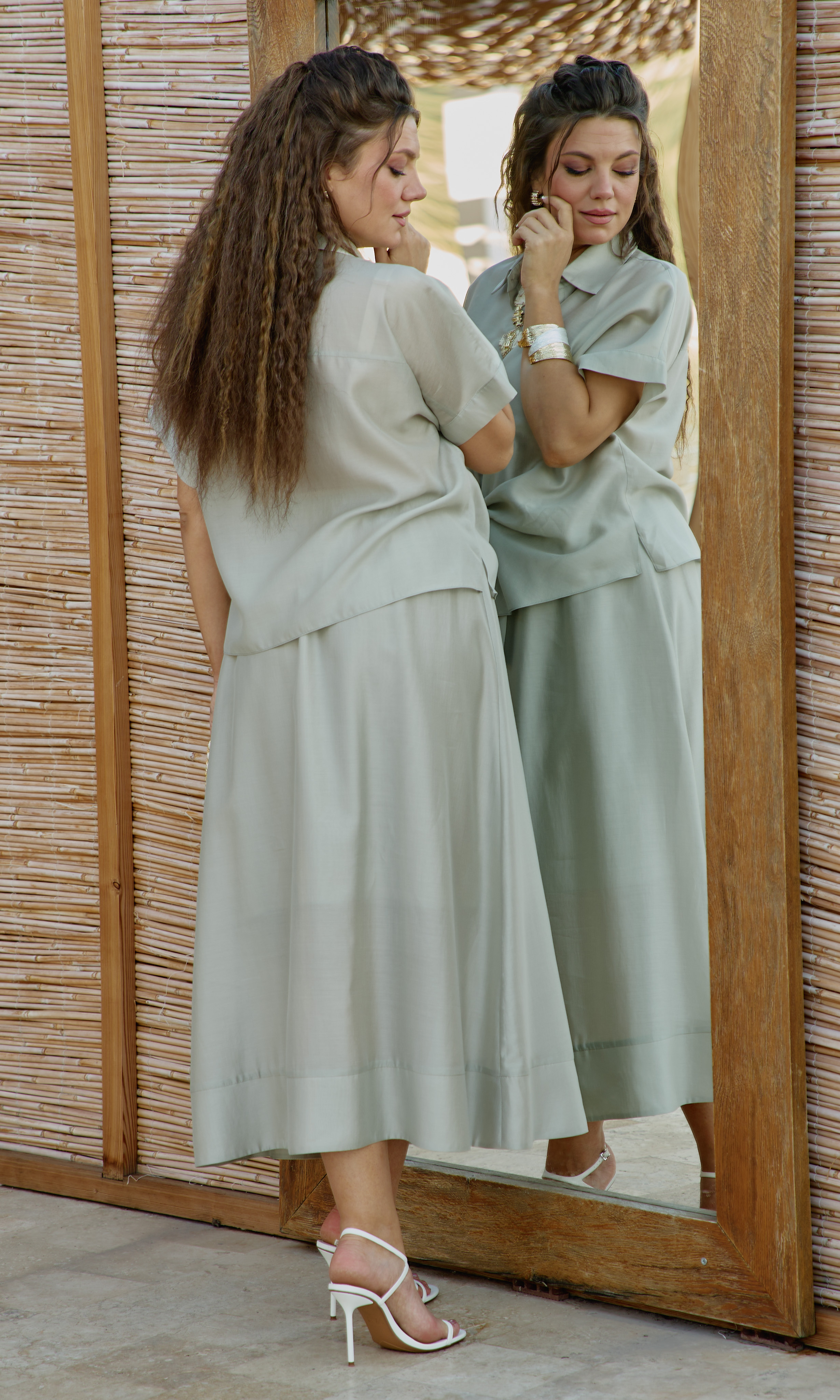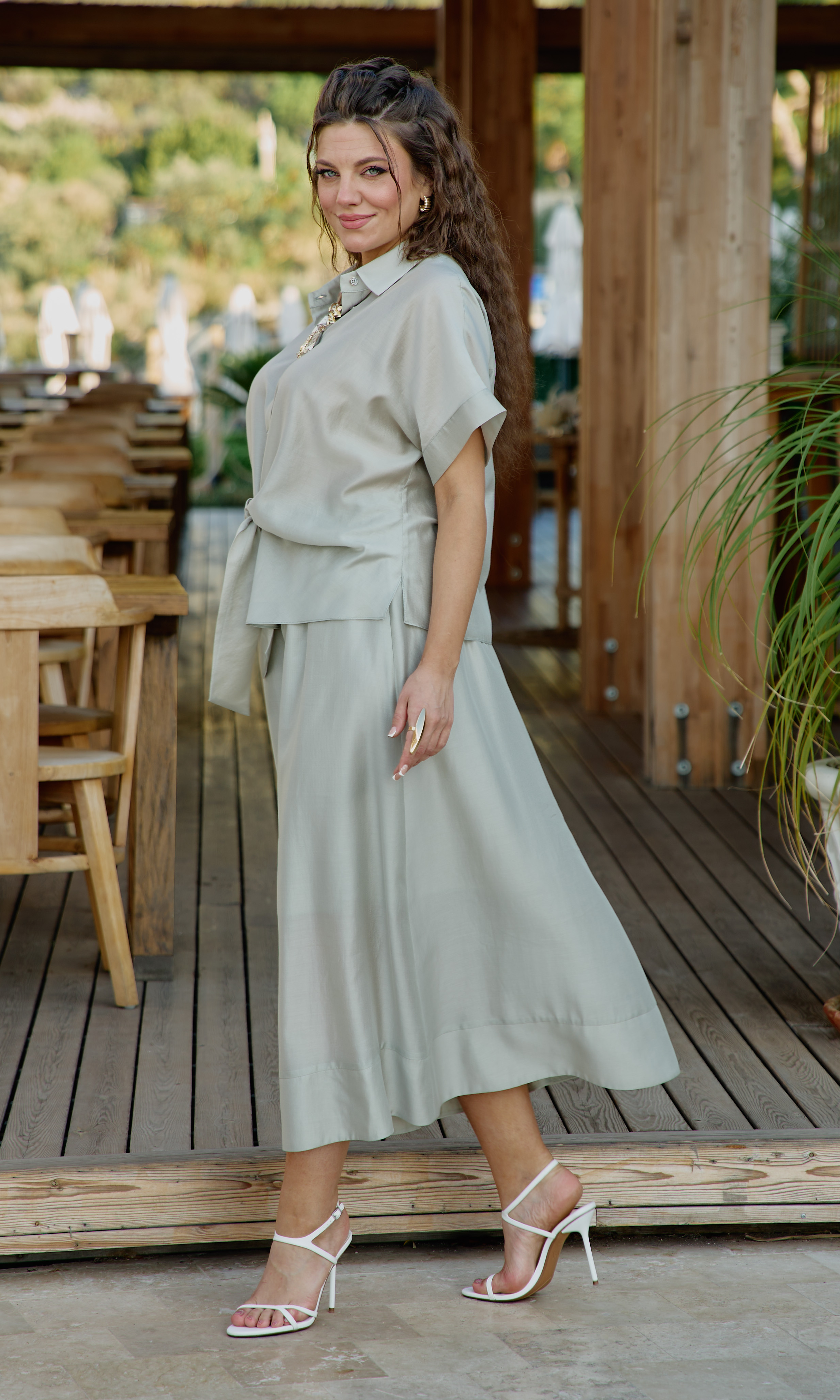 Состав: 85% тенсел, 15% полиэстер. Этот костюм — не просто одежда. Это состояние души. Он для тех, кто: ценит естественную красоту без излишней демонстративности, любит чувствовать лёгкость и свободу в одежде, понимает элегантность минимализма, наслаждается тактильными ощущениями от качественных тканей. Он одинаково уместен на летней веранде кафе, на прогулке по набережной, на творческой встрече или романтическом свидании. Это одежда, которая не кричит о себе, но притягивает взгляды своей гармонией и безупречным вкусом. Полупрозрачная, летящая ткань создаёт иллюзию невесомости и лёгкой таинственности. Блузка с центральной застёжкой на декоративные петли-пуговицы по планке, с воротником рубашечного типа. Её свободный крой обволакивает фигуру, не стесняя, а подчёркивая её естественные линии. Рукав в блузке цельнокроеный с притачной манжетой по низу. По переду блузки цельнокроеные отрезные детали завязывающиеся на бант. Спинка с отрезной кокеткой. В боковых швах блузки разрезы. Юбка трапеция начинается от естественной линии талии и мягко расширяется к подолу, создавая идеальный силуэт для летнего дня. Её форма одновременно структурирована и свободна: чёткие линии кроя сочетаются с текучестью материала. Длина юбки — до середины икры или чуть ниже, позволяя демонстрировать изящные лодыжки и удобную летнюю обувь. При ходьбе юбка образует красивые волны, её полы расходятся, обнажая мгновениями ногу, чтобы тут же снова сомкнуться в элегантном движении. Пояс в юбке притачной, на эластичной тесьме-резинке, что обеспечивает максимально удобную посадку на любой тип фигуры, по низу притачная деталь в сгиб в виде планки. Юбка на подкладке. Длина блузы 56 см (р 50-54), 57,5 см (р 56-60), длина рукава 32 см (р 50-54), 33 см (р 56-60). Длина юбки 87 см.
