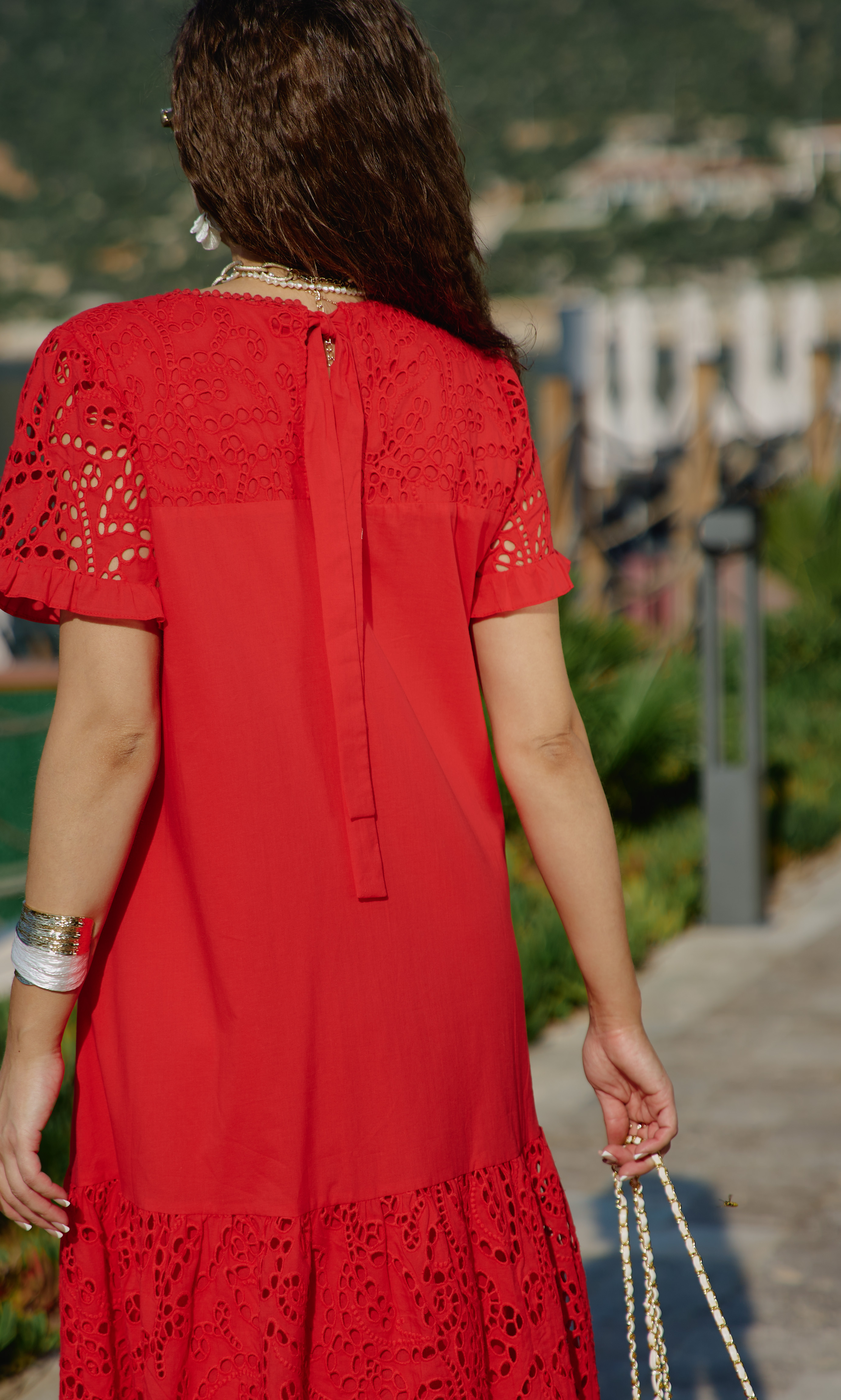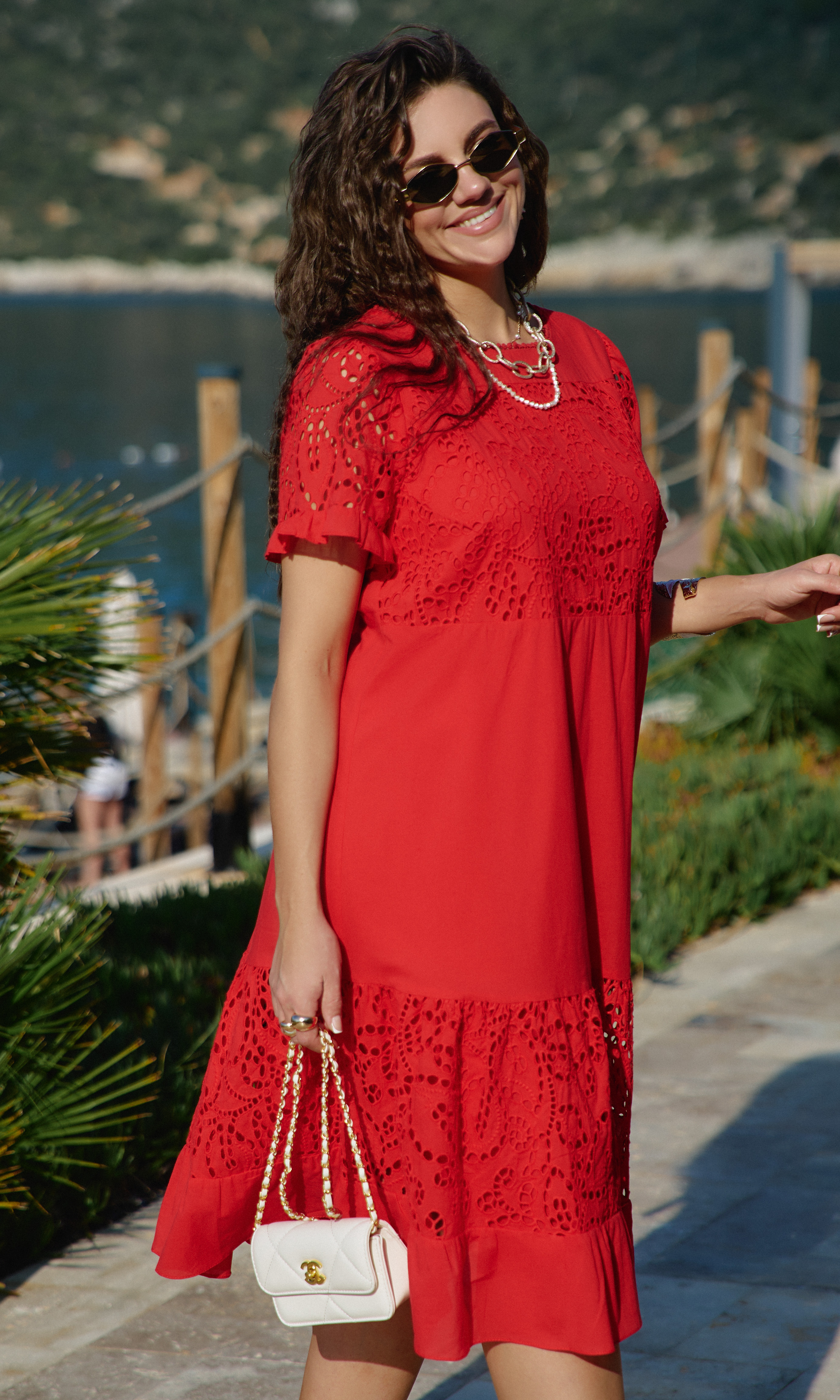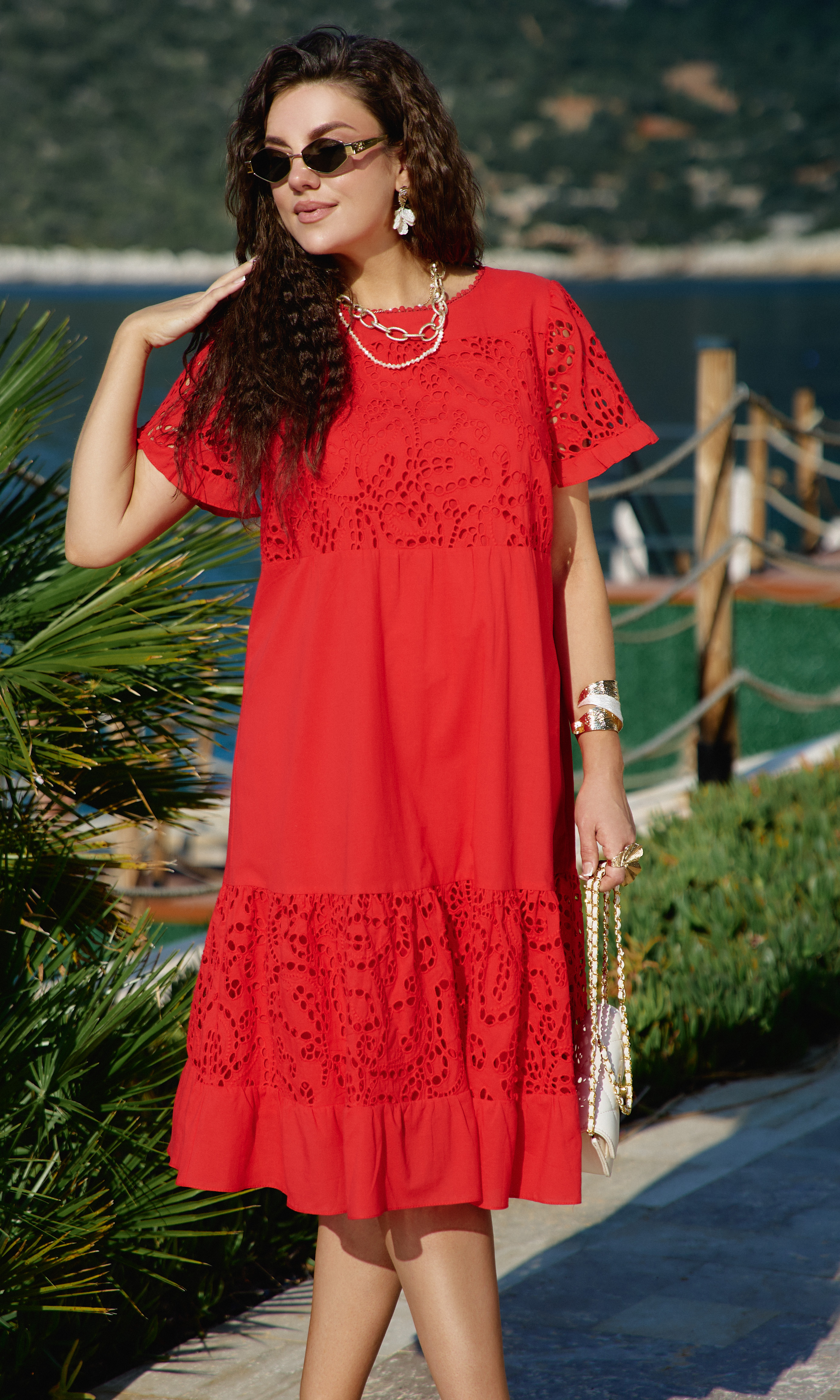 Состав: 100% хлопок, подкладка 100% хлопок. Очень красивое и яркое платье с вышивкой ришелье на хлопке придаст вашему образу игривости и легкости, создает кокетливый и романтичный образ! Эта легкость и свобода создают ощущение, что облачаясь в это платье, ты становишься частью летнего дня. Гармоничное сочетание ткани с вышивкой ришелье и однотона привлекает внимание и восхищает. Огромным достоинством этого платья становятся вставки из ришелье — изысканного ажурного кружева. Платье свободного силуэта, с округлой формой горловины оформленной декоративным кружевом; декоративной вставкой из ришелье по переду платья, подрезом с небольшой сборкой выше уровня талии. По низу платья декоративная вставка из ткани вышивки-ришелье со сборкой от подреза, и притачной однотонный волан со сборкой от подреза. Рукав в платье втачной из ришелье «на просвет», с притачной однотонной рюшей по низу. Спинка в платье с отрезной кокеткой из отделочной ткани ришелье, фигурным вырезом с декоративными лентами завязывающимися на бант. Длина платья 106 см (р 52-56), 107 см (р 58-62). Длина рукава 20 см (р 52-56), 21 см (р 58-62).