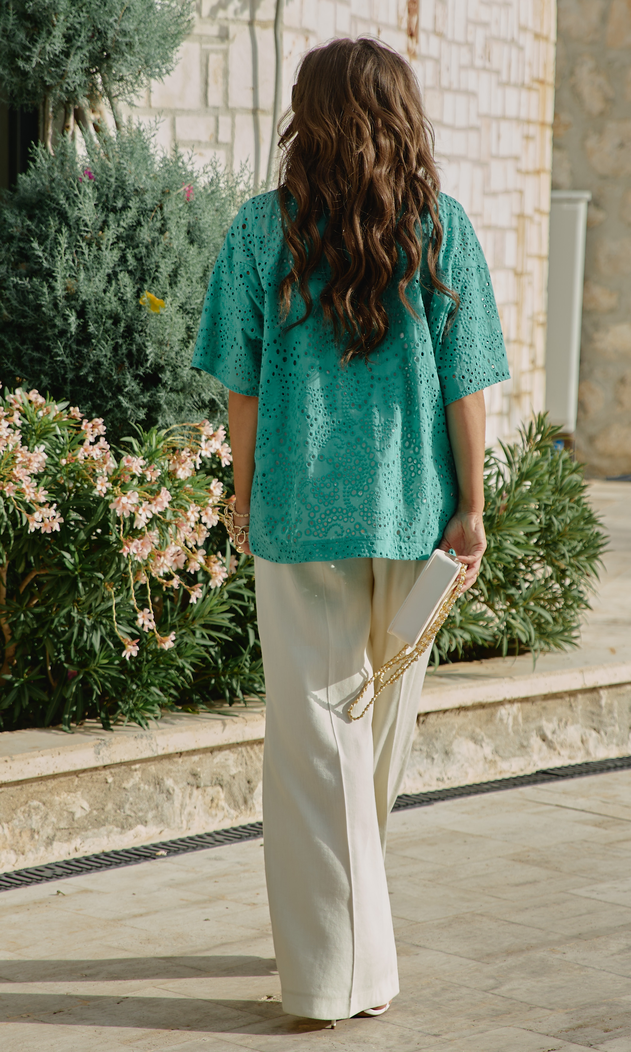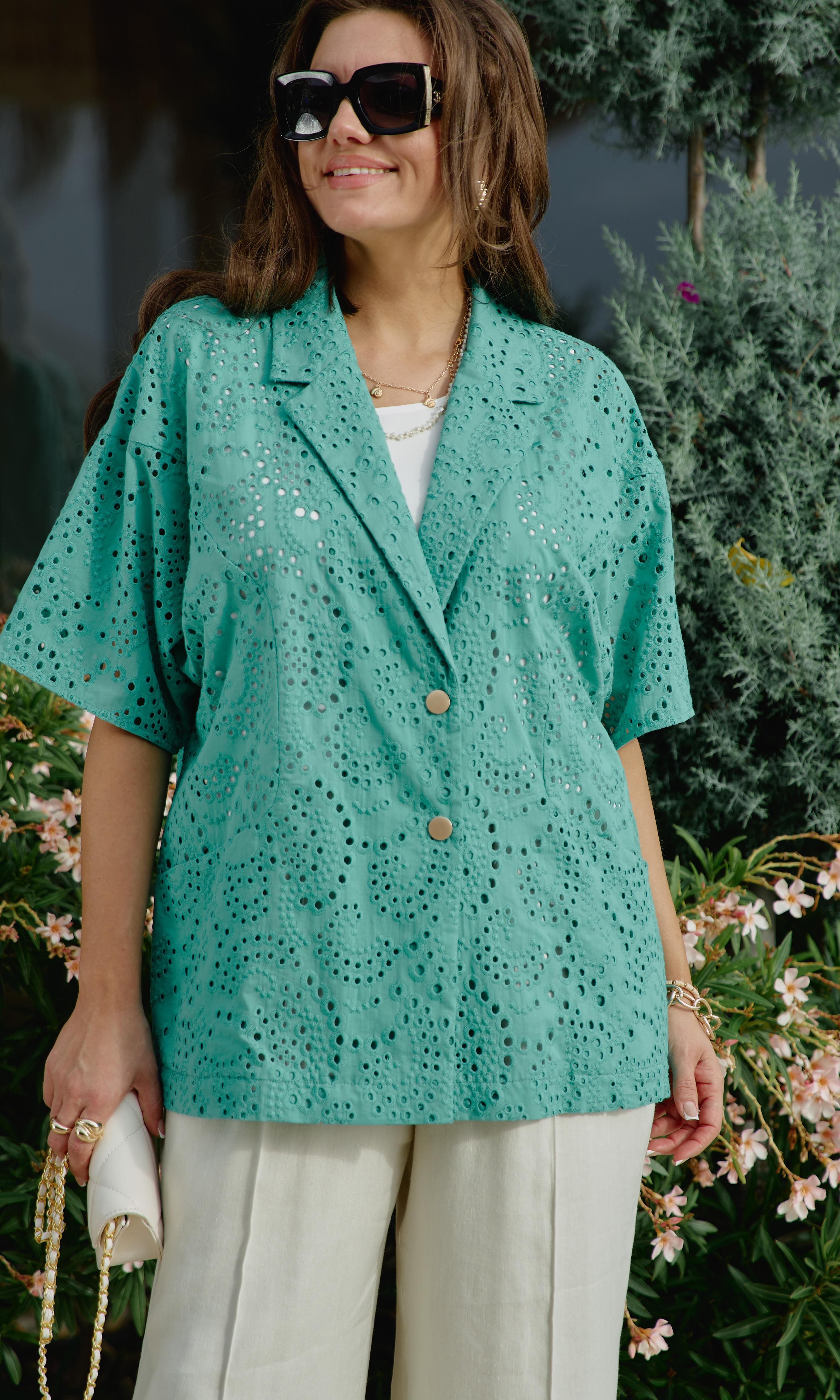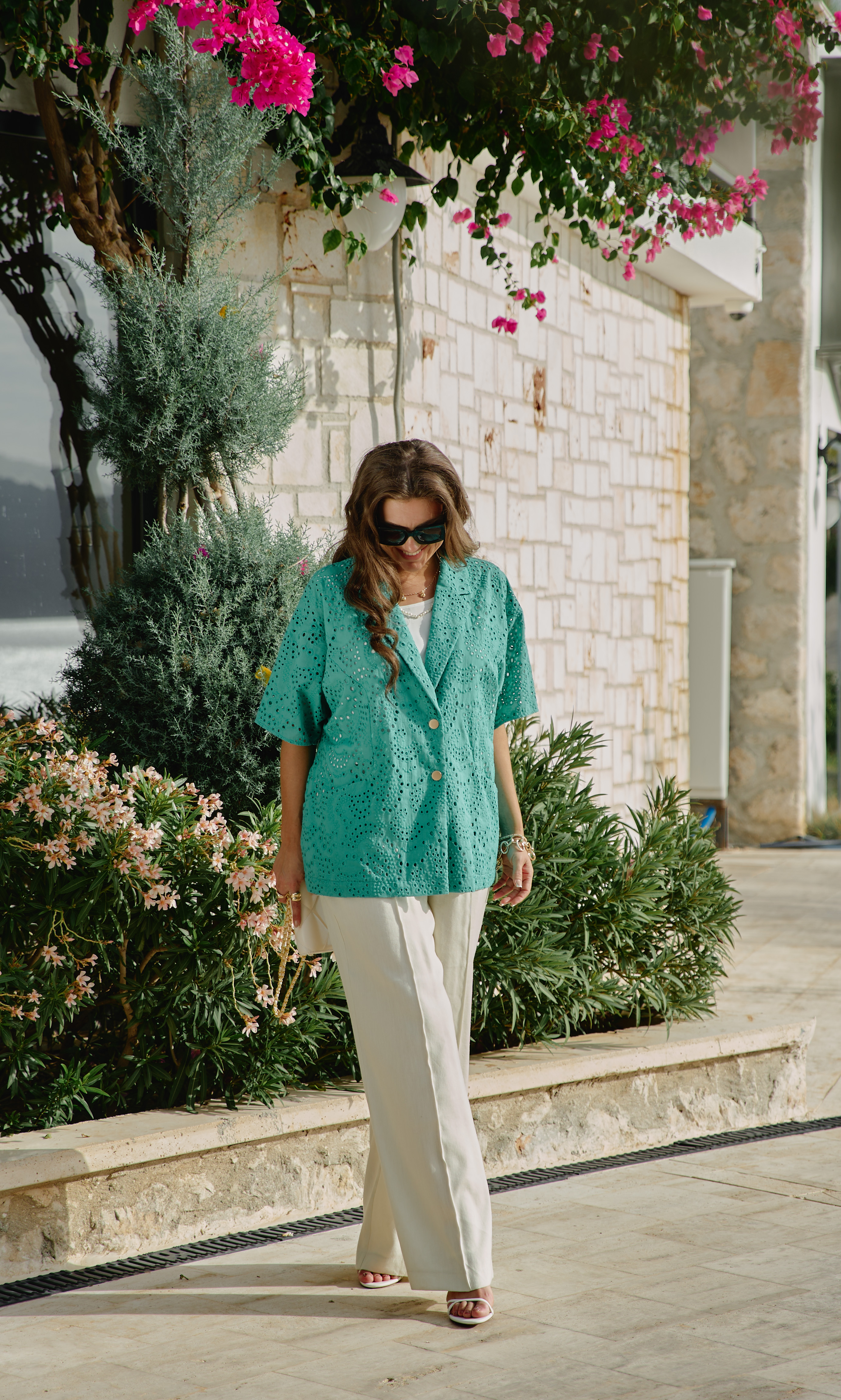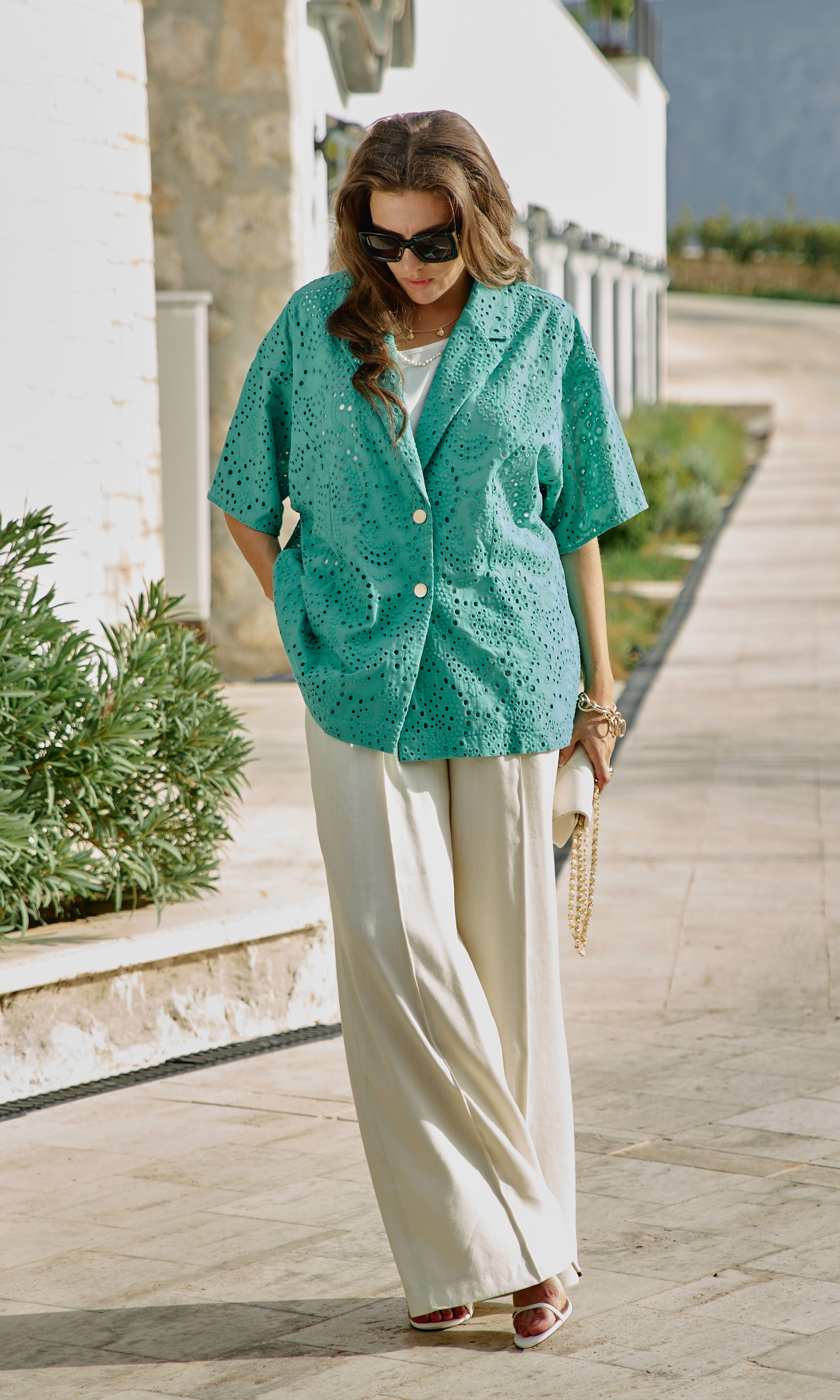 Состав: жакет 100% хлопок, брюки 55% лен, 45% вискоза. Костюм двухсоставной из жакета и брюк летний в тренде сезона на каждый день из кружевного хлопка Ришелье в жакете, льна и вискозы в брюках. Жакет небольшого объема полуприлегающего силуэта. Пластическая форма мягкая, плавная. Жакет однобортный без подкладки с застежкой на две металлические кнопки в оттенке матовое золото и классической формой лацкана и воротника. Плечевой пояс наклонный, с спущенным рукавом до локтя. Форма жакета по переду в верхней и средней части решена конструктивными линиями и рельефами, из которых выходят линии карманов. По спинке выполнен горизонтальный рельеф- кокетка с выходящими из него фигурными линиями рукава. Брюки прямого силуэта по переду с стрелками, застроченными декоративной строчкой нитками в цвет. Пояс отрезной на резинке по всей длине. По переду выполнены наклонные карманы классической формы от пояса к боковому шву. По низу отделочная строчка нитками в цвет ткани. Брючный костюм с базовыми брюками идеально впишется в ваш гардероб. Он идеально сядет на фигуру, модель комфортна натуральными материалами, она идеальна для летних прогулок, торжества. Брюки прекрасно сидят на талии, свободны по бедрам и широкие внизу, что визуально вытягивает фигуру и придает вам уверенности в каждом движении. Их удобно сочетать с другими предметами вашего гардероба от футболок в спортивным стиле до блузок. Жакет так же выгодно сочетается с юбкой или платьем. Длина жакета 73 см, длина рукава 44 см (р 52-56), 45 см (р 58-62). Длина брюк 108 см.