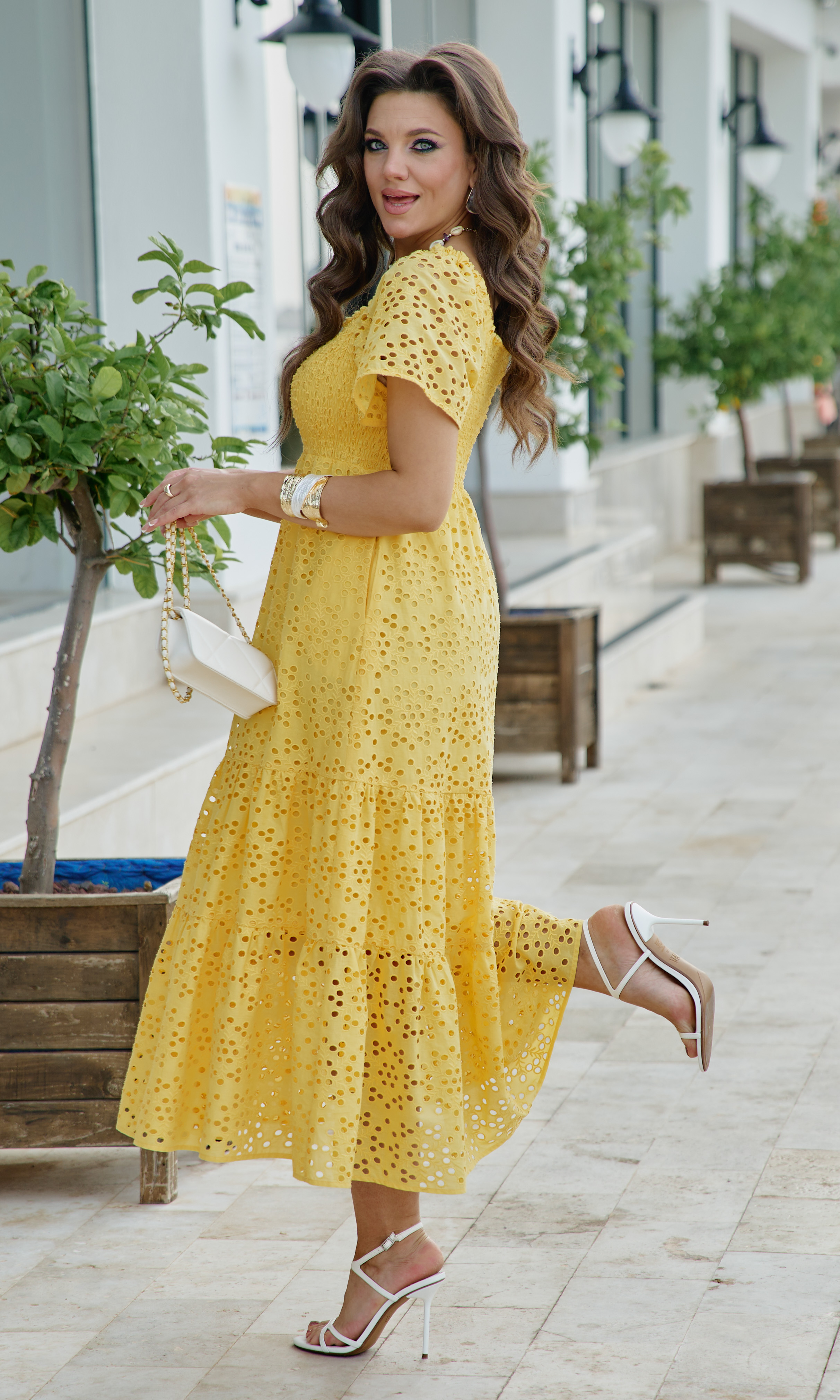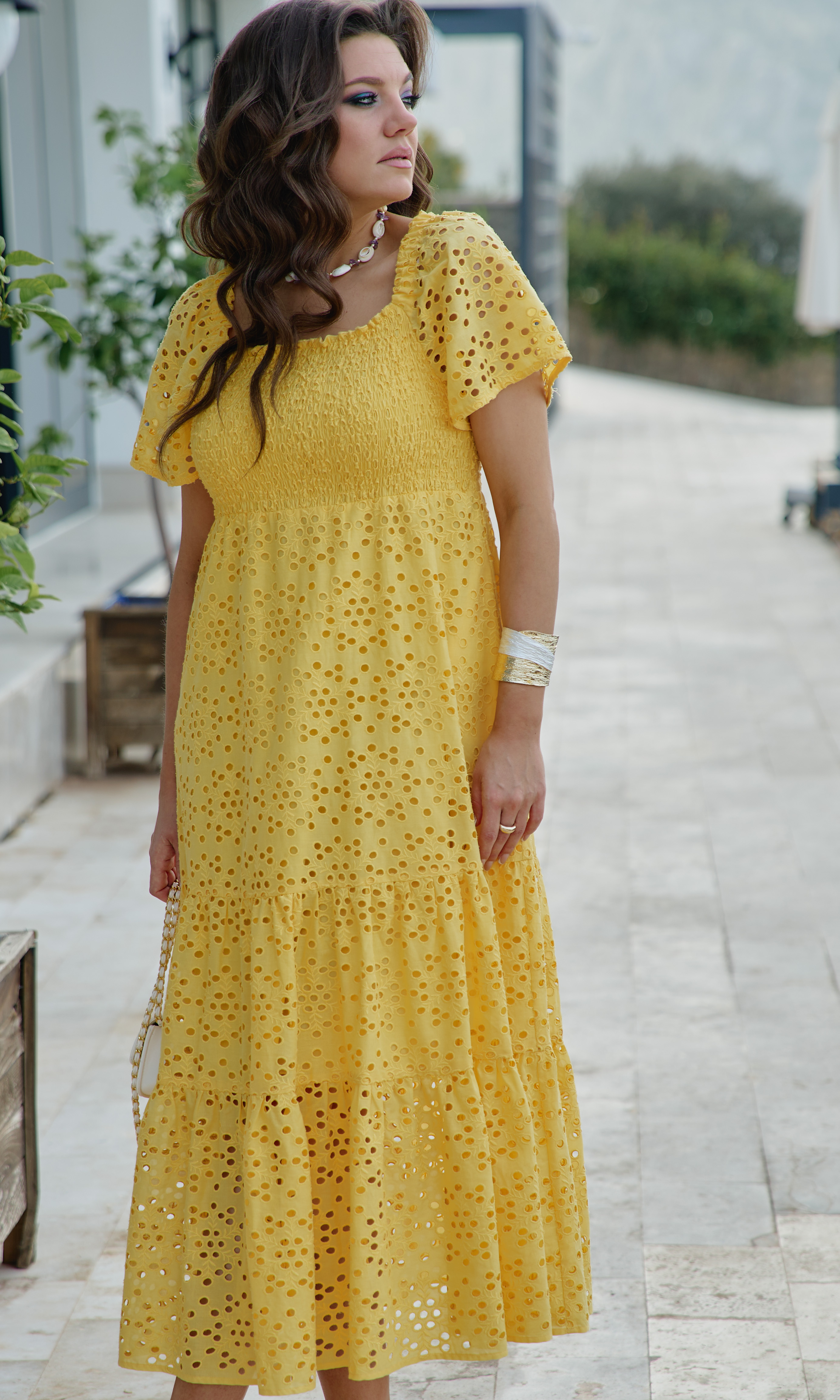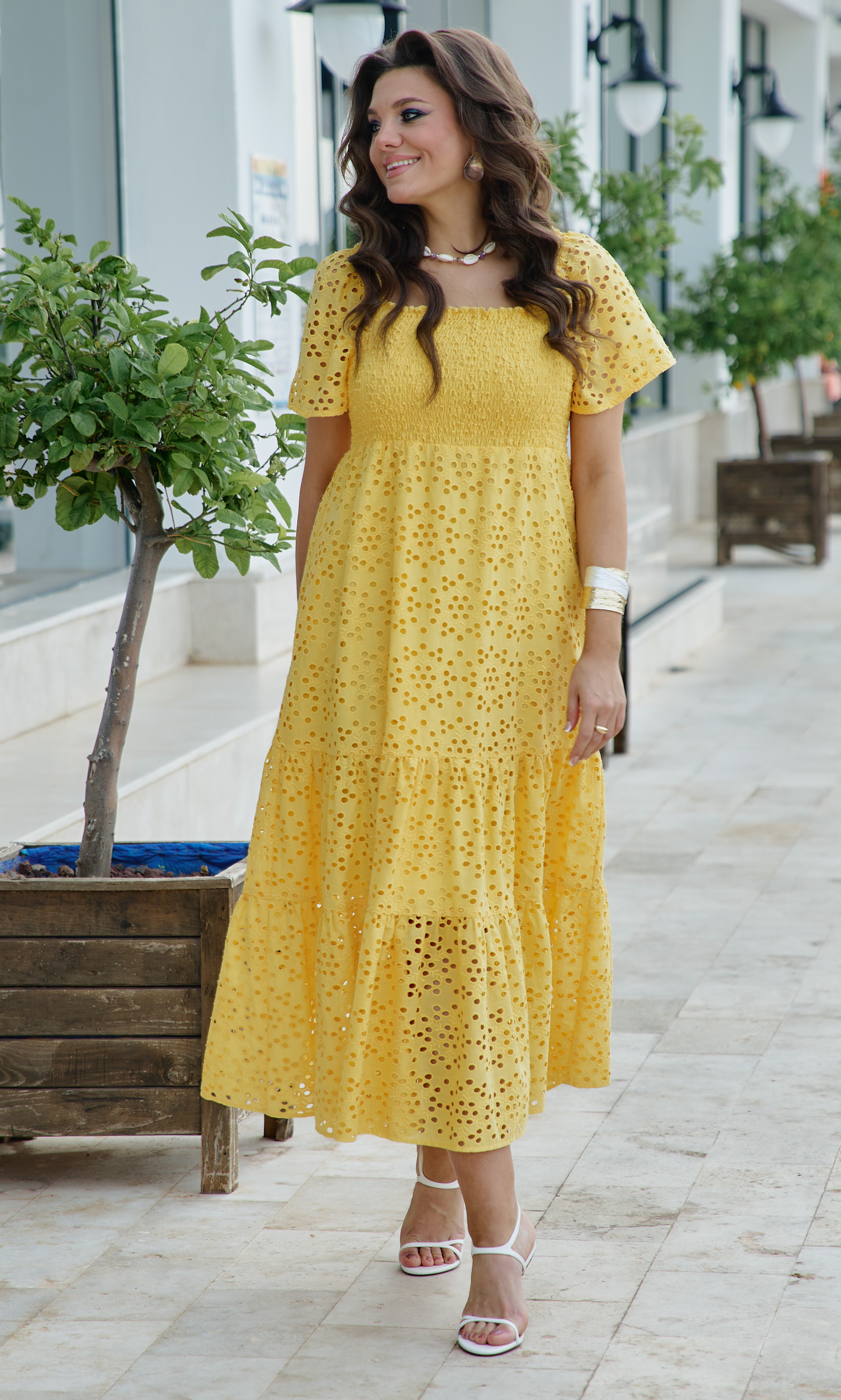 Состав: ткань верха 100% хлопок, подкладка 100% хлопок. Женское платье из ришелье, в ярком оттенке, является настоящим произведением искусства, создавая гармоничное сочетание, которое привлекает внимание и восхищает. Дополняя это платье аксессуарами, которые гармонично подчеркнут общий образ — Вы будете выглядеть изящно, чувствовать себя увереннее и привлекательнее в любой обстановке: будь то романтический вечер, встреча с подругами или прогулка по городу. Таким образом, женское платье из ришелье становится не просто предметом гардероба, а истинным символом стиля, элегантности и безупречного вкуса. Платье прилегающего силуэта с фигурным вырезом горловины. Лиф платья на венгерке, что обеспечивает максимально удобную посадку на любую фигуру, по окату рукава вставка из резинки на сборке. Рукав в платье короткий. В боковых швах платья карманы, по низу притачной волан со сборкой от подреза. Длина платья 121 см (р 50-54), 123 см (р 56-60). длина рукава 28,5 см (р 50-54), 30 см (р 56-60).