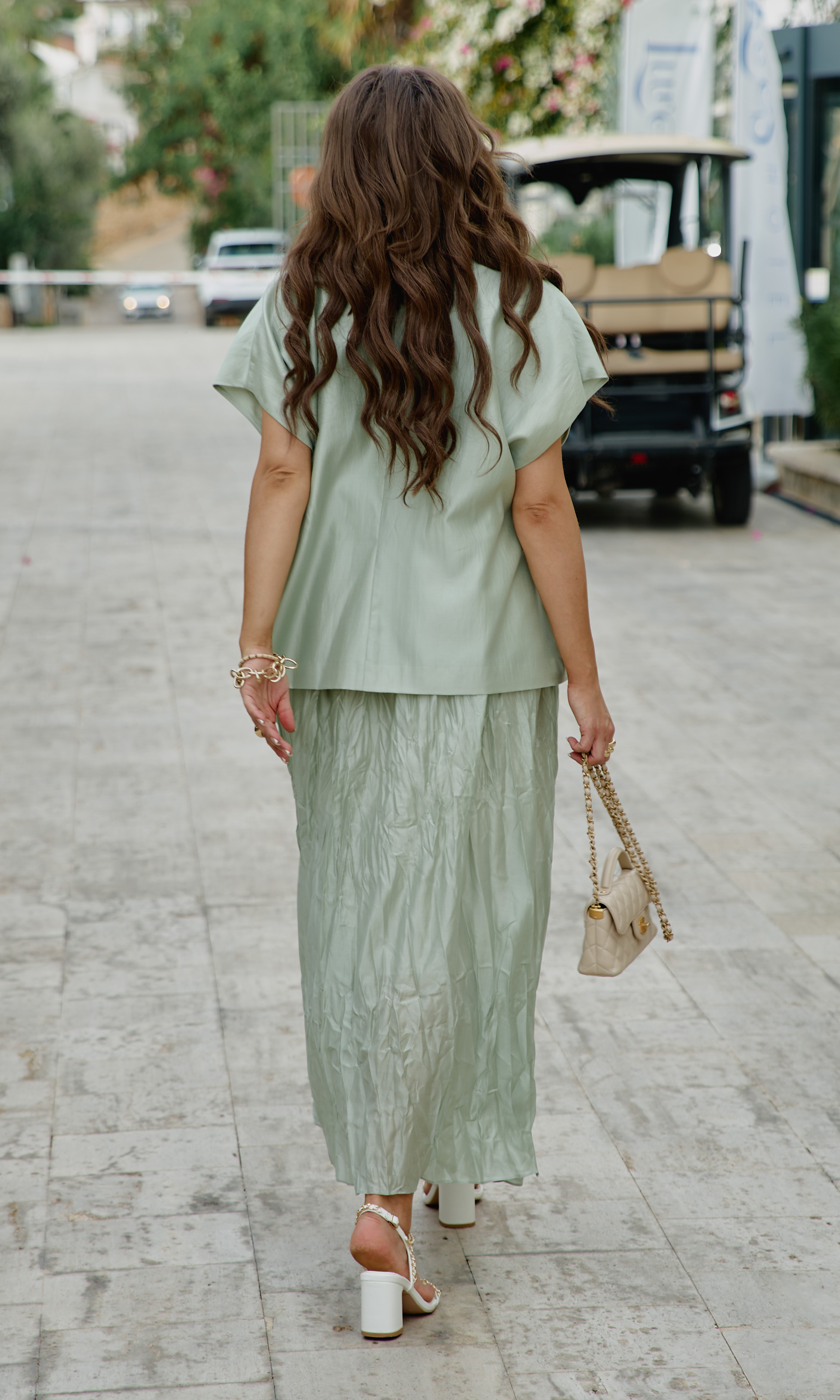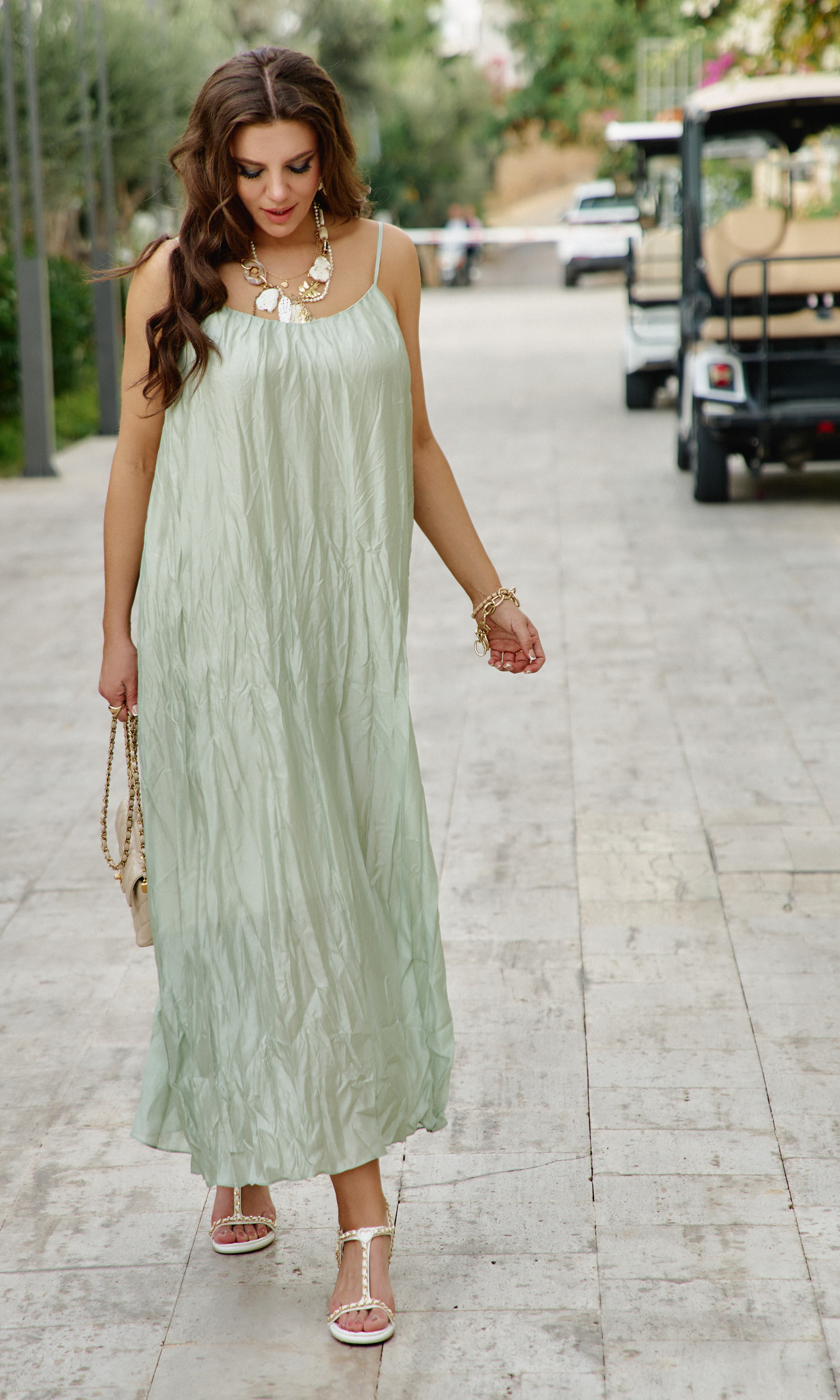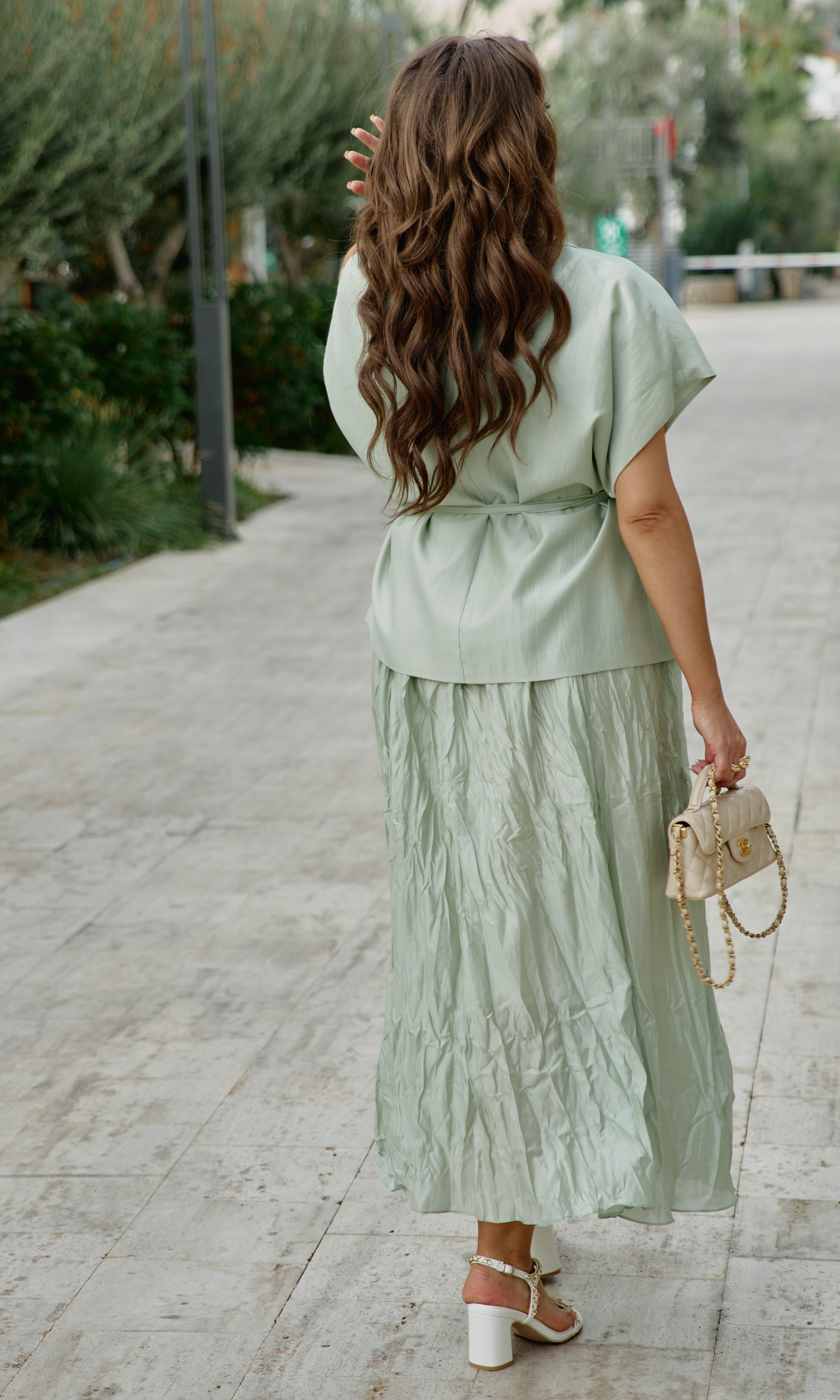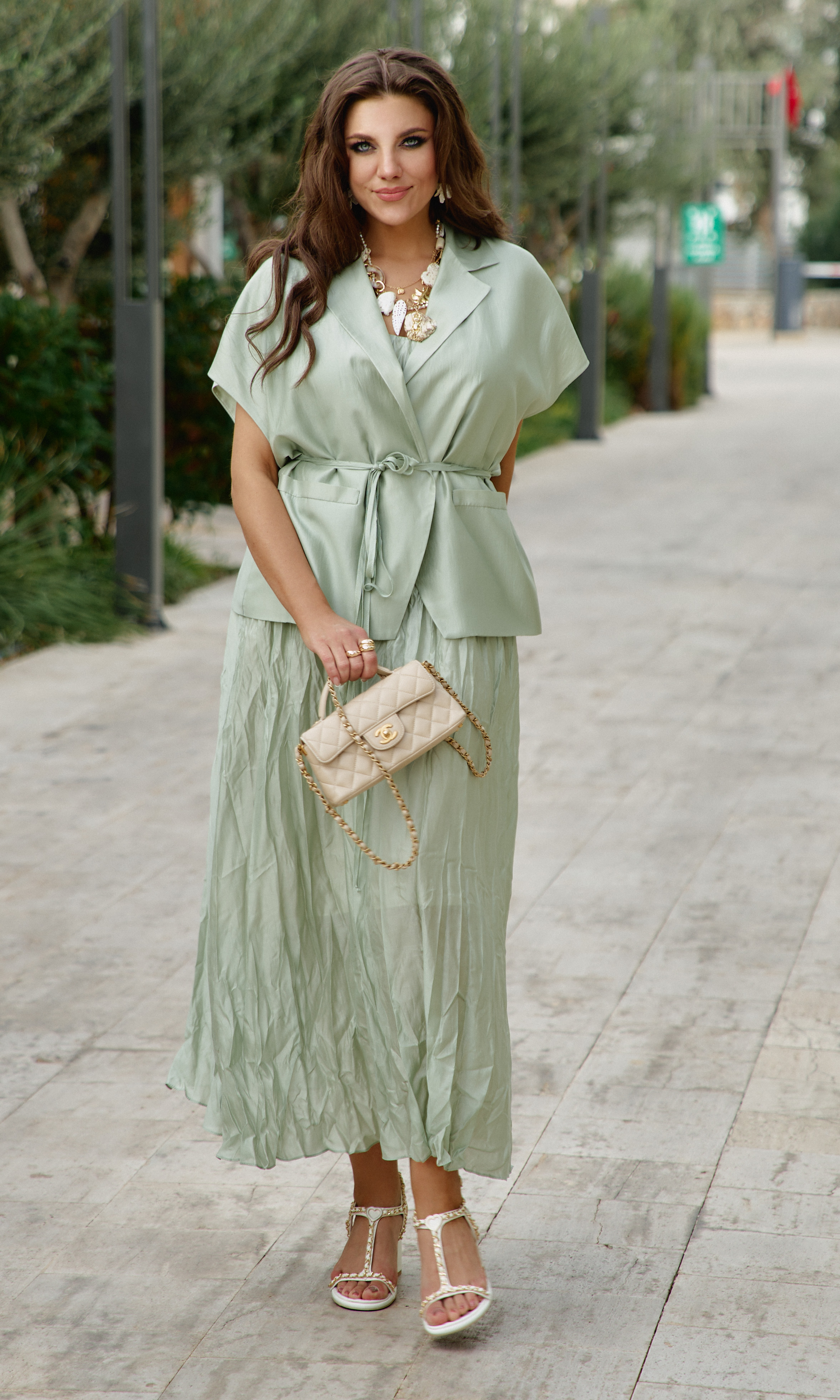 Состав: ткань верха 85% тенсел, 15% полиэстер, подкладка 100% вискоза. Комплект женский, состоящий из жилета и платья длины «миди» в нежном летнем оттенке. Контраст между гладкостью жилета и фактурностью платья создает визуальную глубину, делает образ интересным для рассмотрения с разных расстояний. Жилет свободного силуэта, на «запах» с фигурной линией борта. Запах — это не просто застежка, он создает динамичную асимметрию — одна сторона накладывается на другую, создавая живую, нестатичную форму. А также игру объемов — в зависимости от того, как завязан жилет, меняется его силуэт. Возможность трансформации — его можно носить плотно запахнутым или свободно, с открытыми полами. Воротник отложной, пиджачного типа. Линия плеча в жилете спущена. По переду жилета декоративные листочки. Спинка со средним швом. В комплекте идёт декоративный пояс из основной ткани. Платье с характерным "мятым" эффектом, который становится главной художественной деталью. Длина миди— золотая середина между скромностью и смелостью, позволяет свободно двигаться. Мятый эффект это не небрежность, а тщательно продуманный художественный прием. Она добавляет тактильности — хочется прикоснуться, ощутить эту "живую" текстуру, смягчает силуэт — делает образ менее формальным, более человечным. Платье длины миди с плавным едва уловимым V-образным вырезом декольте, на регулируемых бретелях. По спинки вставка эластичной тесьмы-резинки, что обеспечивает максимально удобное прилегание. Платье на подкладке. Длина жакета 68 см. Длина платья 134 см.