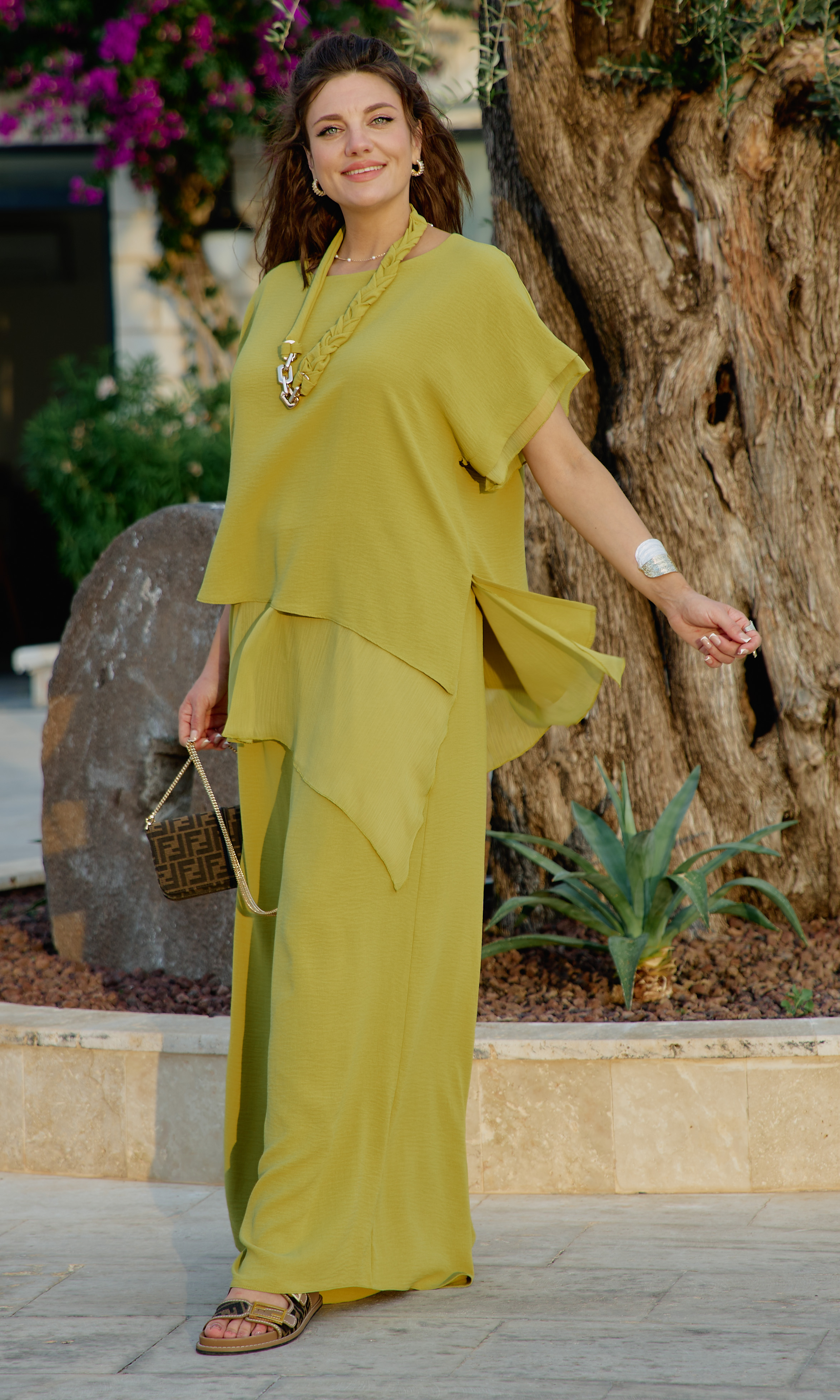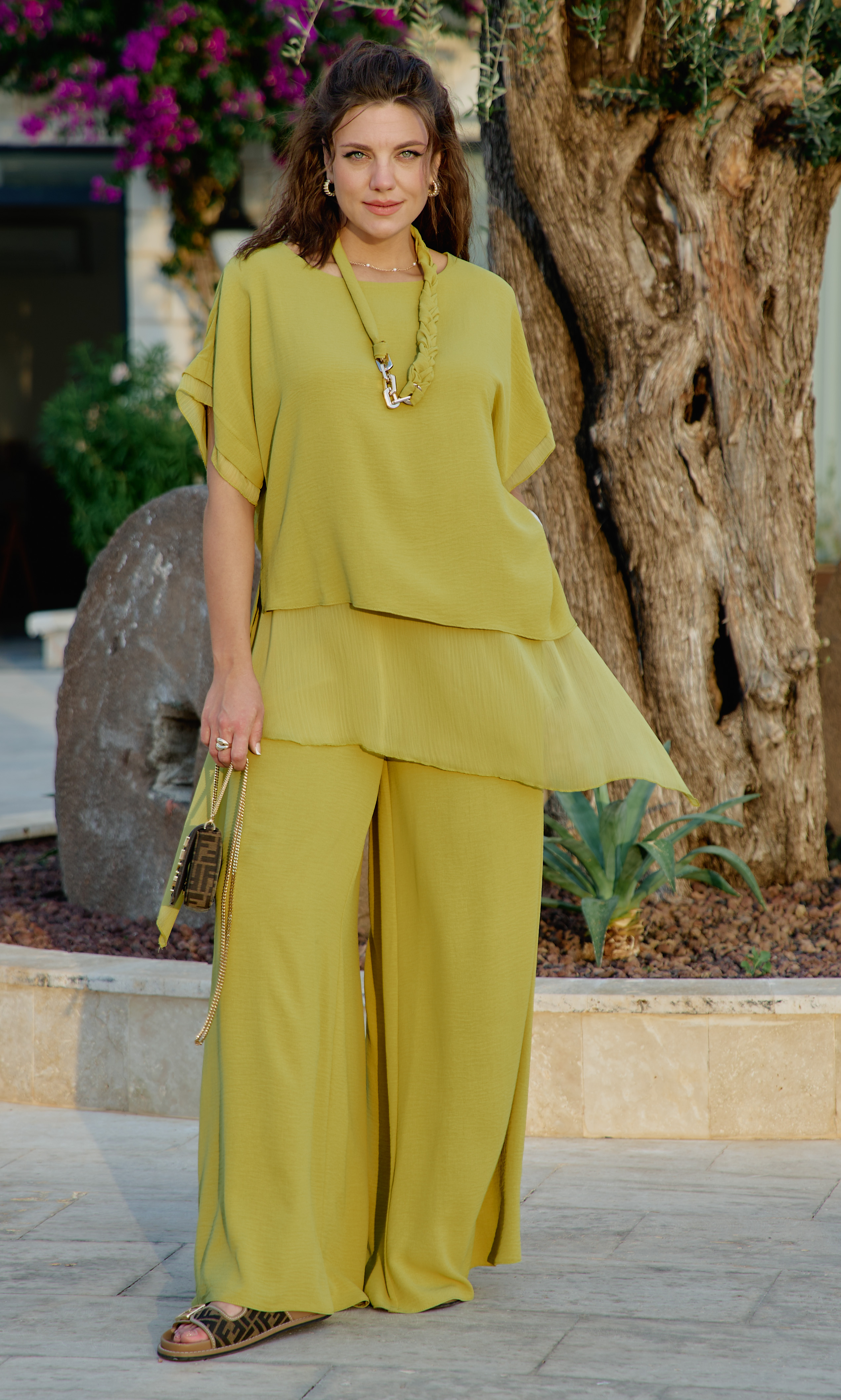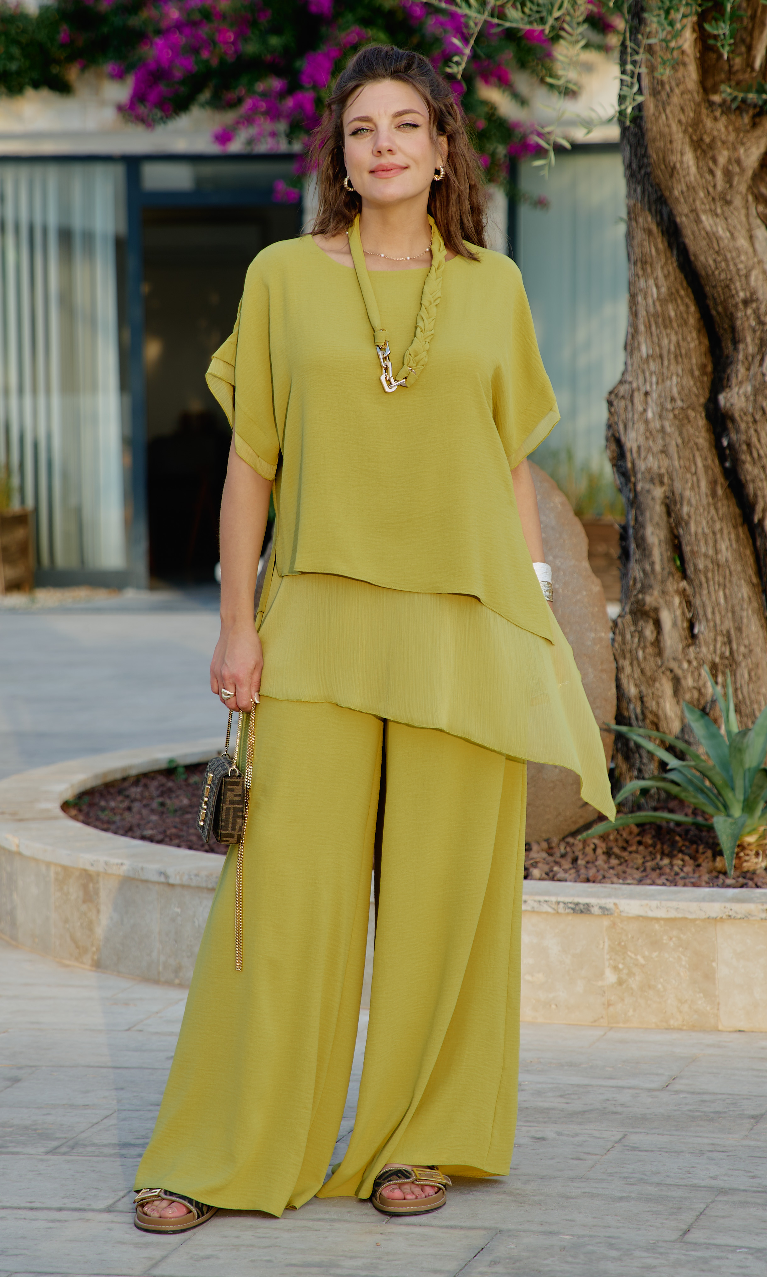 Состав: 100% полиэстер. Костюм женский, состоящий из блузы и брюк в ярком, насыщенном оттенке мгновенно поднимет настроение и привлечёт взгляды. Костюм, в котором комфортно гулять даже в самую жаркую погоду, идеален для путешествия, прогулок, а также отлично подойдёт для повседневных образов. В данной модели сочетается непринуждённость, элегантность и женственность, он становится идеальным выбором для женщины, стремящейся выразить свою индивидуальность. Блузка свободного силуэта, с округлой формой горловины, с двойной деталью переда и спинки. Низ в блузке ассиметричный с разрезами в боковых швах. К нижнему, второму слою блузки притачивается отлетная деталь из отделочной ткани с ассиметричным низом и разрезами в боковых швах. Рукав втачной, короткий, с притачным элементом из отделочной ткани по низу. Брюки свободного силуэта, широкие с притачным поясом на резинке для максимально удобной посадки на любой тип фигуры. По переду брюк наклонные карманы. В качестве дополнительного декоративного элемента в комплекте идёт дизайнерское украшение ручной работы. Обращаем Ваше внимание, что фурнитура может незначительно отличаться от фото. Длина блузки по спинке короткая 82 см, длинная 89 см, длина рукава 29,5 см (р 52-56), 31 см (р 58-62). Длина брюк 108 см.